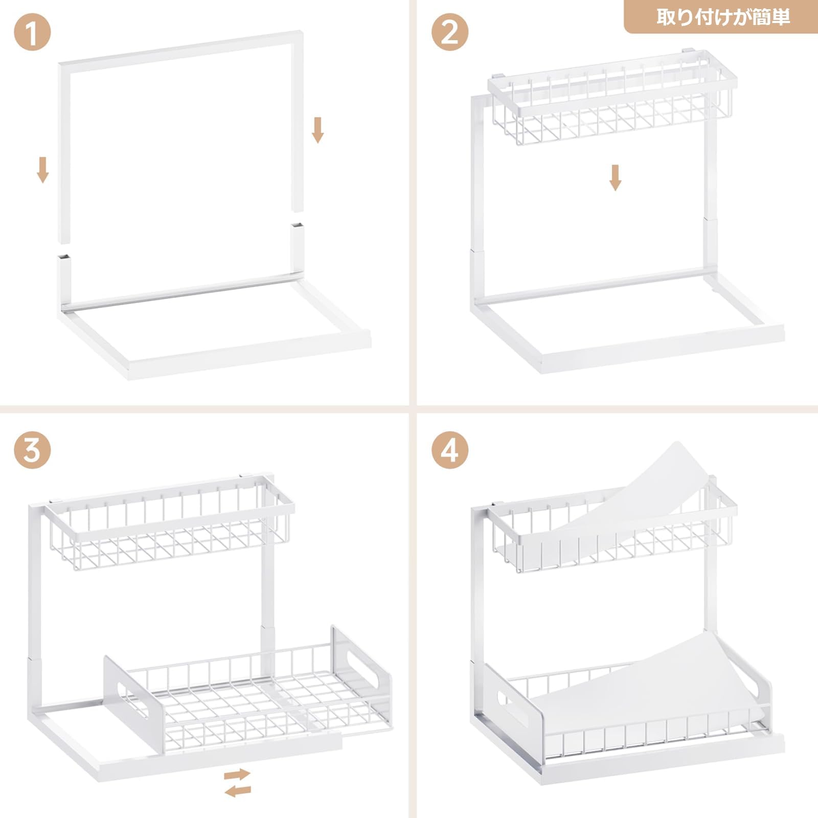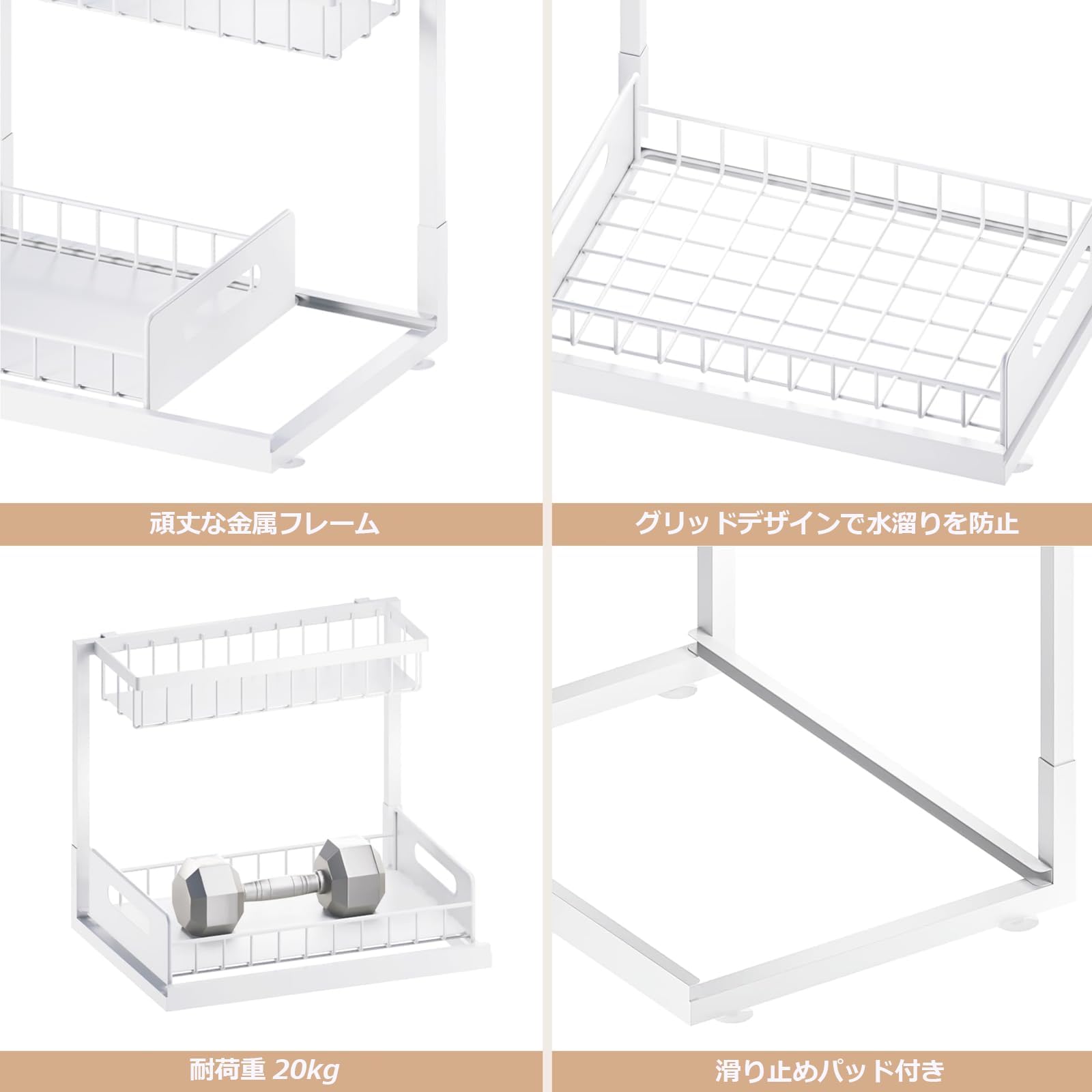 白しる 多機能 家庭用 キッチン 下水槽 引き出し式 収納ラック 穴あけ不要 金属 物置きラック バルコニー ベッドルーム