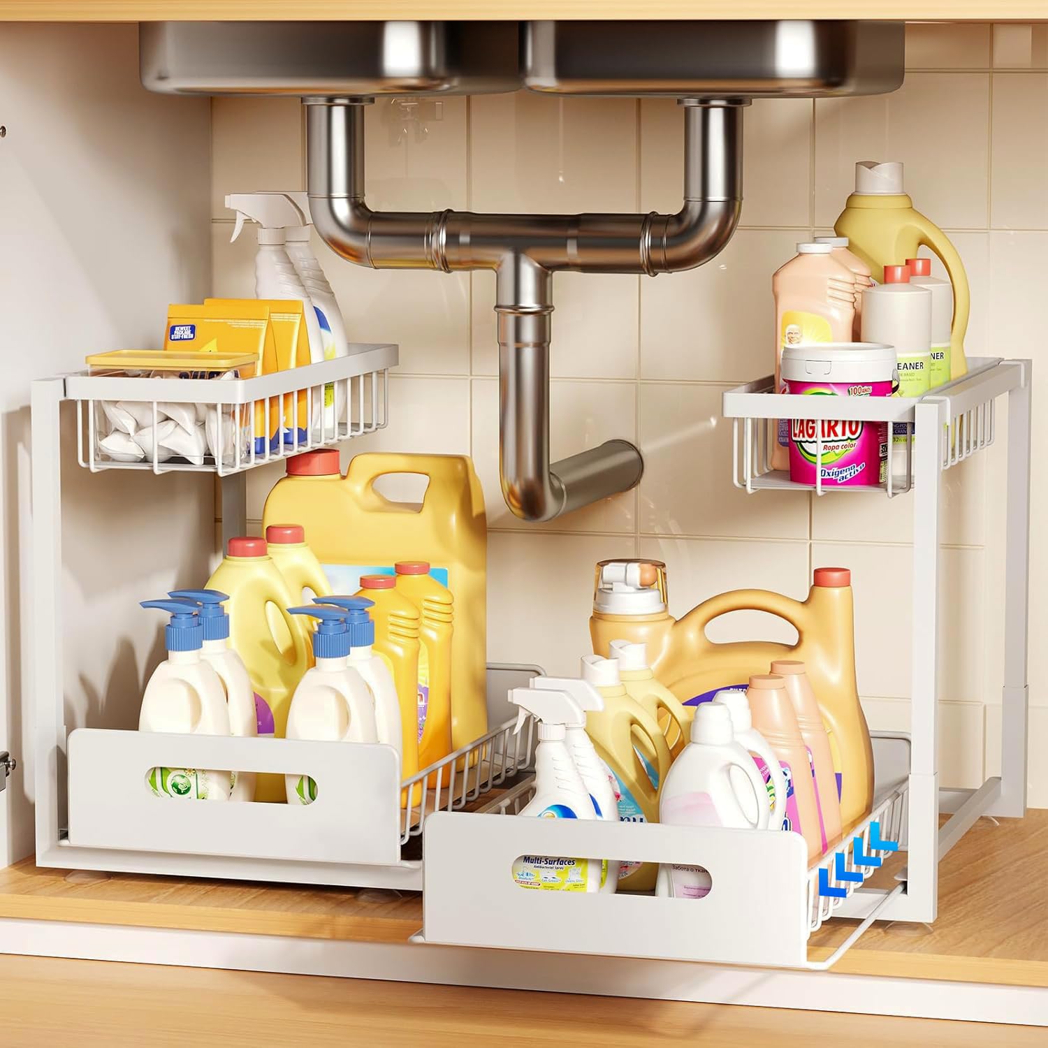 yazi【2個セット 】シンク下収納 スライドトレー キッチン収納引き出し レール付き引き出し収納 伸縮式収納バスケット 穴開け不要 幅48cmまで調整 シンクした収納 キッチンラック 台所・洗面台下 キッチン下収納棚 耐荷重25KG (ホワイト)