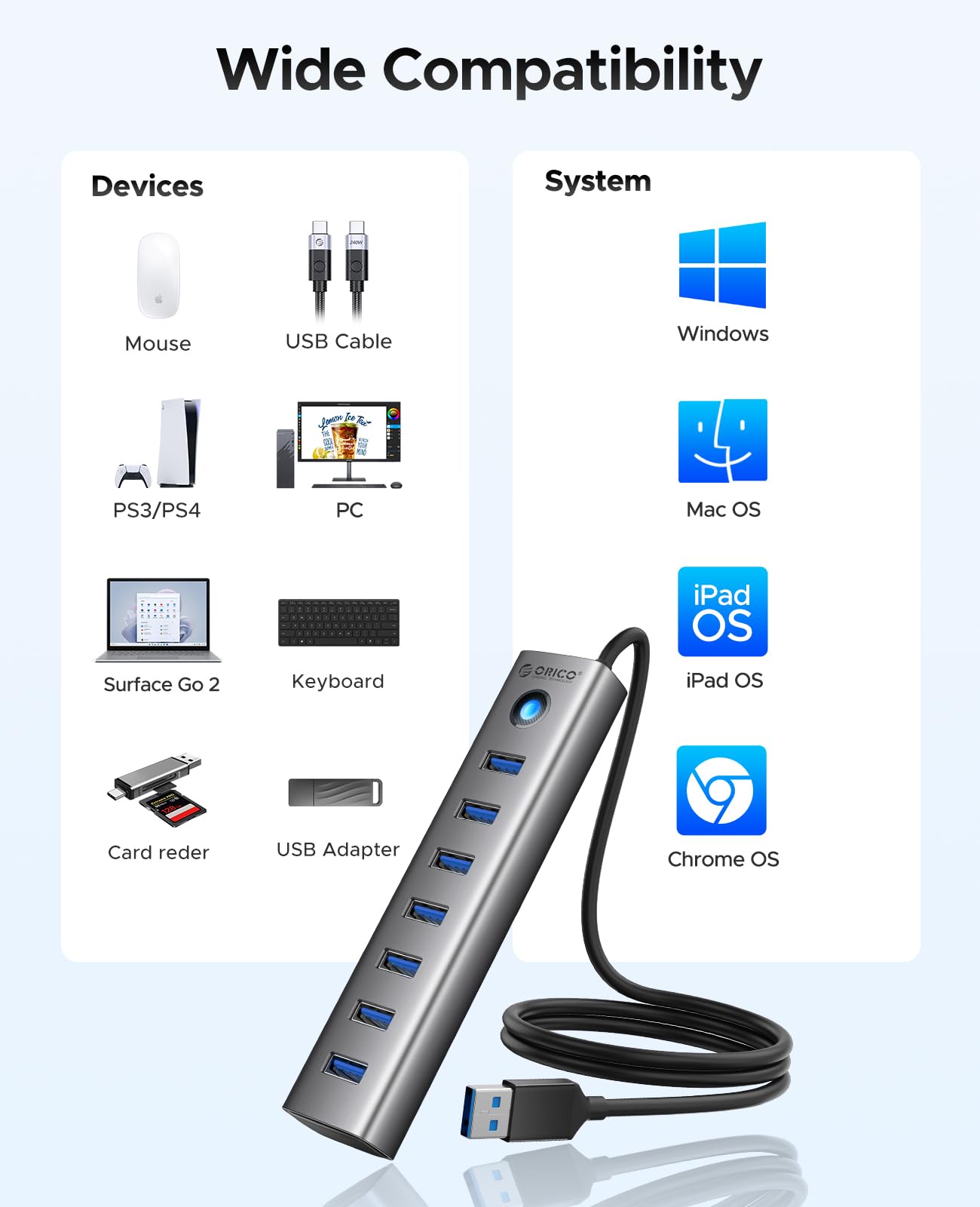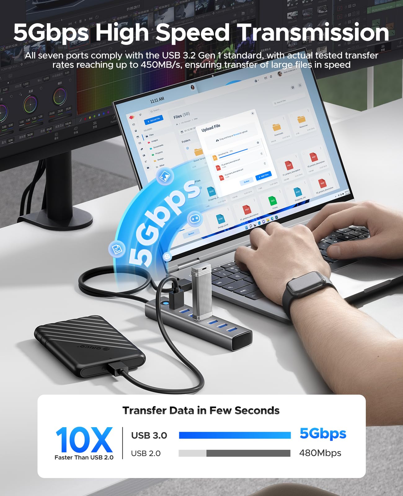 ORICO USBハブ 7ポート3.0ハブ アルミニウムマルチポートアダプタ 5Gbpsデータ転送 5V 3A Type-Cポートスプリッタ PCラップトップMacBook PS5/ポータブルハードドライブ/マウス/USBファンなど