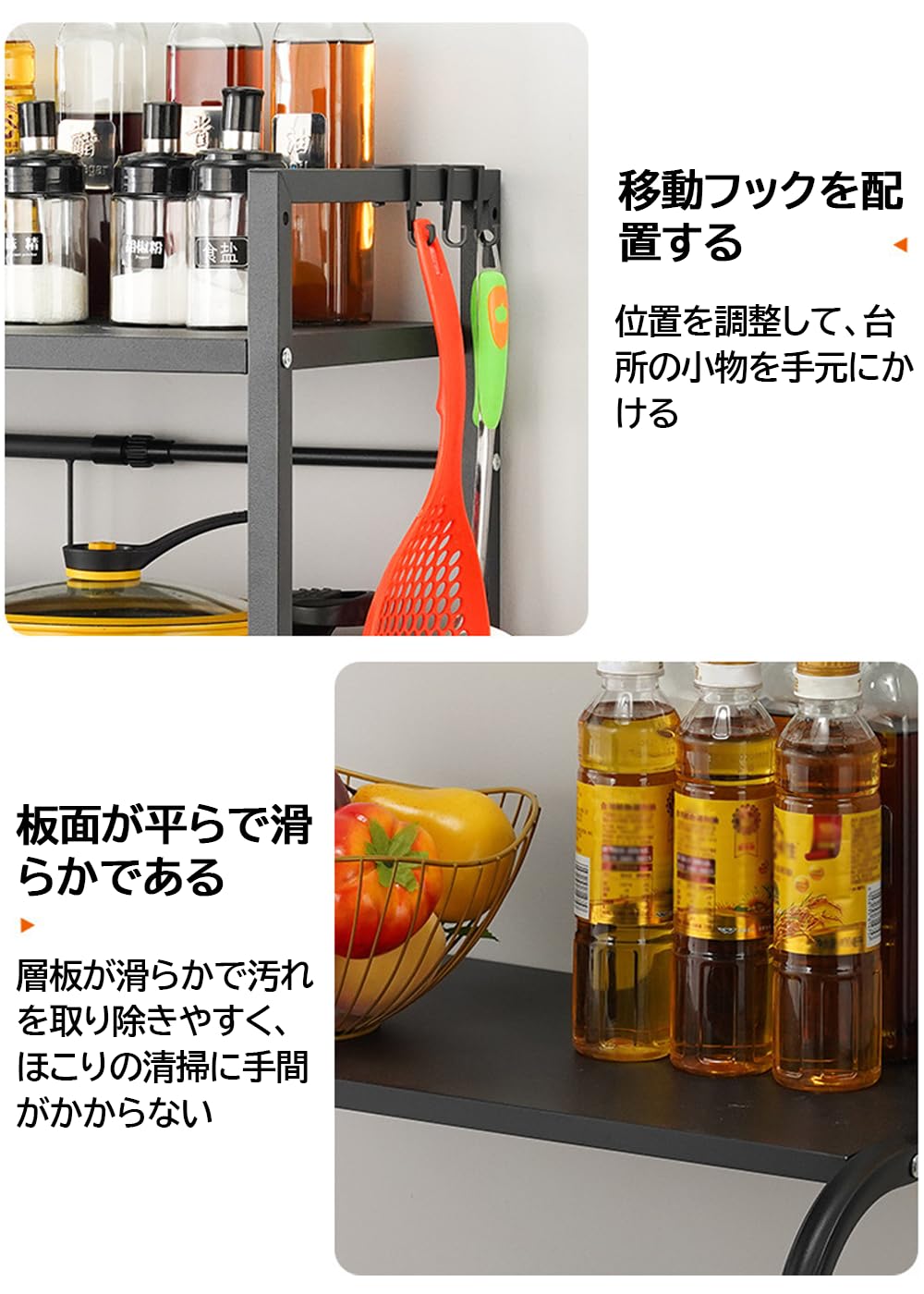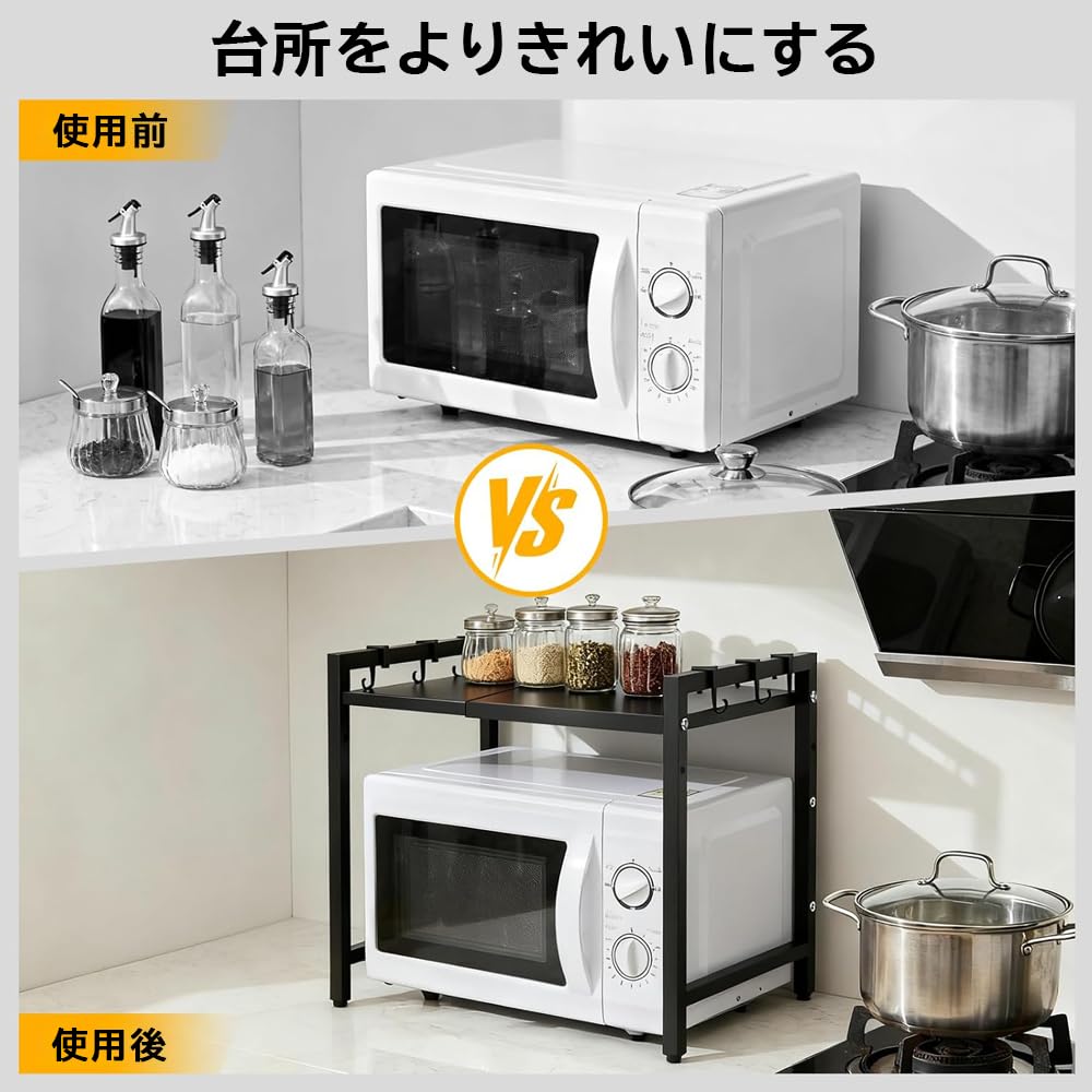 電子レンジ周りの収納にお困りなら、この伸縮ラックが解決! 奥行も幅も自在に調節でき、ぴったりサイズに。 耐荷重設計で家電も安心置き。 フック付きで小物もすっきり整理。