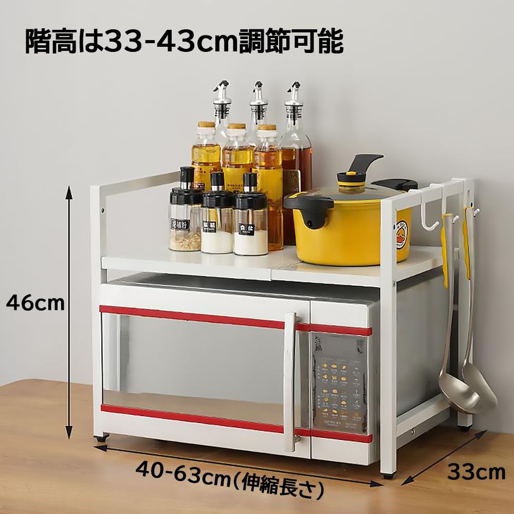 YFFSFDC レンジ上ラック レンジ置き台 伸縮式 幅36-65cm 耐荷重50kg 棚高さ調節可 トースターラック キッチン収納 フック4個付き スリム設計 (ホワイト)