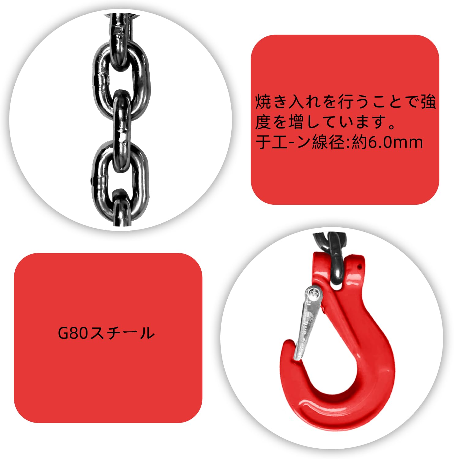 4本吊チェーン スリングりスリングチェーン チェーンフック 1.5M吊りチェーン 耐荷重4T 径6MM スリング スリングフックタイプ吊りベルト 吊りクランプ 吊り具チェーン フック付き チェーンフック吊り私たちのチェーンスリングは、最大4トンの荷重に対応できる高強度な設計で、重い荷物や大型設備の吊り作業に最適です。チェーンは高耐久性のある合金鋼製で、長期間の使用にも耐えることができます。安全性と効率を兼ね備えた設計で、作業をスムーズに進めることができます。主な特徴:強力な荷重対応:このチェーンスリングは最大4トンの荷重に対応可能で、工場や建設現場での重い荷物の吊り作業に最適です。高強度のチェーンが作業の安定性を支えます。 簡単に長さ調整可能:長さを自由に調整できるチェーンスリングは、用途に応じて最適な長さで使用できます。吊りクランプとの併用でさらに精密な吊り作業が可能になります。 高強度合金鋼製フック:フック数は4つで、すべてが高強度合金鋼製で作られています。重い荷物を安定して吊ることができ、スリングチェーンとして高い信頼性を誇ります。 多用途に対応:このチェーンスリングは、工場での設備設置や建設現場での吊り作業はもちろん、船舶や物流業界にも対応可能です。幅広い作業シーンで活躍します。 錆防止機能と長寿命:表面オイル処理が施されたチェーンは錆を防止し、長期間にわたって安定した性能を提供します。作業後のメンテナンスも簡単で、吊りベルトとして長期間使用できます。このチェーンスリングを使用することで、安全性と作業効率を大幅に向上させることができます。重い荷物を持ち上げる作業から、精密な吊り作業まで、さまざまなシーンで大活躍します。【注意事項】最大使用荷重を超える吊り荷は絶対に吊らないでください。安全性を確保するため、常に規定の負荷範囲内でご使用ください。【注意事項】最大使用荷重を超える吊り荷は絶対に吊らないでください。安全性を確保するため、常に規定の負荷範囲内でご使用ください。