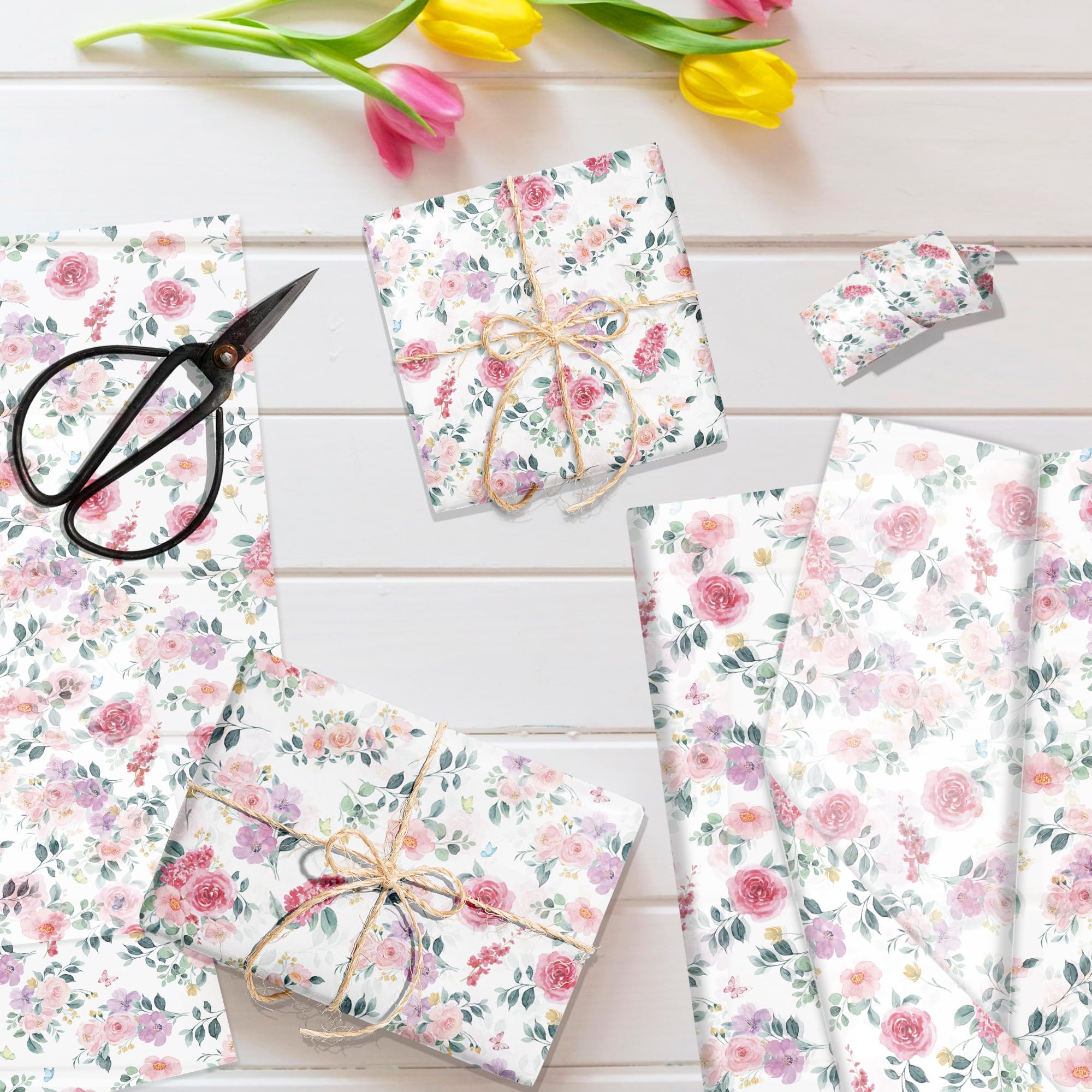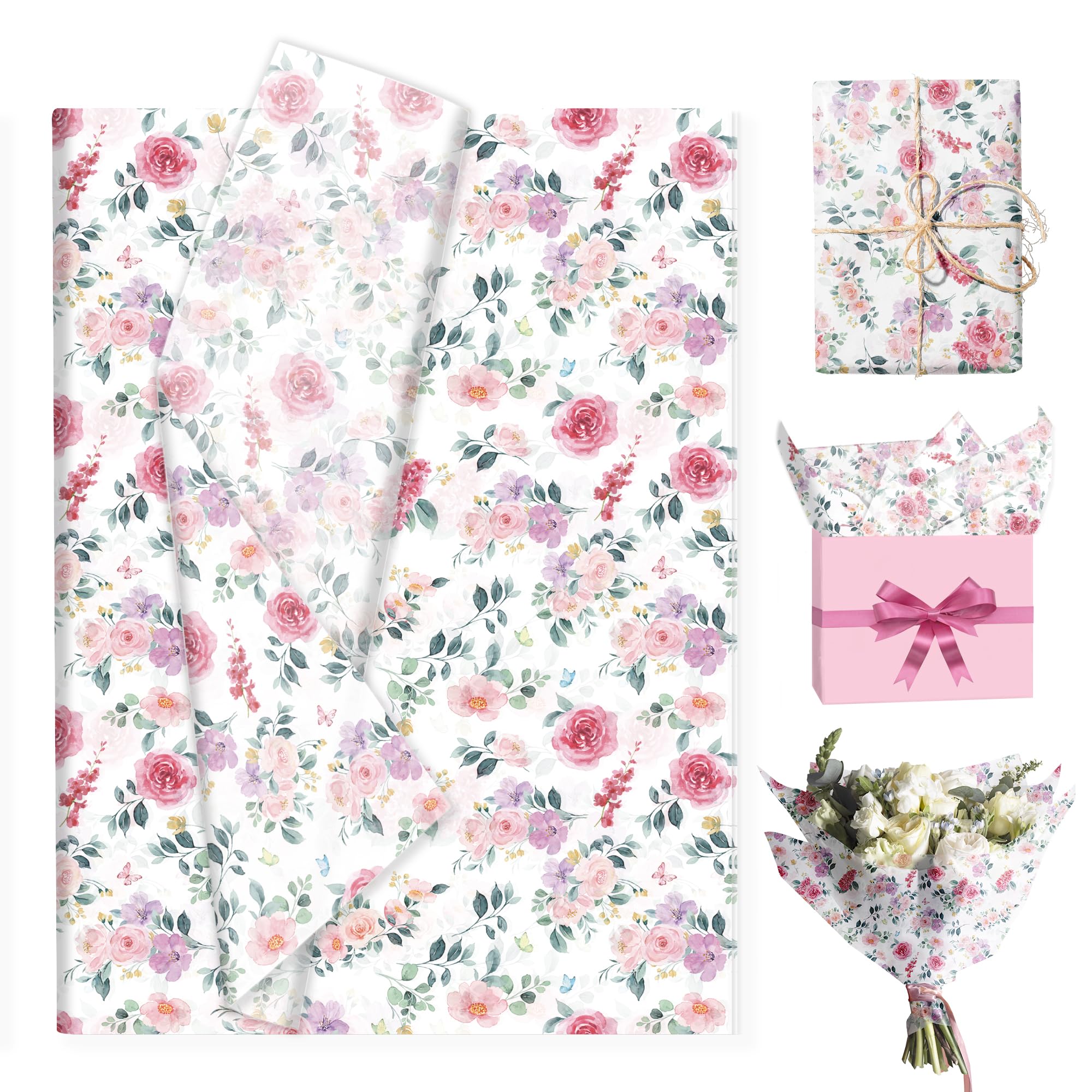 水彩花卉薄葉紙 100枚、花柄ギフトキャンディ包装紙、手作りのアート誕生日・結婚式の引き出物用包装紙、サイズ:13.8 x 19.7 インチ