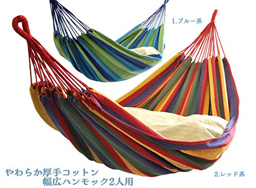 ハンモック2人用 ベッド部:長さ約190×150cm ブルー系マルチカラーストライプ (ブルー系)