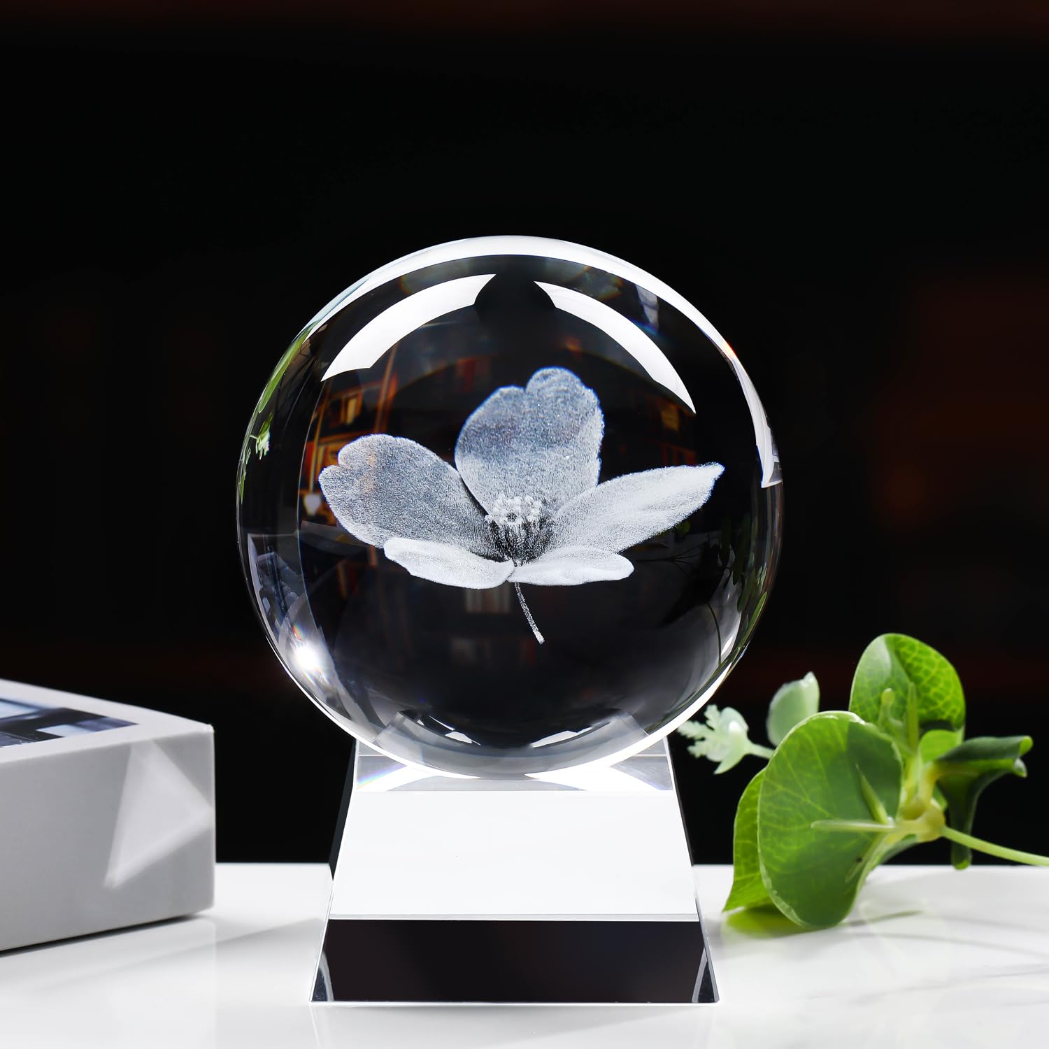 Pleadeliy 癒しのクリスタル 水晶玉 K9クリスタルボール 内部彫刻 百合の花束 祈念・ペット供養 インテリア・写真撮影小物 ギフトボックス クロス カード付き