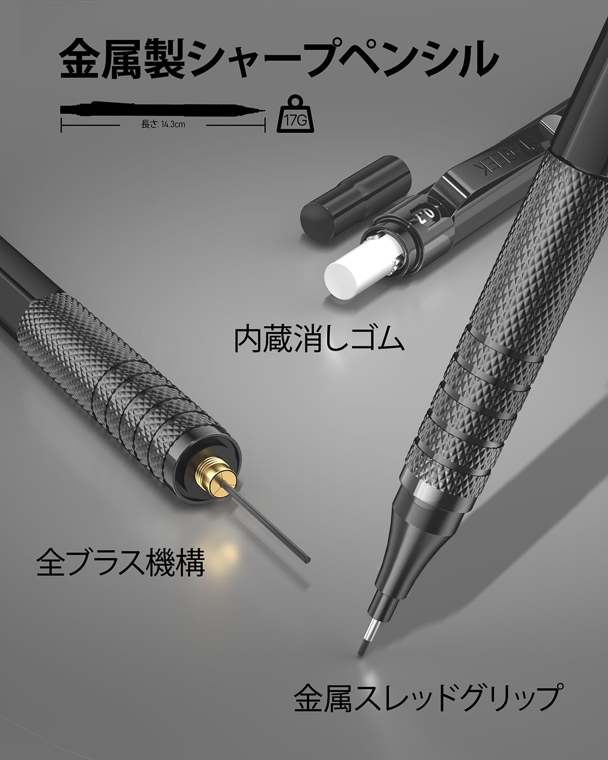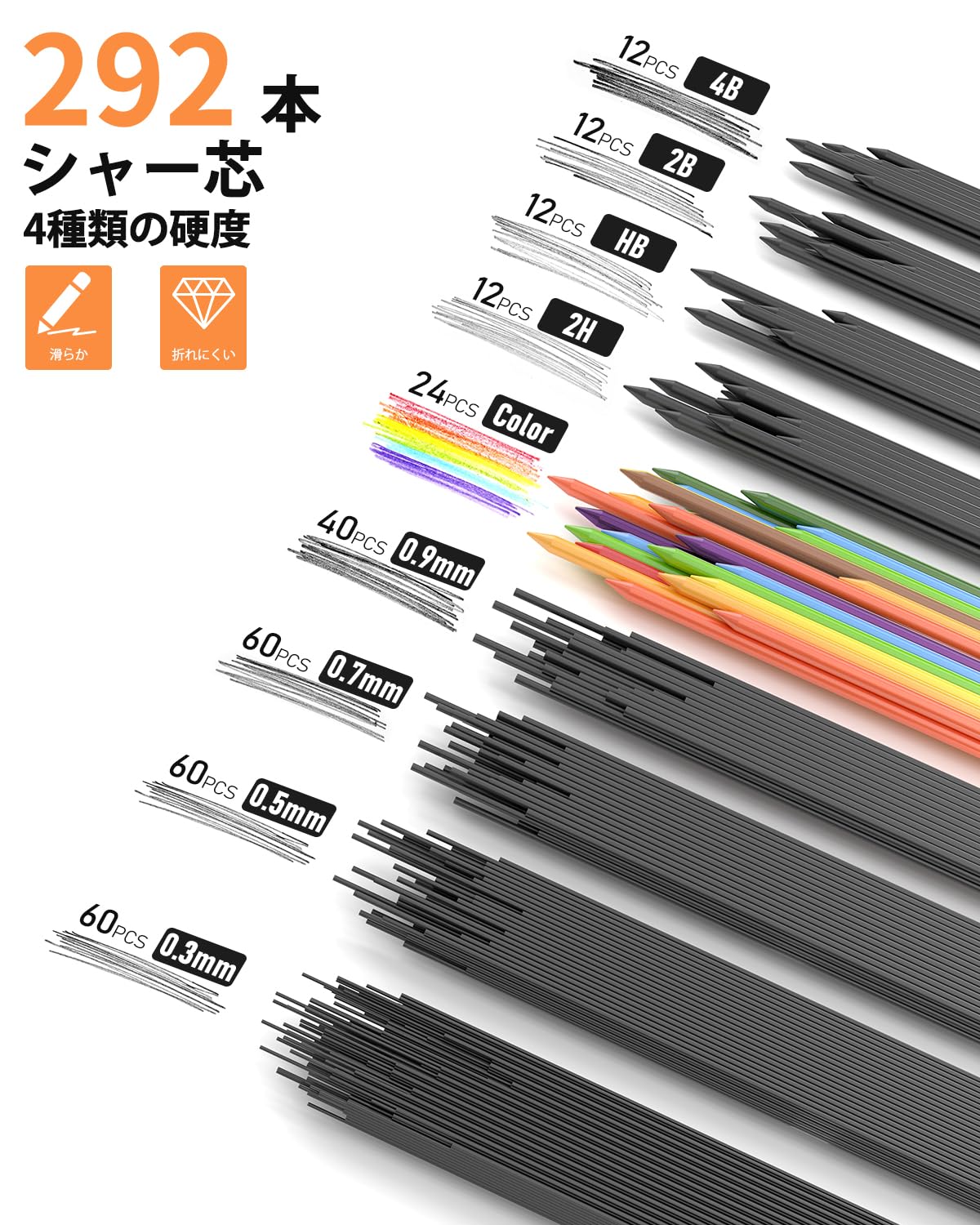 Four Candies 金属製シャープペンシル セット 0.5mm、0.7mm、0.9mm 各1本 & 2mm 2本 420本入りシャー芯(4B、2B、HB、2H、カラー) アート 製図 スケッチ 文房具セット ブラック