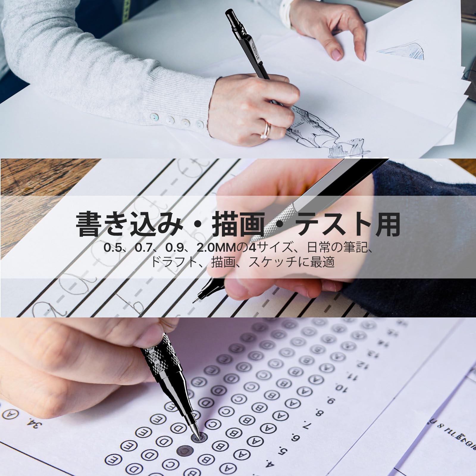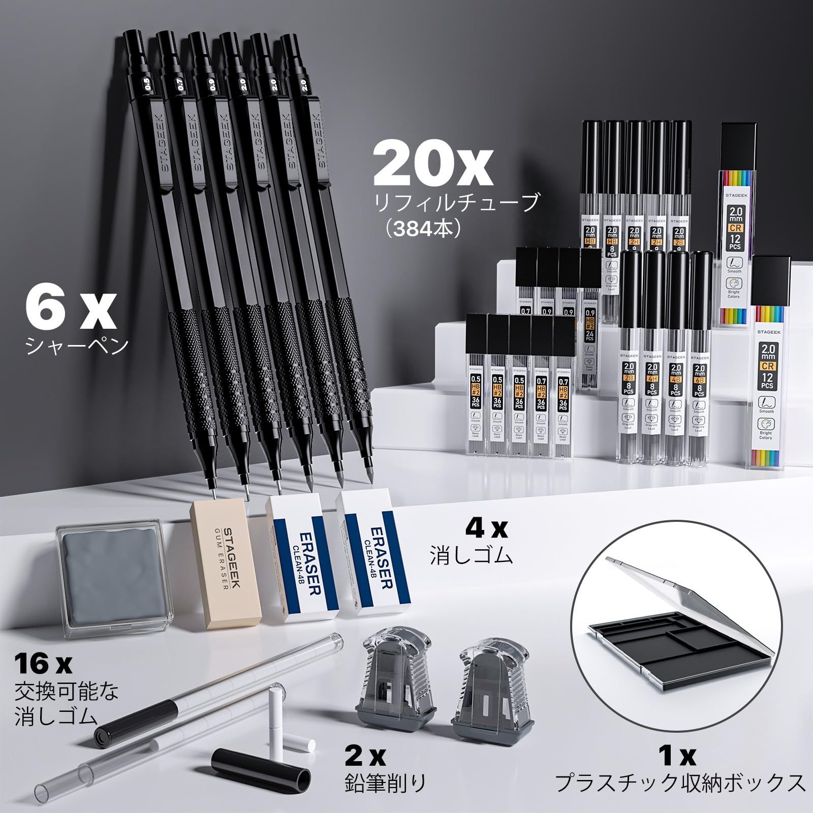 STAGEEK 6本入りアートメタルシャープペンシルセット、アートドラフティングペンシル3本(0.5、0.7、0.9MM)&メカニカルドローイングペンシル3本(2MM)、384本の芯(6B、4B、2B、HB、2H、4H、カラー)付き、筆記、スケッチ、描画用、ブラック