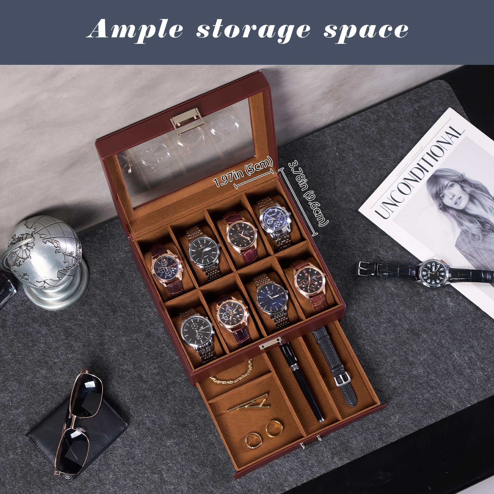 ProCase メンズウオッチボックス、引き出し付き3スロット腕時計ディスプレイケース、ガラス蓋付きメンズ腕時計ケース、2層ジュエリー収納ホルダーオーガナイザー