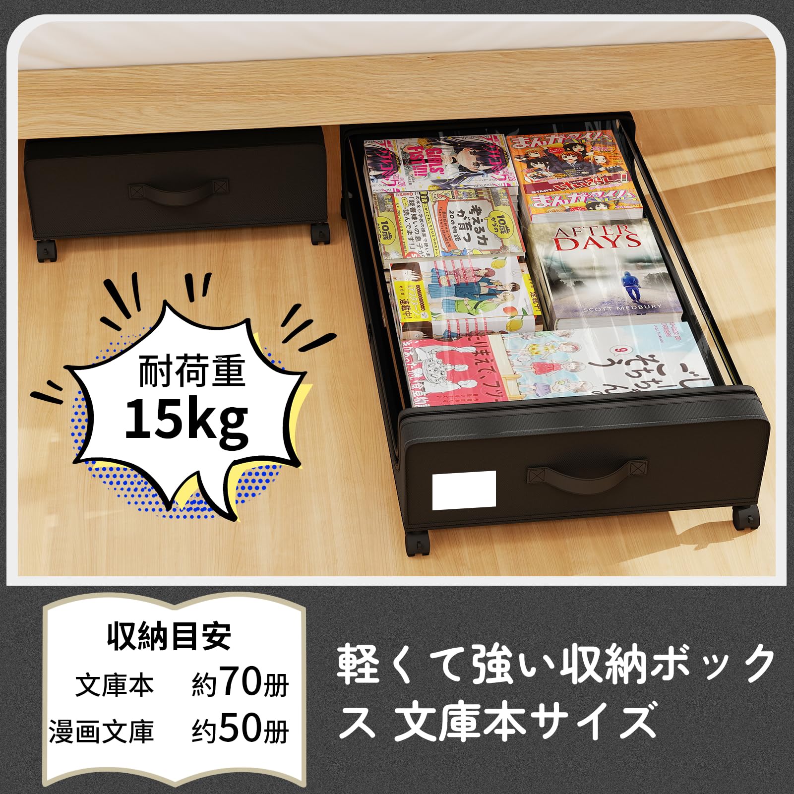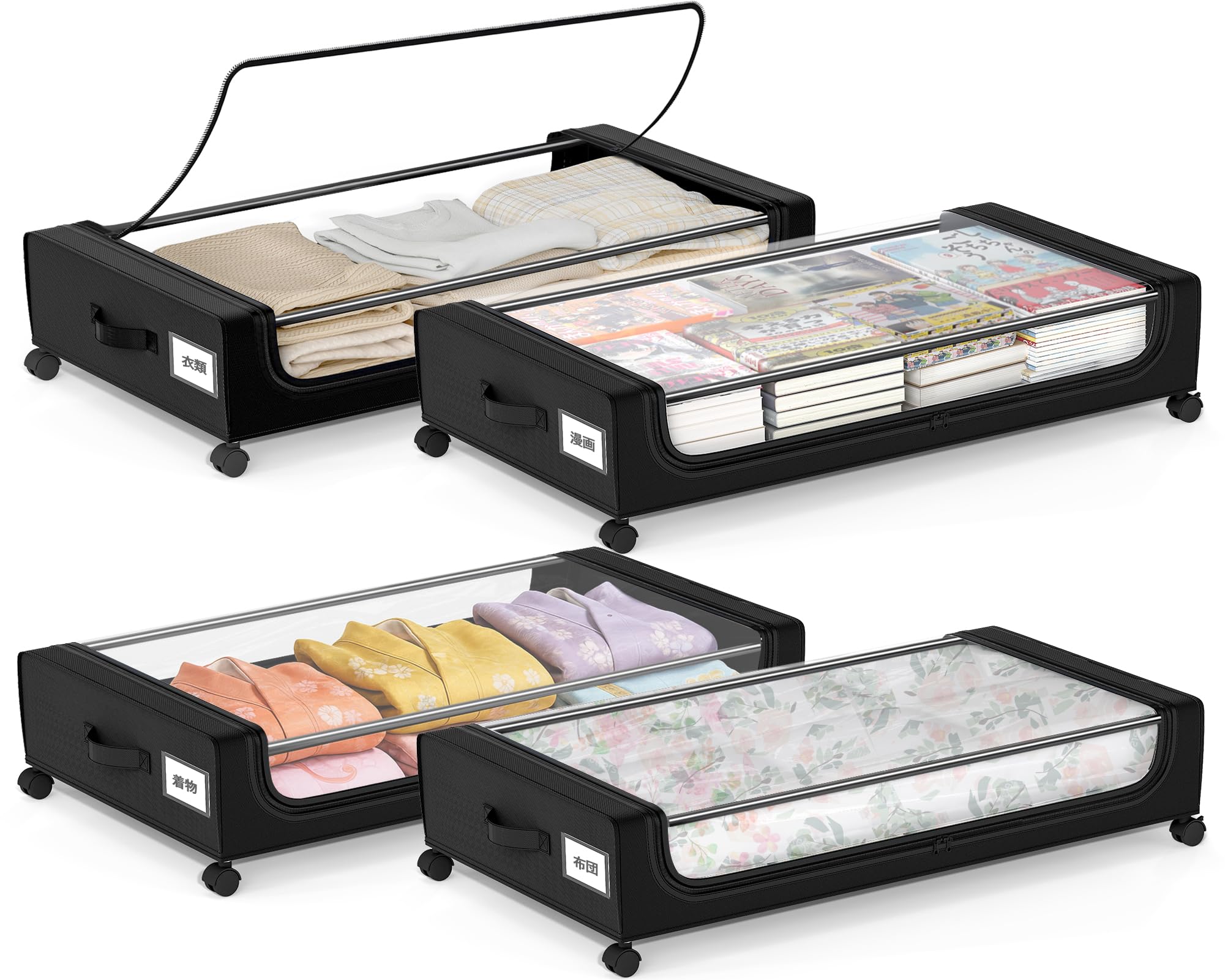 FJANS ベッド下収納 キャスター付き: ベッドした収納 キャスター付き| 衣類 漫画 着物 布団 収納ケース | 収納ボックスは耐久性のあるオックスフォード布で作られており 透明な蓋が付いているので 衣類をほこりや汚れから効果的に保護します (サイズ78x43x17cm)(ブラック 4個セット)