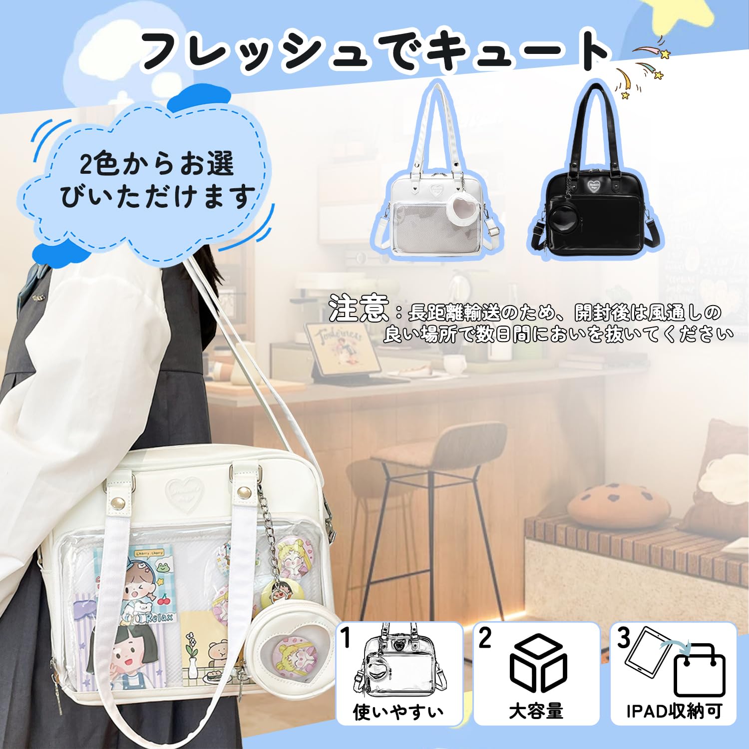 [NEWHEY] 痛バッグ 痛バ 大容量 大きい トートバッグ レディース フリル A3 A4 撥水 推し活バッグ うちわが入る デコバッグ メッシュデコシート付き 推し活 イベント オタ活 ホワイト
