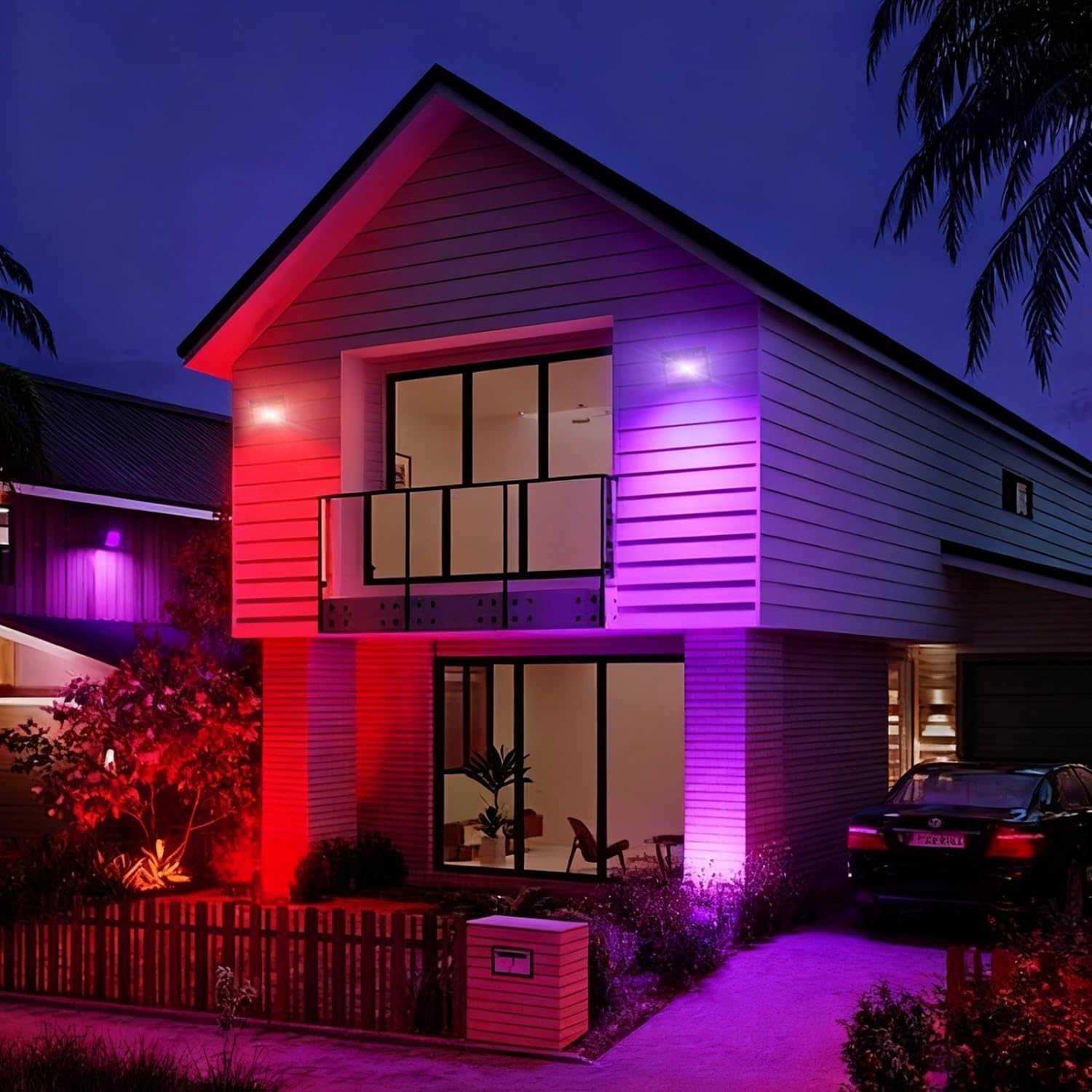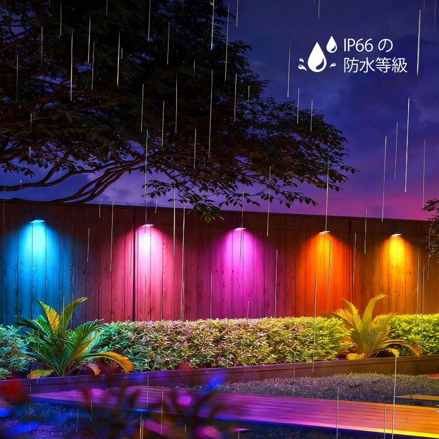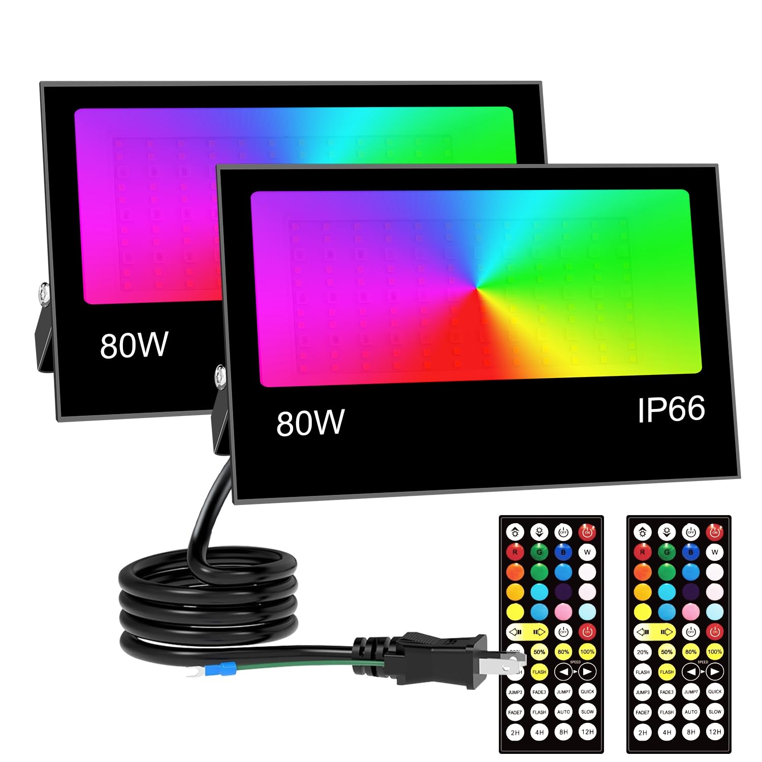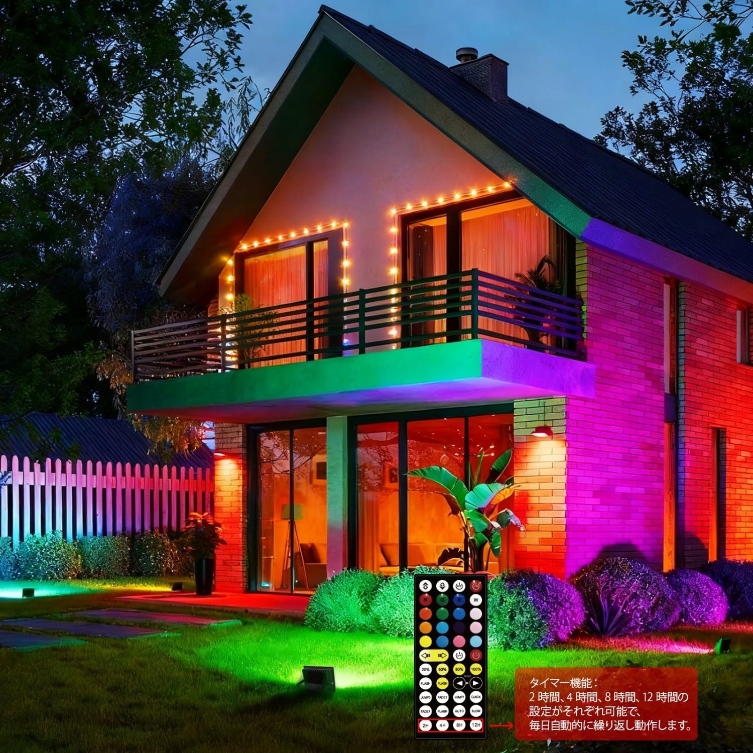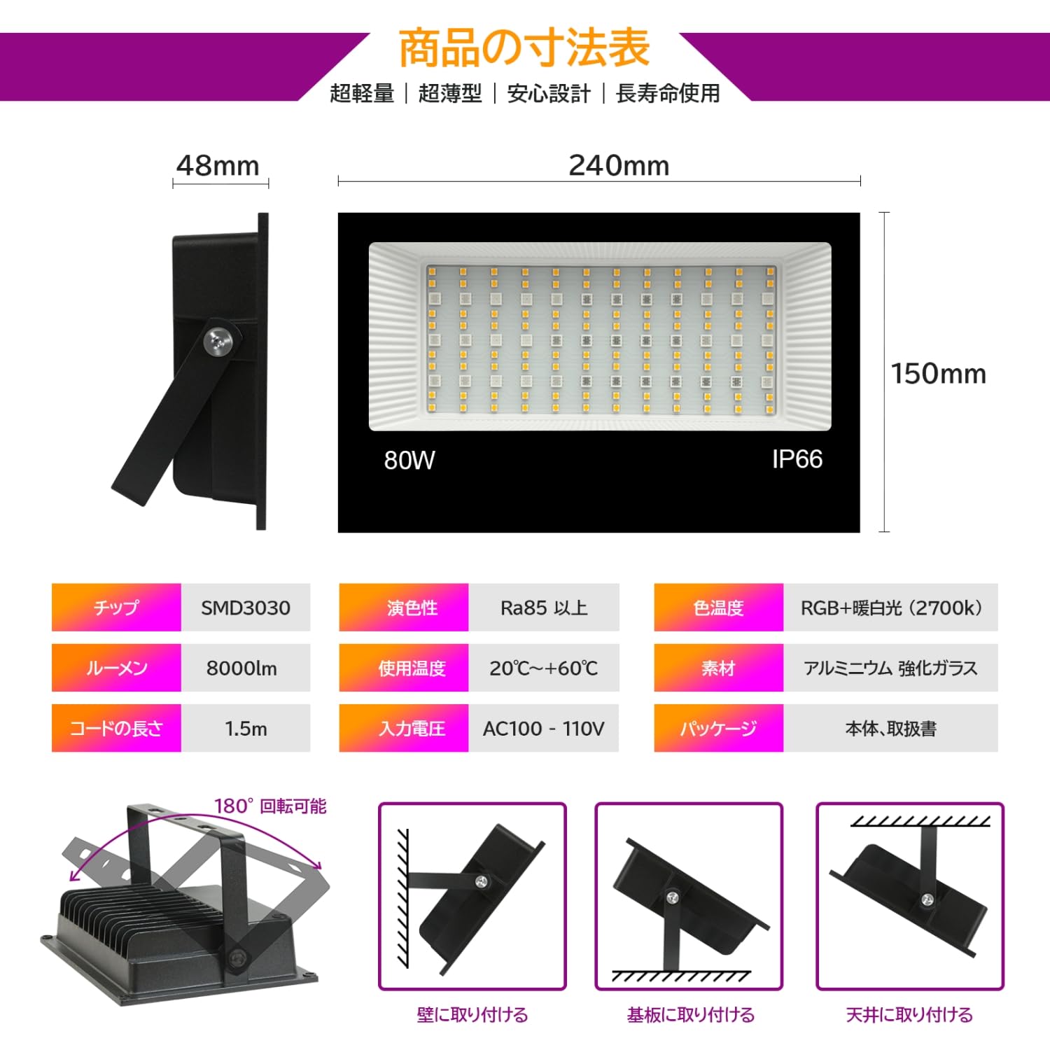 80W RGB 投光器 カラーライト フラッドライト RGB + 2700K 暖色光照明 8000lm 祝日雰囲気と日常照明兼用 IP66 防水 調光可能 16 種カラー 8 種モード 4 つタイマー 100V 50/60Hz PSE 認証済 日本語説明書