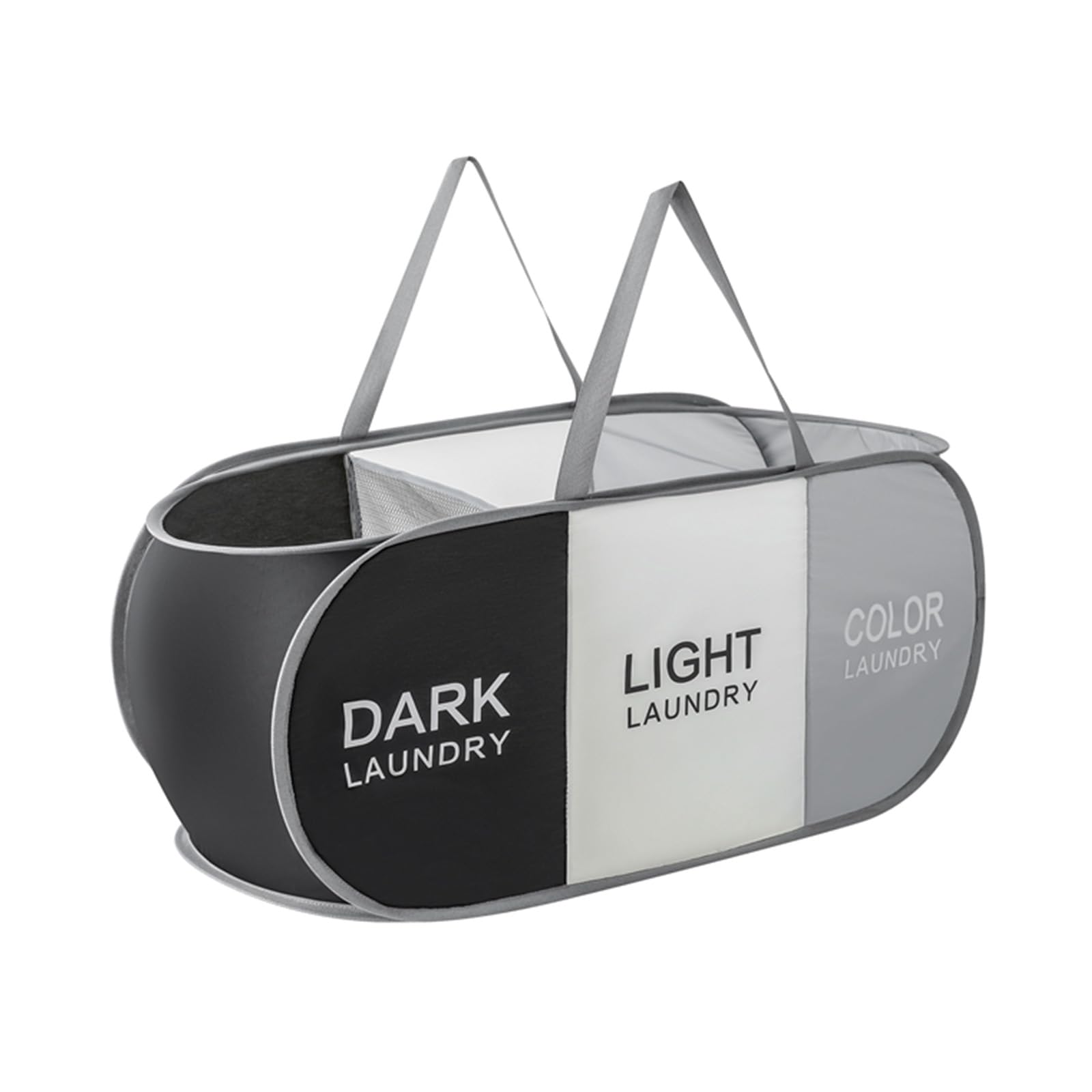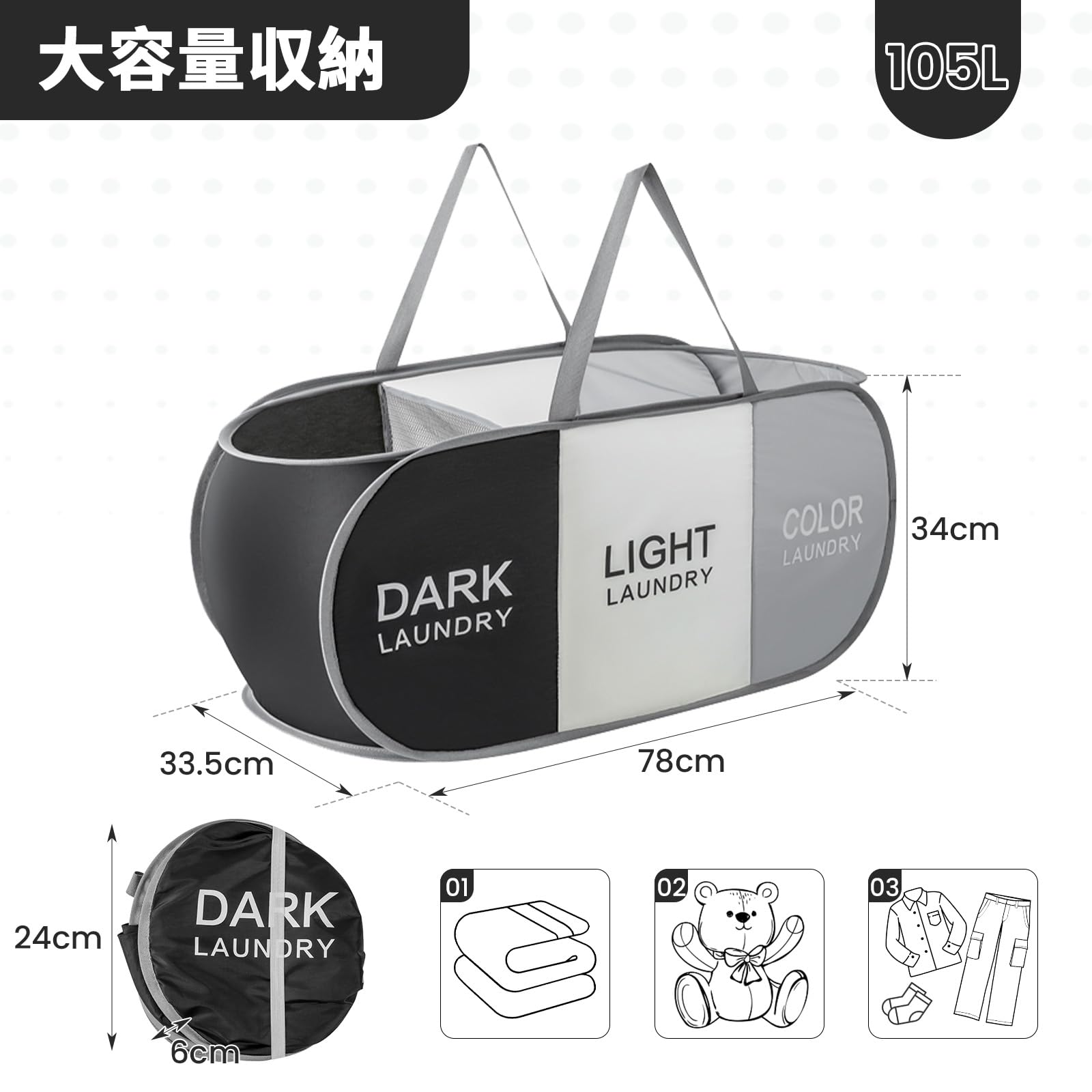 TECHMILLY ランドリーバスケット 横型 折りたたみ 洗濯カゴ 大容量 75L 3分割 ランドリーバッグ 取っ手付き バスルーム 洗濯物入れ 軽量 旅行 ランドリー収納 ゴミ箱 長さ78cm×幅さ33.5cm×高さ34cm(ベージュ+グレー+ブラック、1PCS)