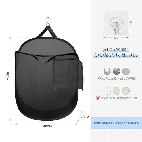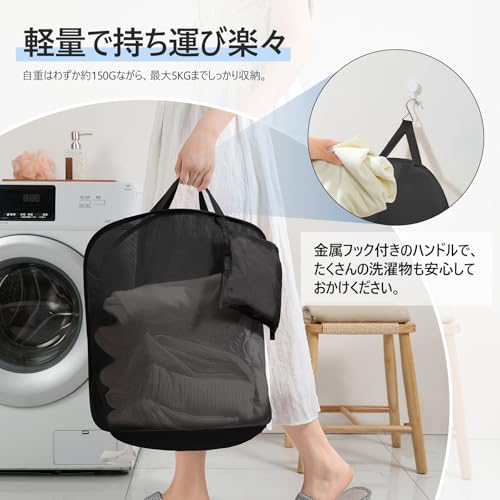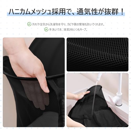 TECHMILLY ランドリーバスケット 壁掛け 洗濯かご 大容量 自立 ランドリーバッグ メッシュ 省スペース 収納 洗濯物 袋 かご 持ち運び可能 軽量 旅行 ゴミ箱 幅さ40CM長さ20CM高さ53CM (ブラック、1PCS)