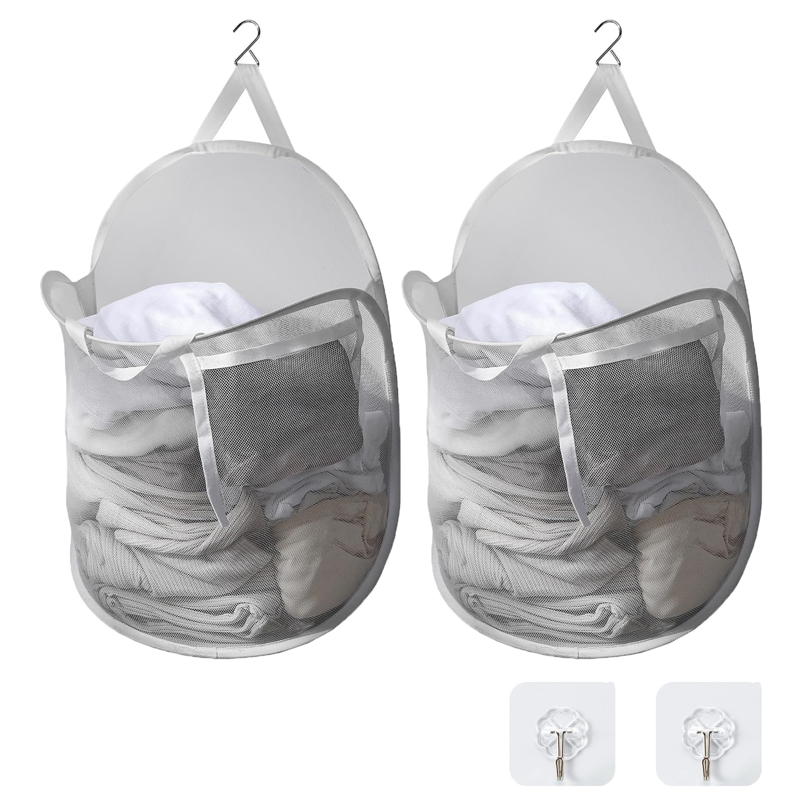 TECHMILLY ランドリーバスケット 壁掛け 洗濯かご 大容量 自立 ランドリーバッグ メッシュ 省スペース 収納 洗濯物 袋 かご 持ち運び可能 軽量 旅行 ゴミ箱 幅さ40CM長さ20CM高さ53CM (グレー、2PCS)