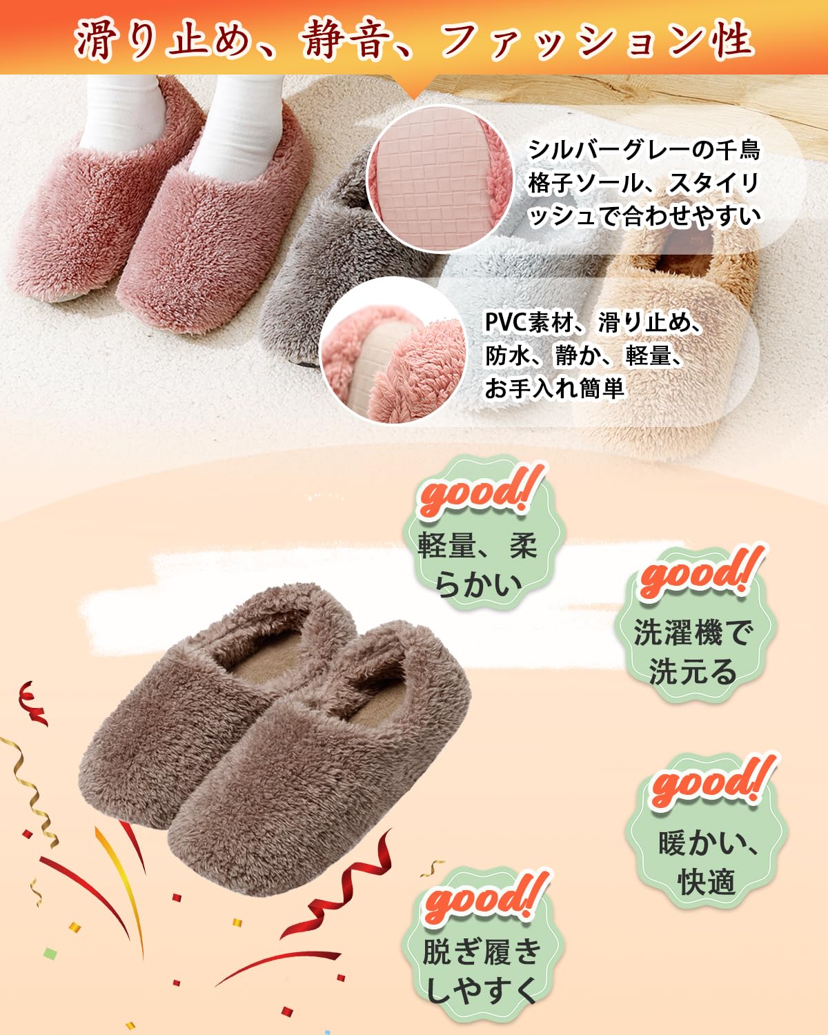 [Rilobi] [フットコーディネーターの推奨]モコモコスリッパ 室内履き 北欧 冬用 ルームシューズ 冬 滑り止め 静音 スリッパ 冬 足冷え対策 洗える 男女兼用