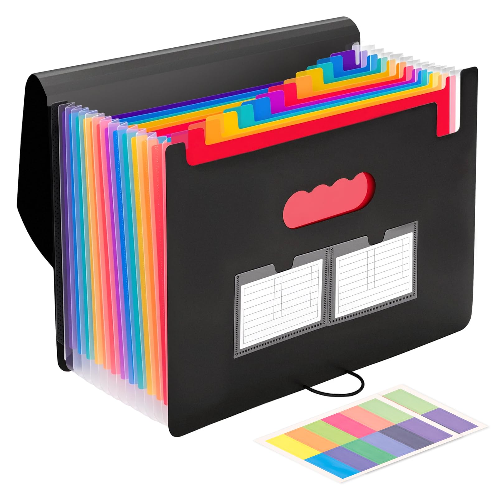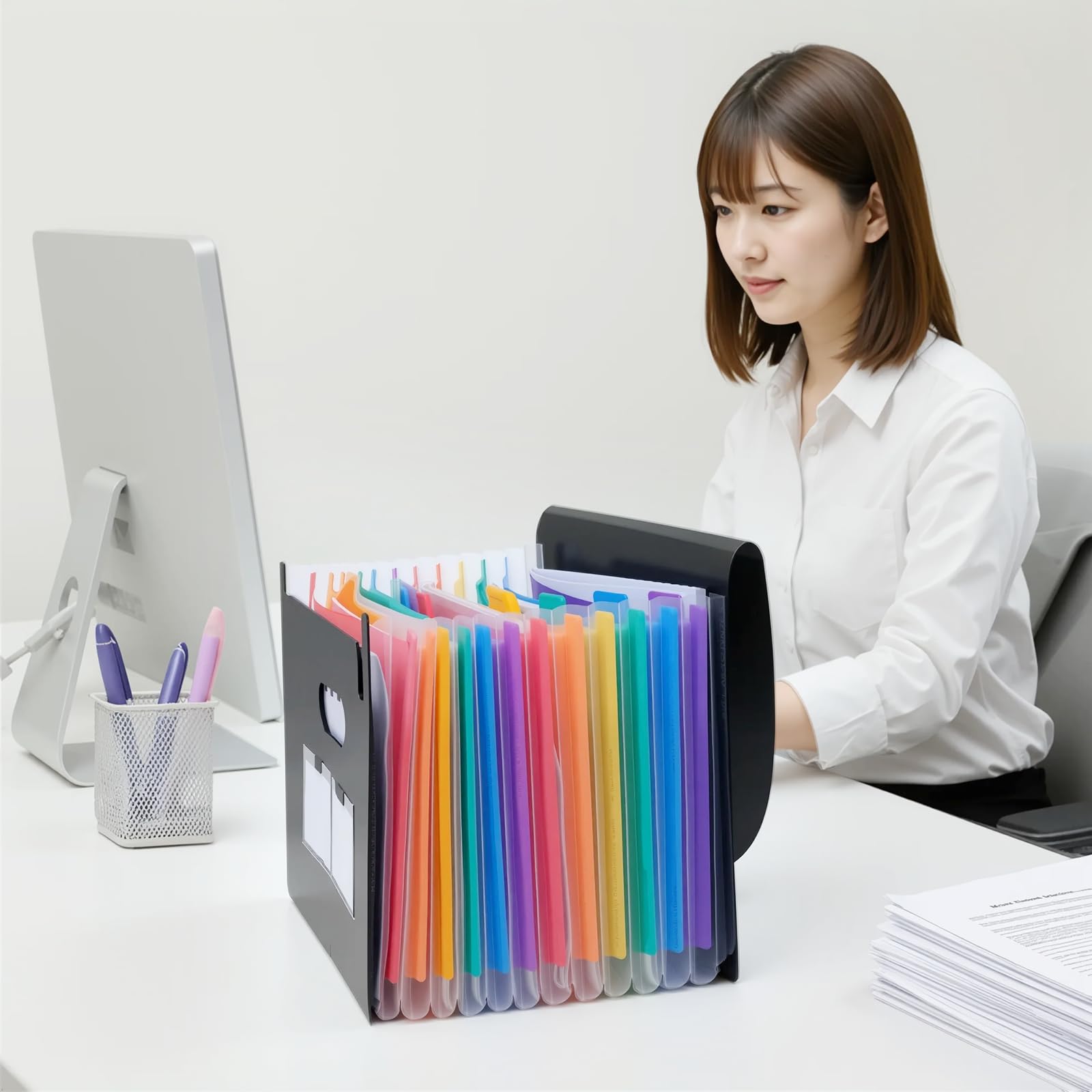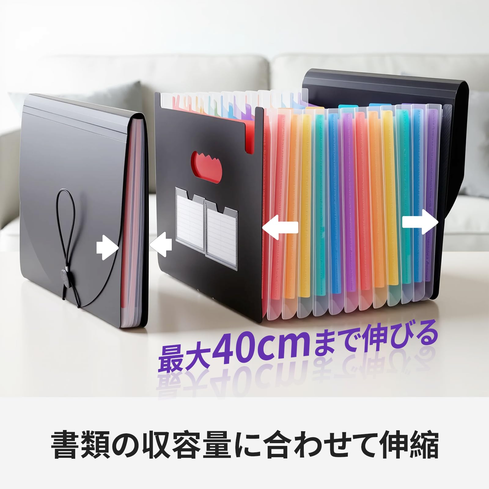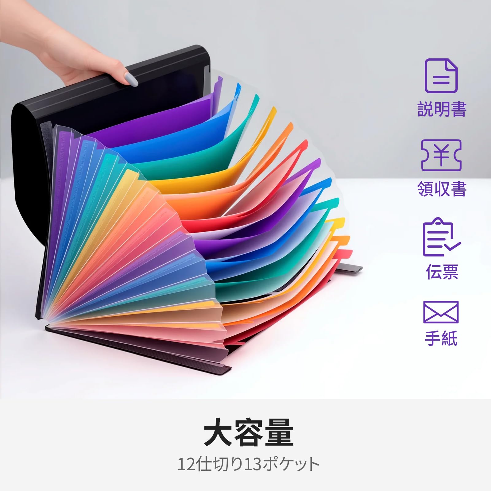 JEFURE ドキュメントスタンド A4 蓋付き 13ポケット 大容量 ジャバラファイル 自立式蛇腹 アコーディオンファイル 色別ファイリング 伸縮可能 書類整理ケース 仕分け オフィス 家庭 学校用(ブラック)