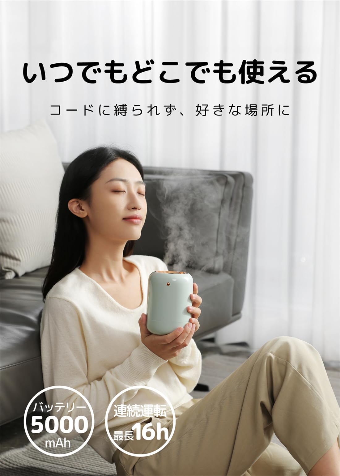 YFYunDlldu 超音波加湿器 2200mAh大容量電池 車載対応 580mlタンク 7色ムードライト 60ml/h高速噴霧 2モード切替 コンパクト 充電式 小型加湿器ホワイト