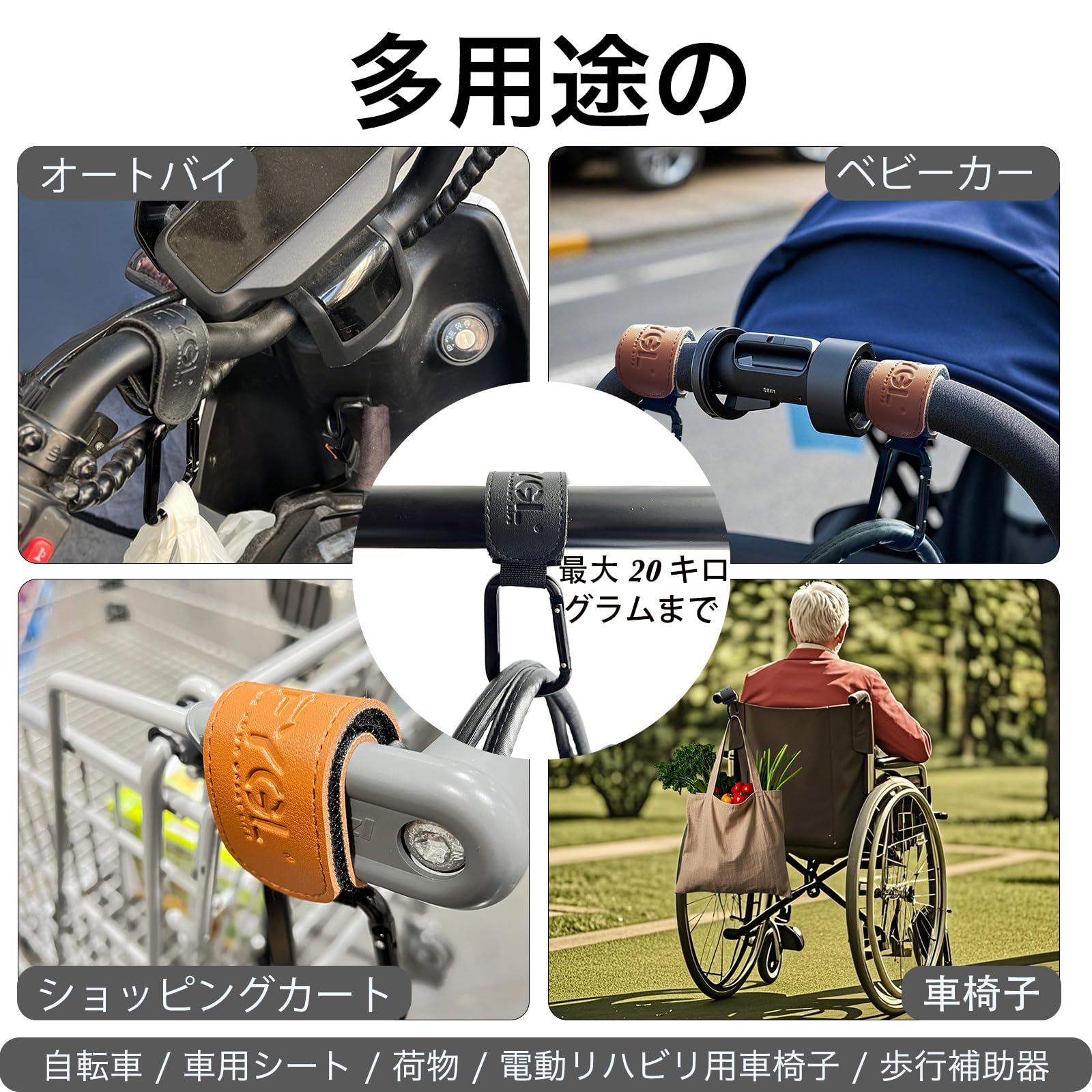 ベビーカー フック 荷物フック 2個セット ブラック 360度回転カラビナロックフック 多機能フック 車用 フックマジックテープ式 調節可能な サイズ 滑り止め 丈夫 耐荷重30kg