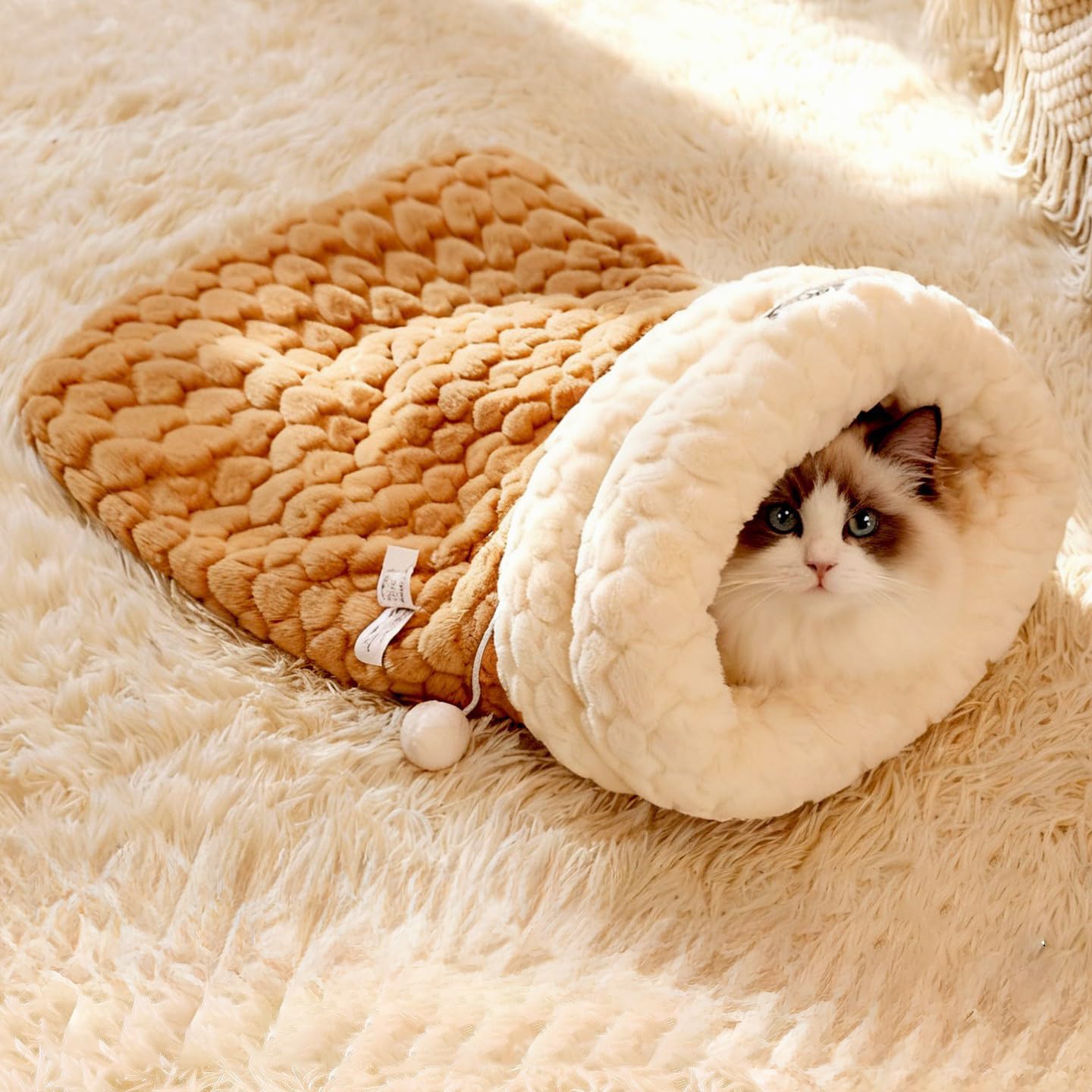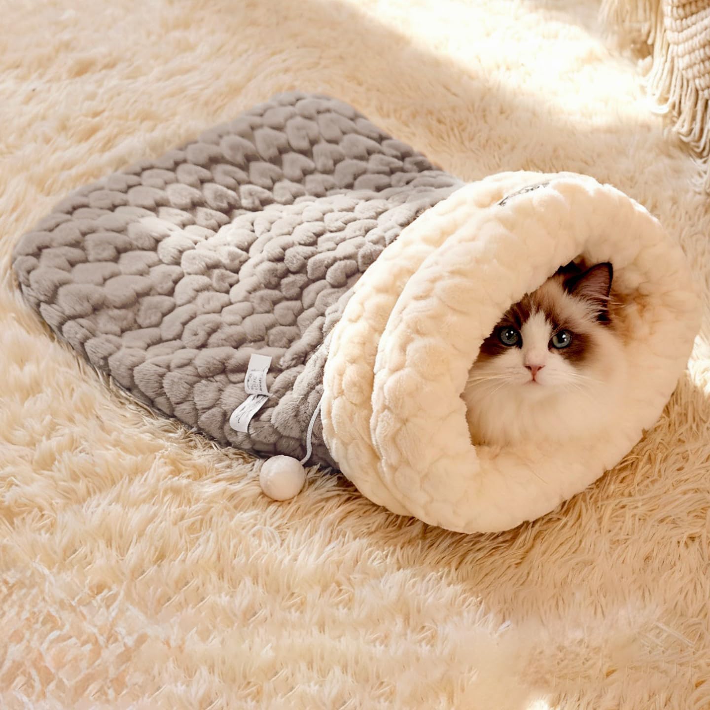 Wag&Wink 保温アップグレード 秋冬 ペット用寝袋 布団 猫ベッド 冬 暖かい 防寒 ハート柄 もこもこ ハウス 保温小型犬 猫 寝床 可愛い 柔らか 顎のせ 綿フランネル+コールテン+ファー ブルーグレー/ココアブラウン (ココアブラウン)