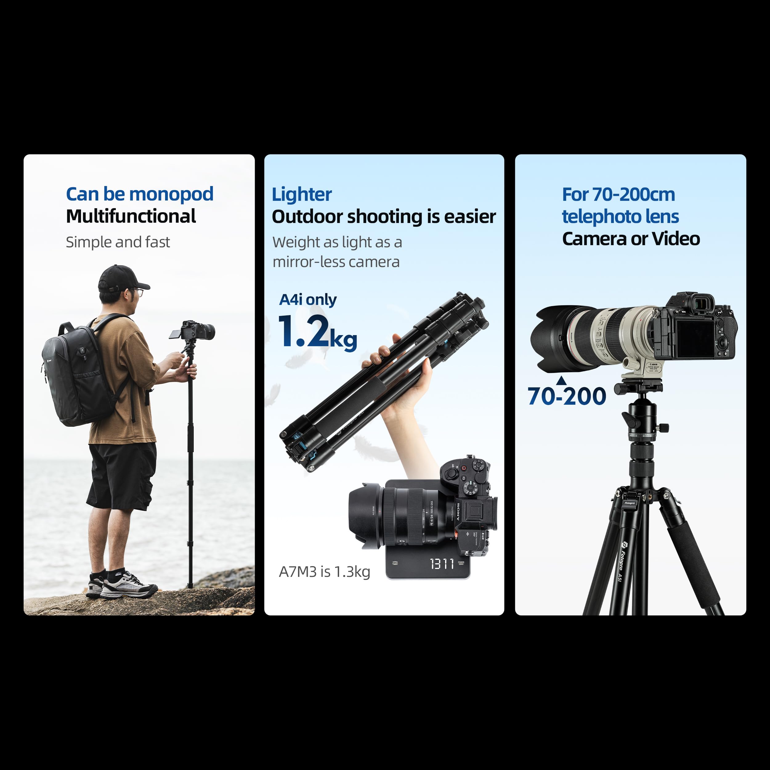Fotopro アルミニウム合金 三脚 175cm 三方向パンティルトヘッド 取り外し可能 スマホマウント対応 耐荷重3kg 軽量 コンパクト デジタルカメラ用 ビデオ用 DIGI-9700