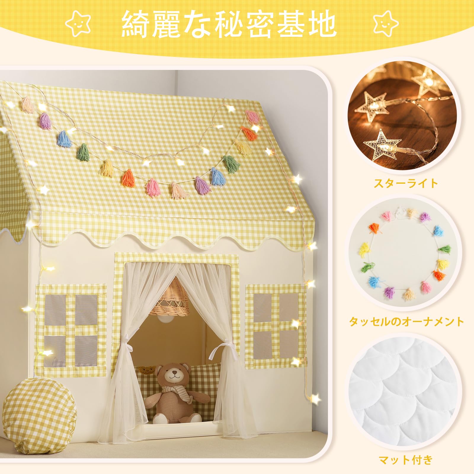 キッズテント 女の子のおもちゃハウス 可愛い子供用テントハウス プリンセスの城型 折り畳み式 キラキラLEDスターライト付き 秘密基地 室内遊具 簡単に組立 お誕生日 出産祝い クリスマスプレゼント おままごと Monobeach (ピンク)