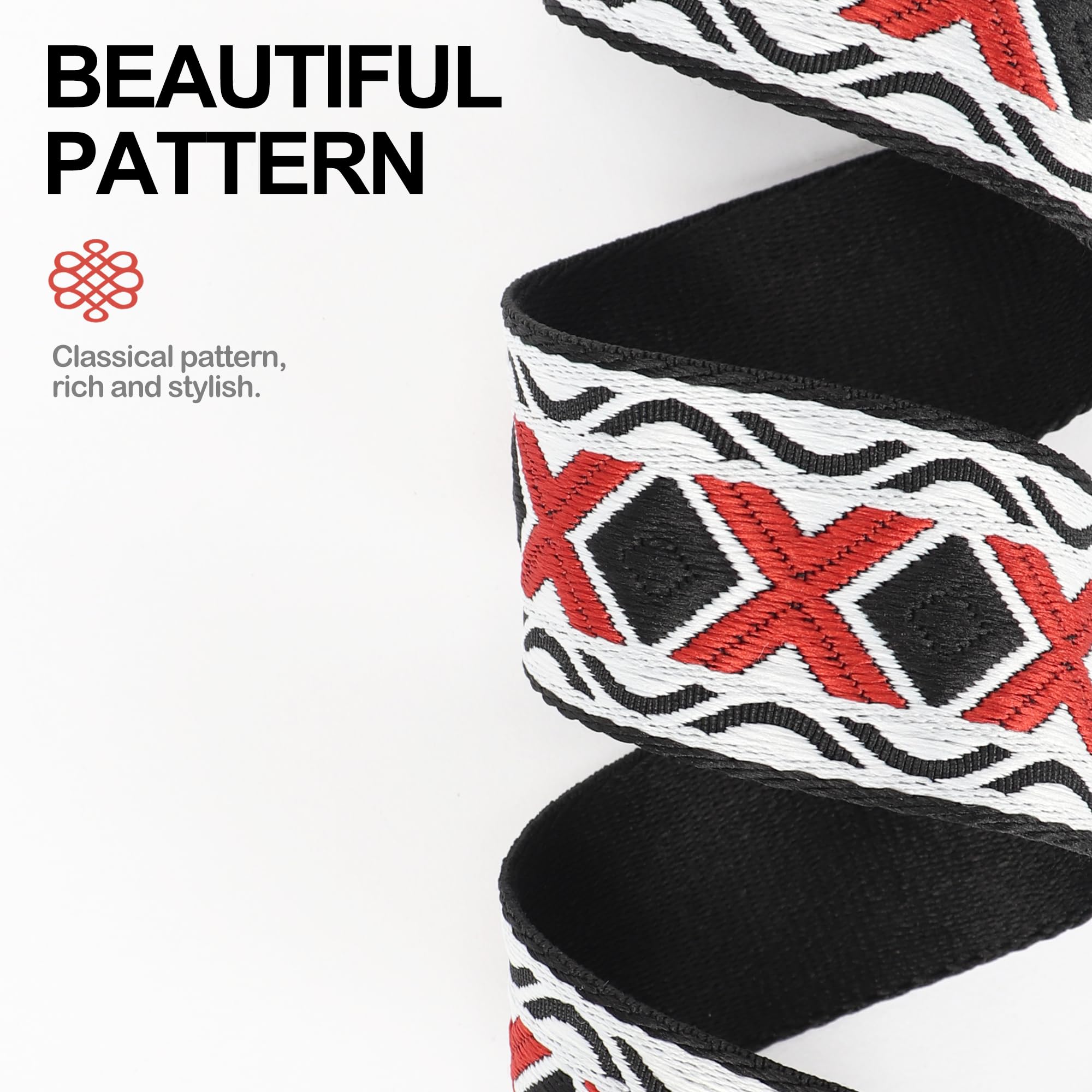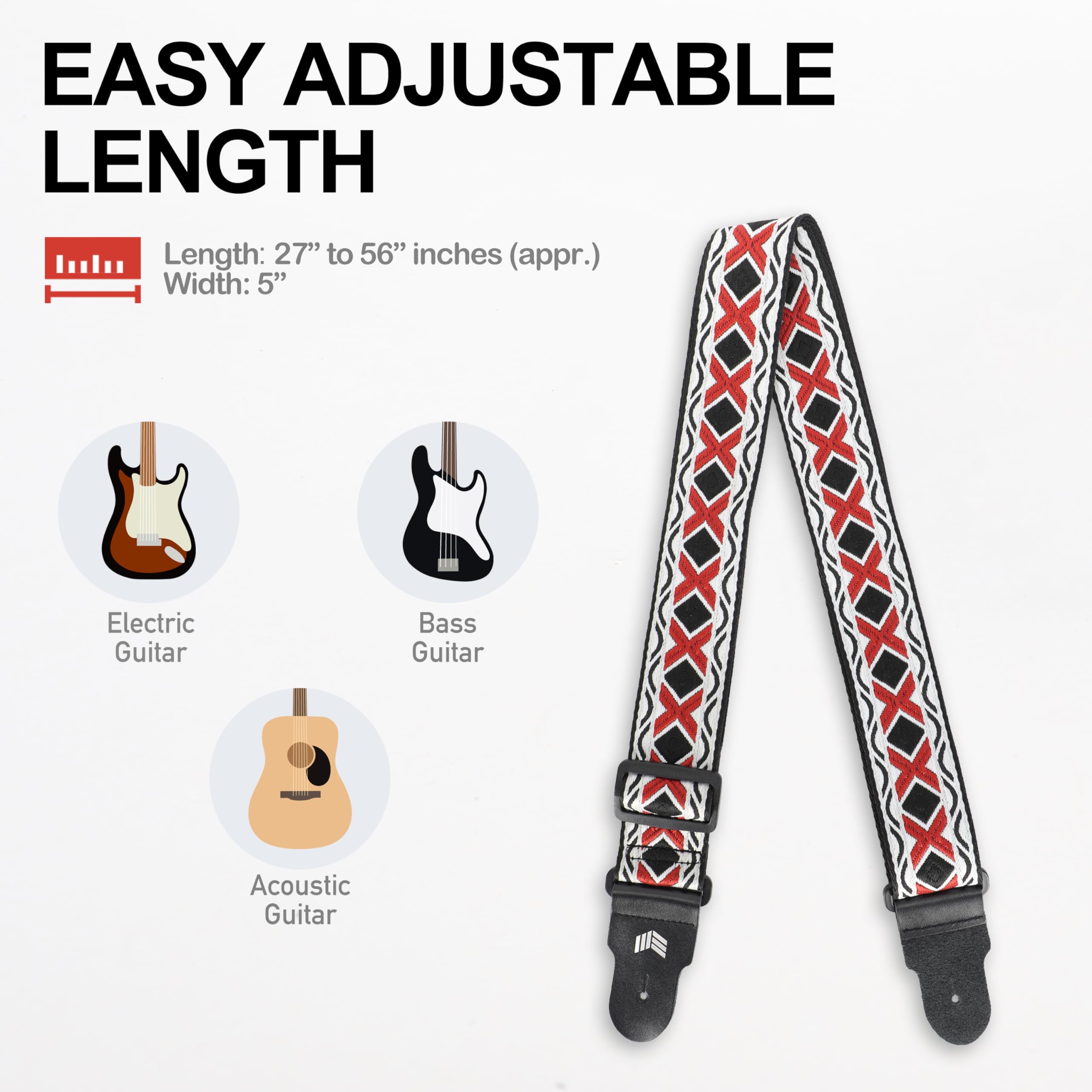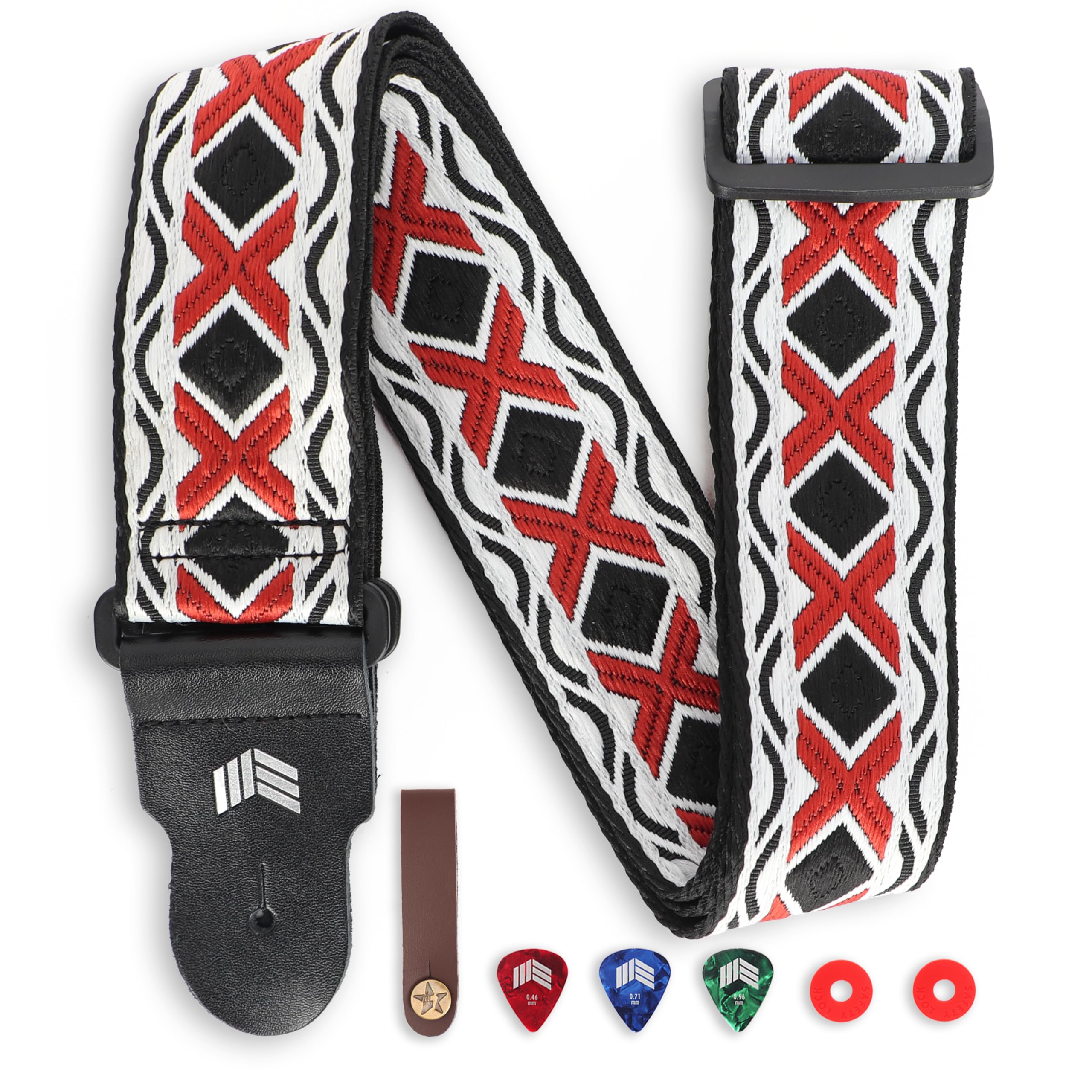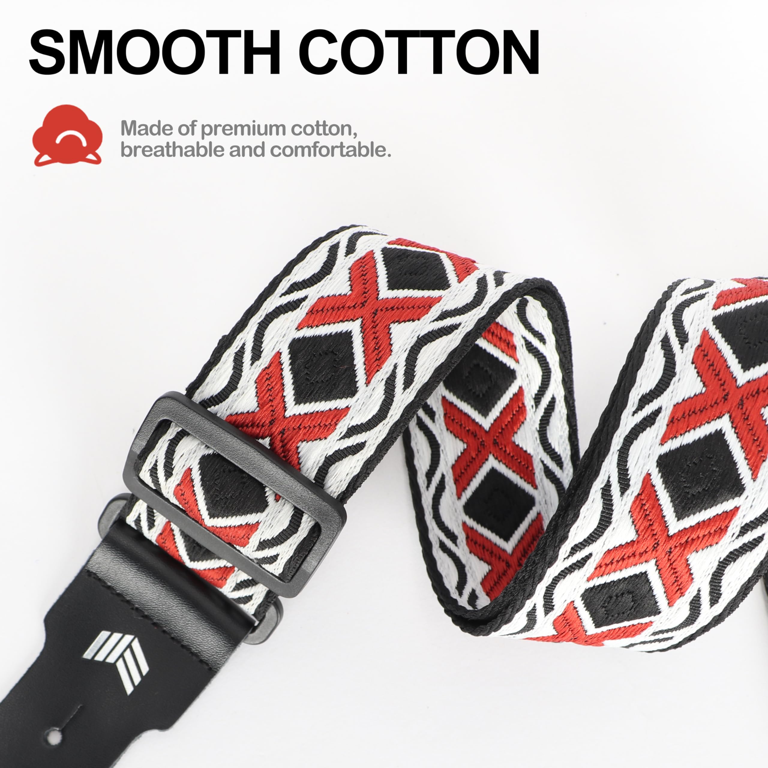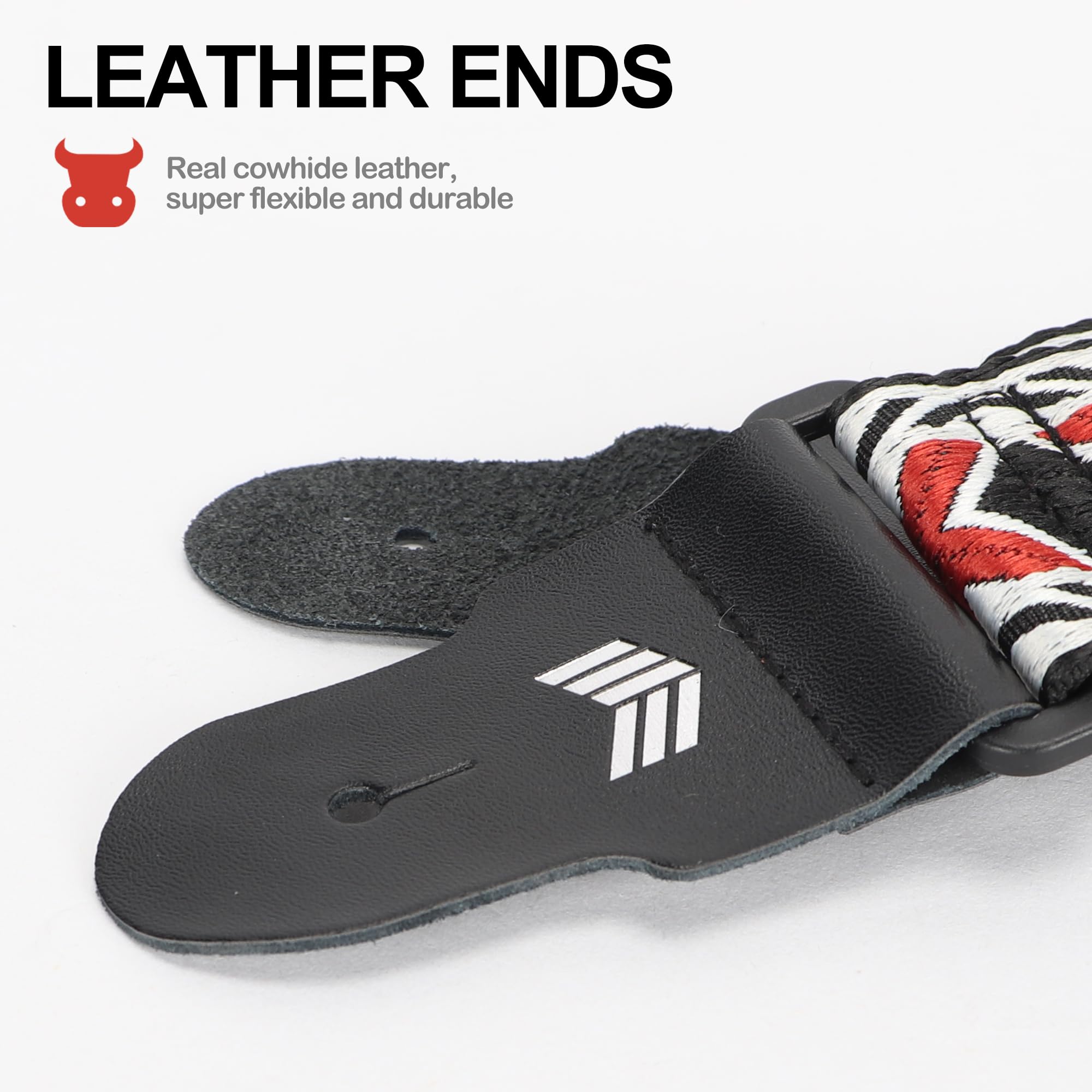 [MOOZAK] ヴィンテージ刺繍入りコットンギターストラップ, 本革エンド, アコースティック&エレクトリックギター対応, ピック3枚・ロック2個・ヘッドストックタイ1個付き