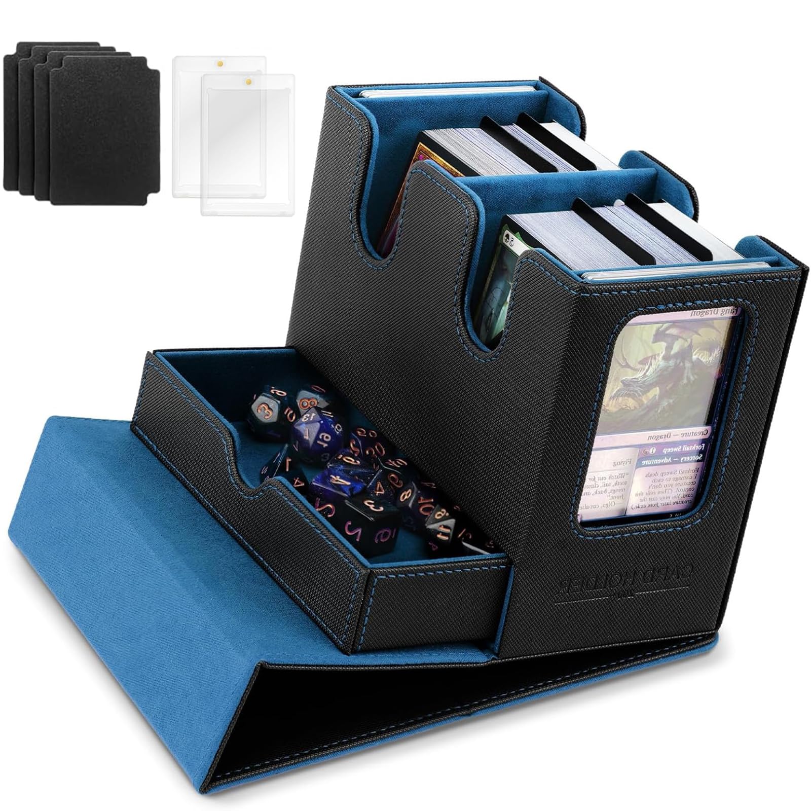 デッキケース カードケース ストレージボックス トレカ ストレージボックス 200枚収納 仕切り板4つとマグネットローダー2つ陳列窓2つ付き 遊戯王/統率者戦/デュエマ スリーブ対応 (黒内装蓝)