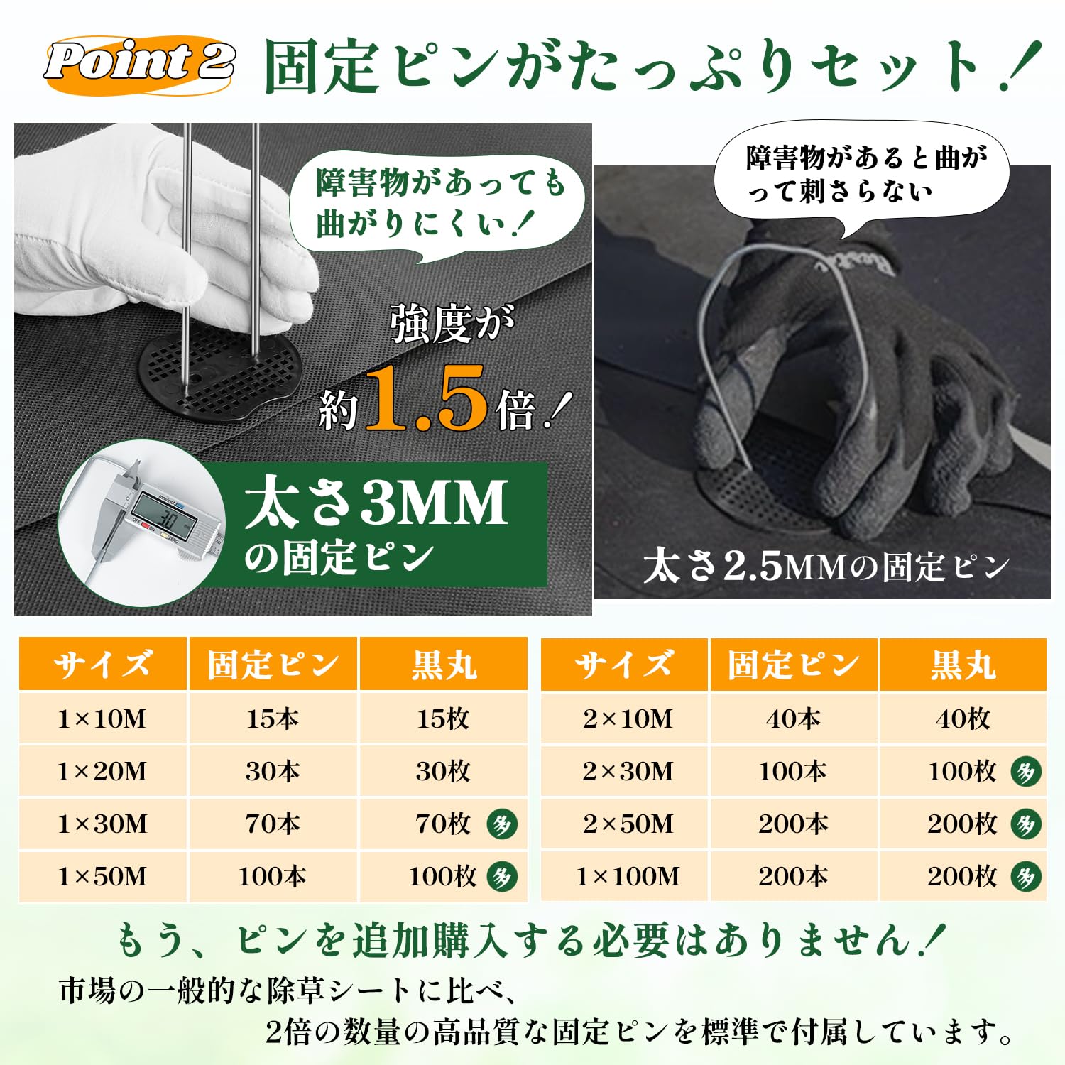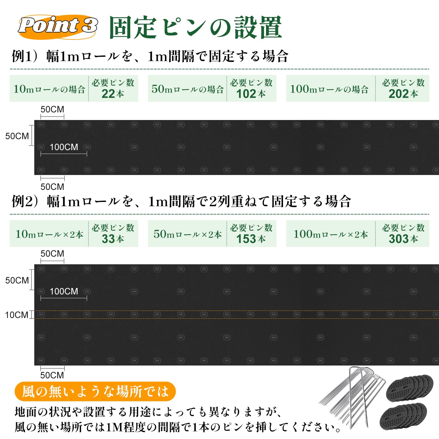 防草シート 2m×50m 雑草防止シート ぼうそうシート 除草シート 雑草対策 不織布 シート 遮光シート 防草マット 草よけ 厚手 高密度 高透水 高耐久 紫外線カット 庭 通路 物干し場 ウッドデッキの下など 雑草防止 固定ピン100本と黒丸100枚付き (グリーン)