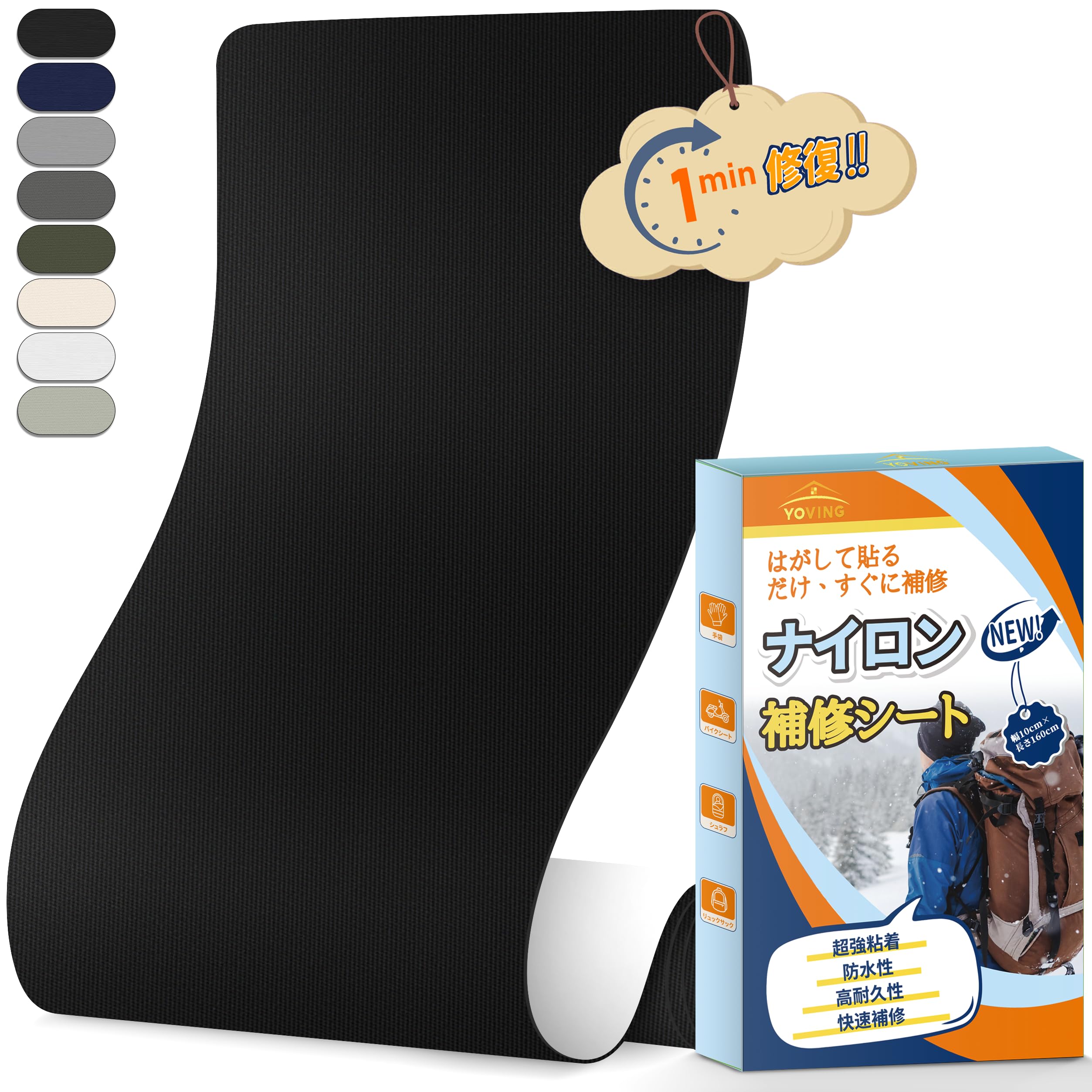 ナイロン補修シート 幅10cmx長さ160cm 強粘着 防水テープ ダウンジャケット バイクシート テント 布破れ 補修布 自由カット 耐久テープ(ブラック)
