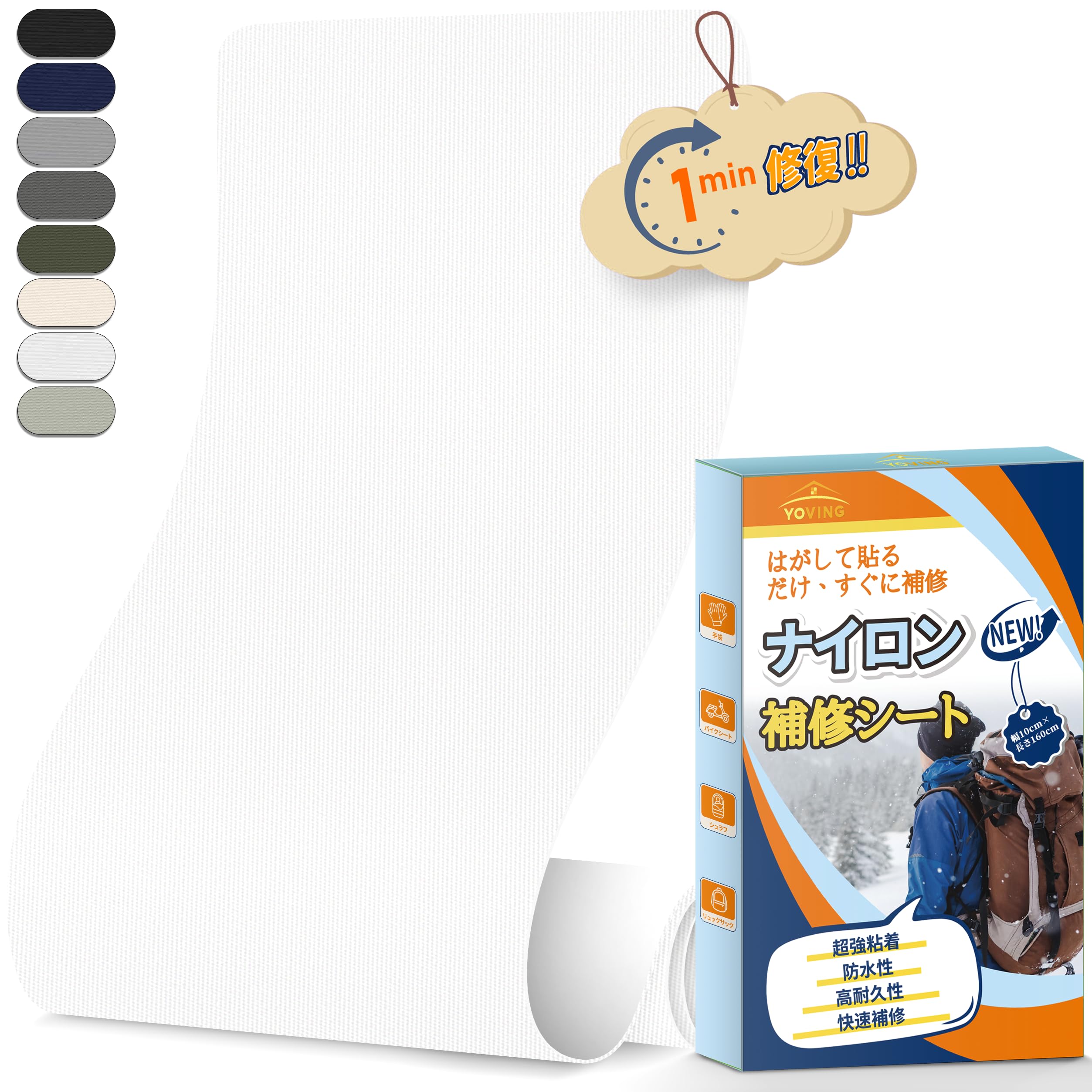 ナイロン補修シート 幅10cmx長さ160cm 強粘着 防水テープ ダウンジャケット バイクシート テント 布破れ 補修布 自由カット 耐久テープ(ホワイト)