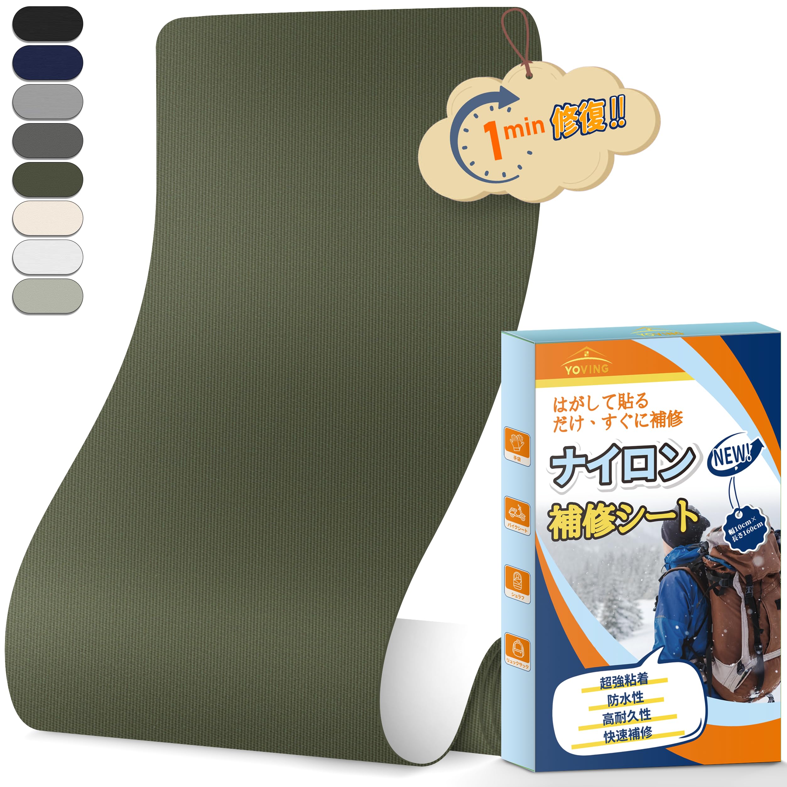 ナイロン補修シート 幅10cmx長さ160cm 強粘着 防水テープ ダウンジャケット バイクシート テント 布破れ 補修布 自由カット 耐久テープ(ダークオリーブ)