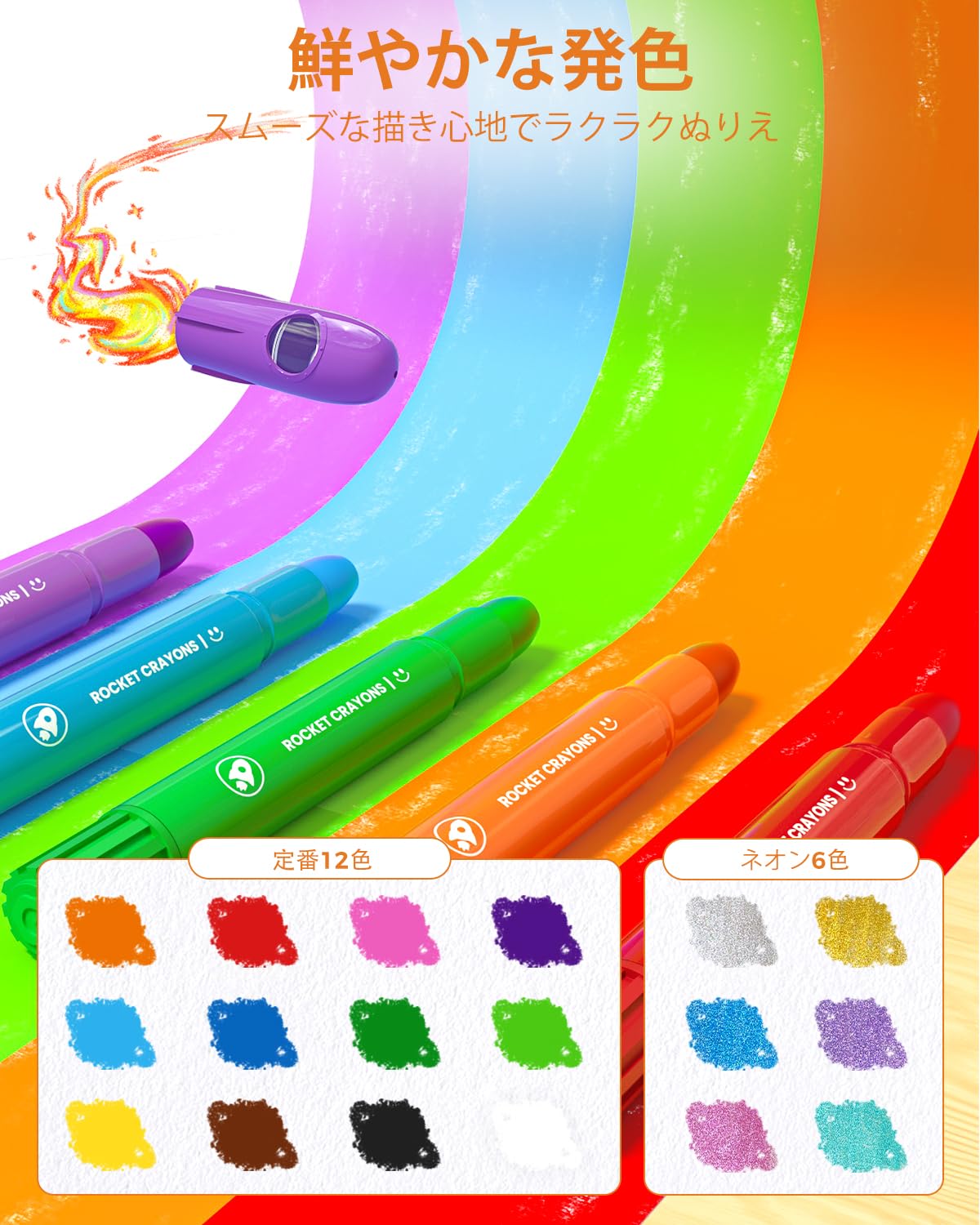 JUPITEARTH クレヨン ロケットタイプ 繰り出し式 18色 パステルカラー 繰り出し式 かわいい 持ちやすい 手汚れない 折れにくい 安全 無毒 水で落とせる 塗り絵 落書き お絵描き 絵の具 セット 小学生 赤ちゃん 幼児
