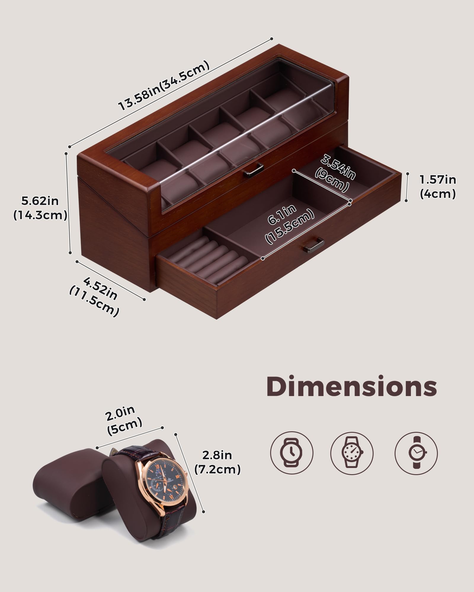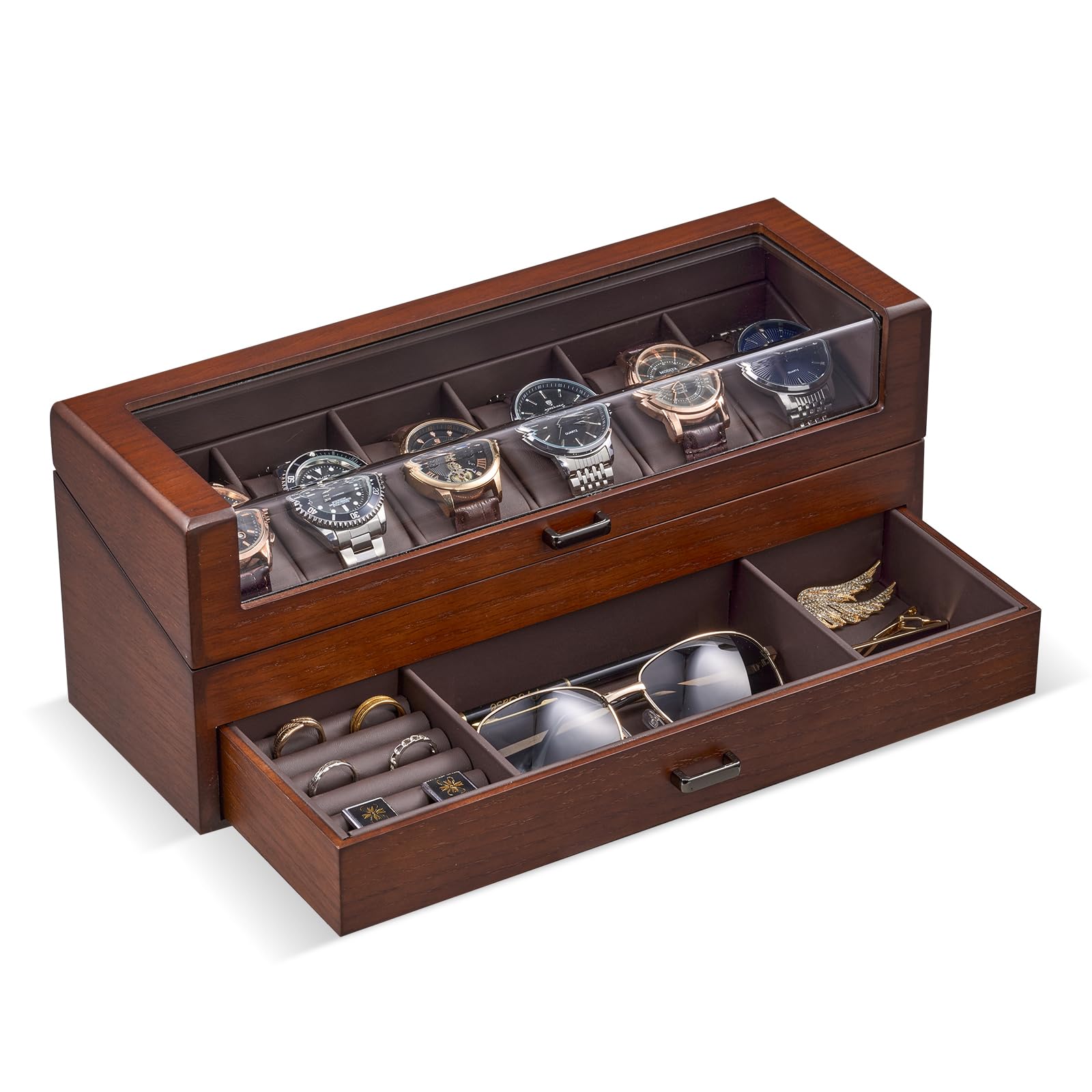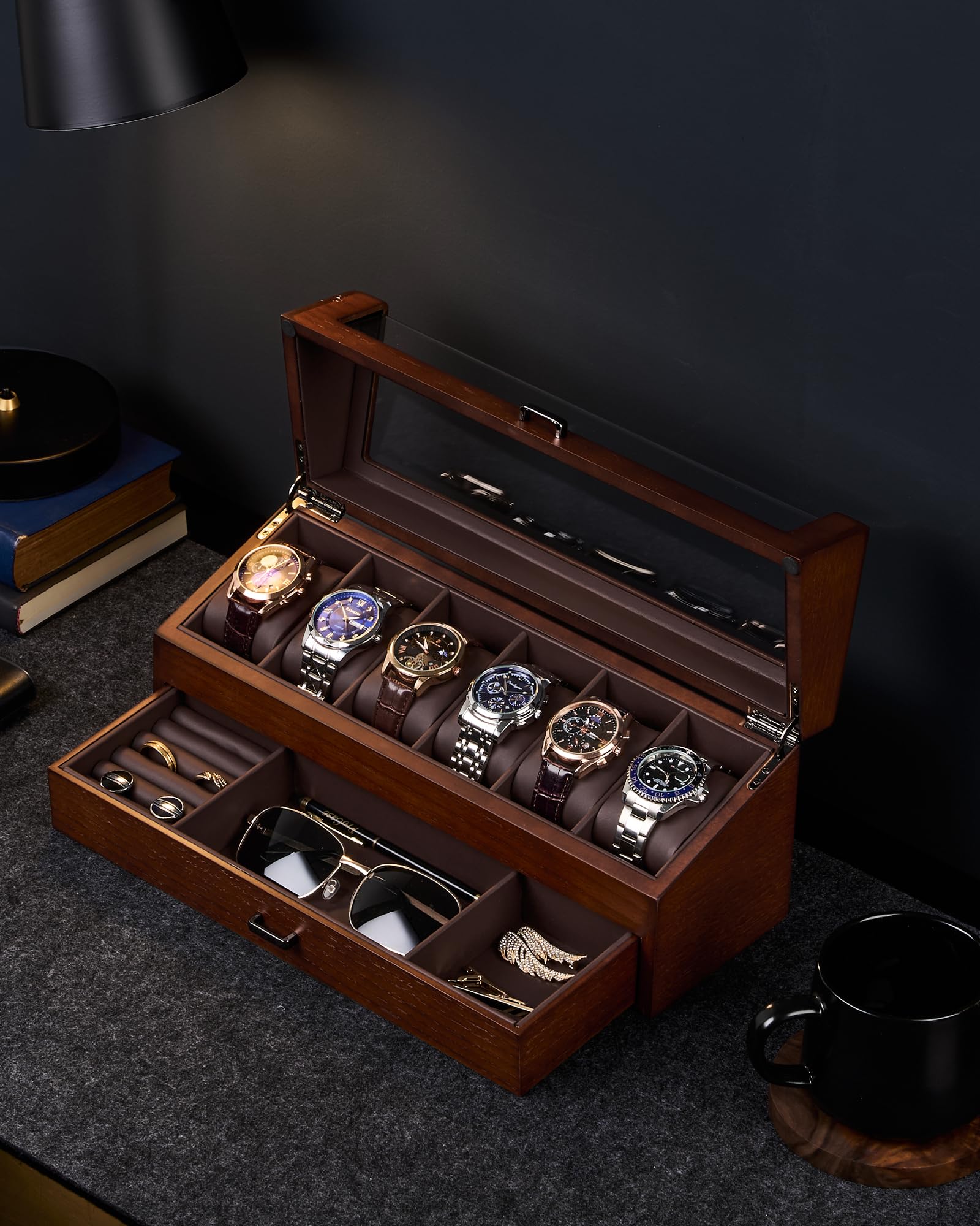 ProCase 腕時計ケース 木製 6本用 2段式ウォッチボックス 男性向けジュエリーオーガナイザー ディスプレイ収納ケース ガラス蓋付き