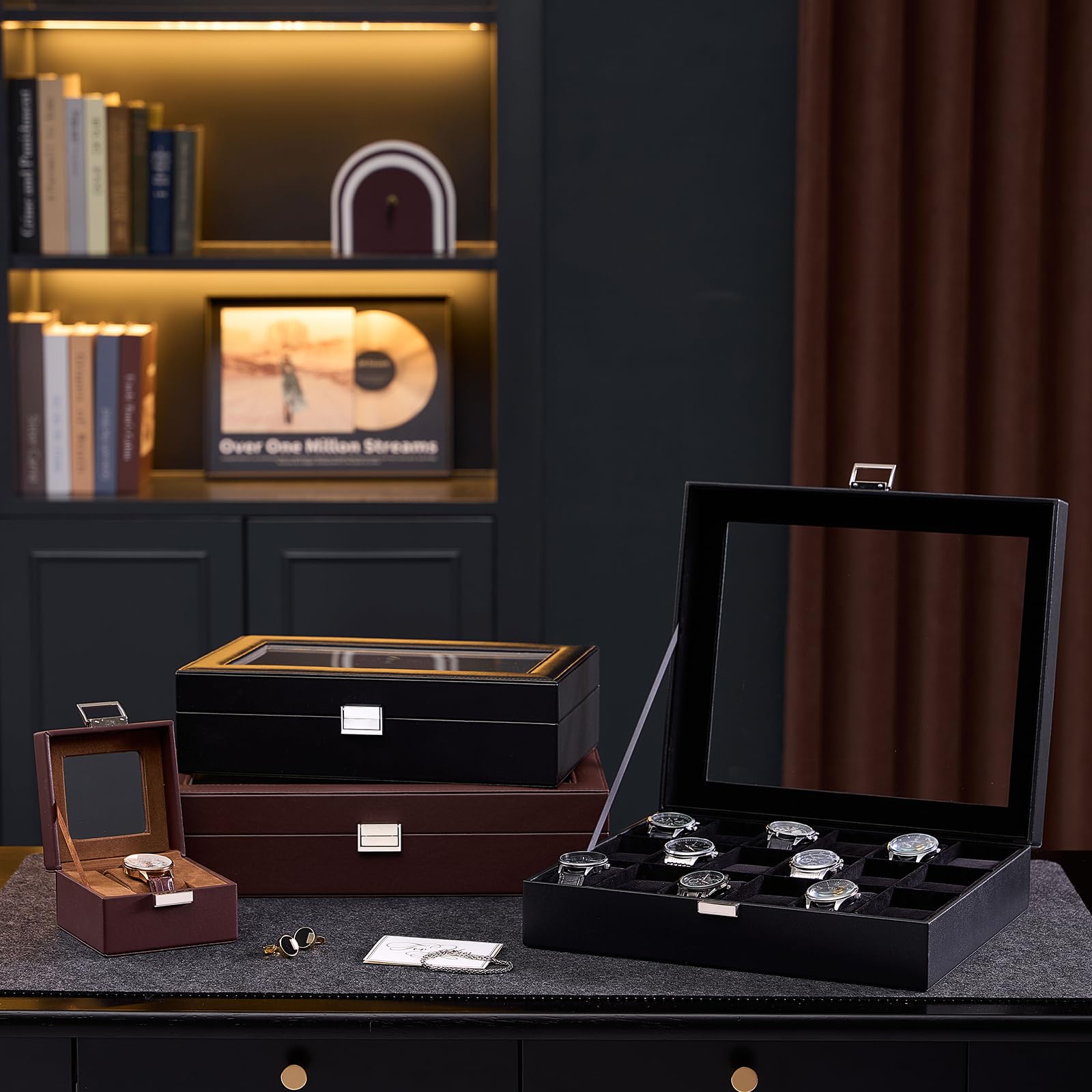 Mocamoro 腕時計ケース 1-12本用 ウオッチボックス 男性 高級 時計コレクション 透明ガラス天板 ディスプレイ プレゼント (墨色, 1段-3本)