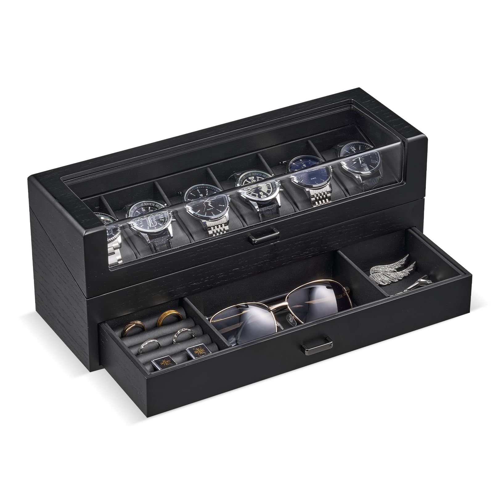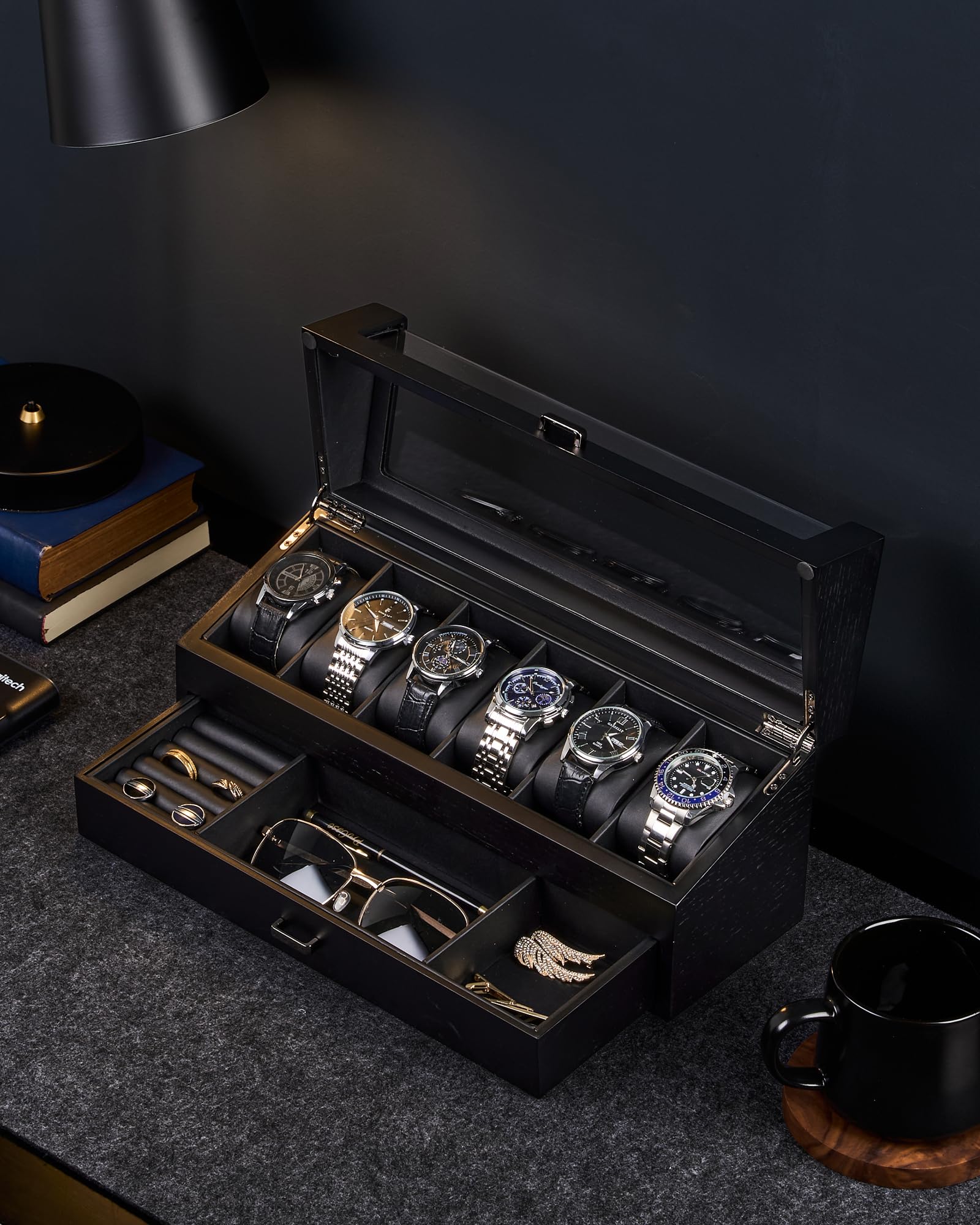 ProCase 男性用木製腕時計ボックス、ガラス蓋付き6スロット腕時計ディスプレイケース
