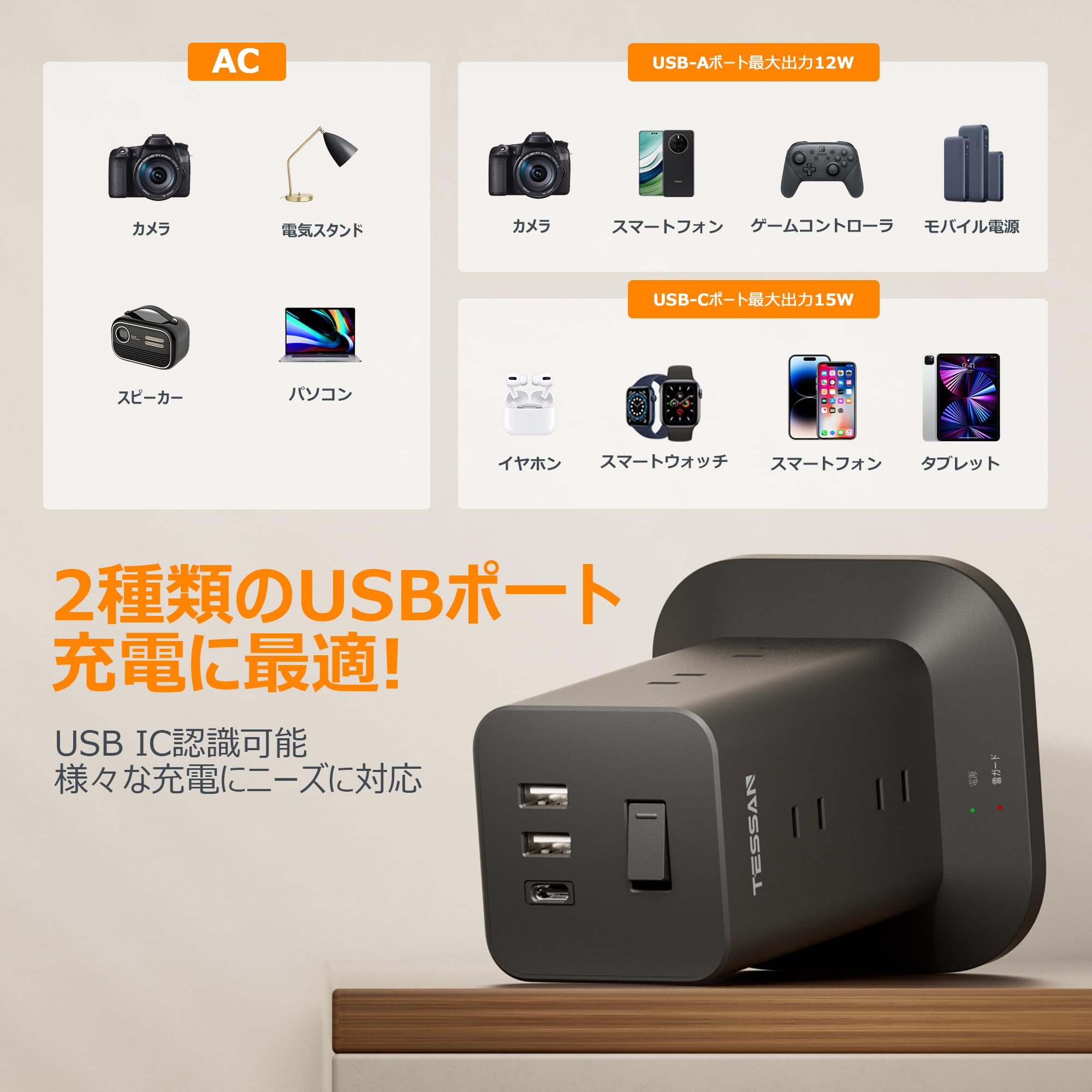 延長コード 短い 薄型プラグ TESSAN 電源タップ usb付き タイプc プラグ コンセント タップ 丸型 巻き取り式 電源タップ 3個AC差込口 1個type-C と2個type-Aポート タコ足配線 たこあしコンセント 分岐 出張 旅行 2ピン/3ピン適用 66cm