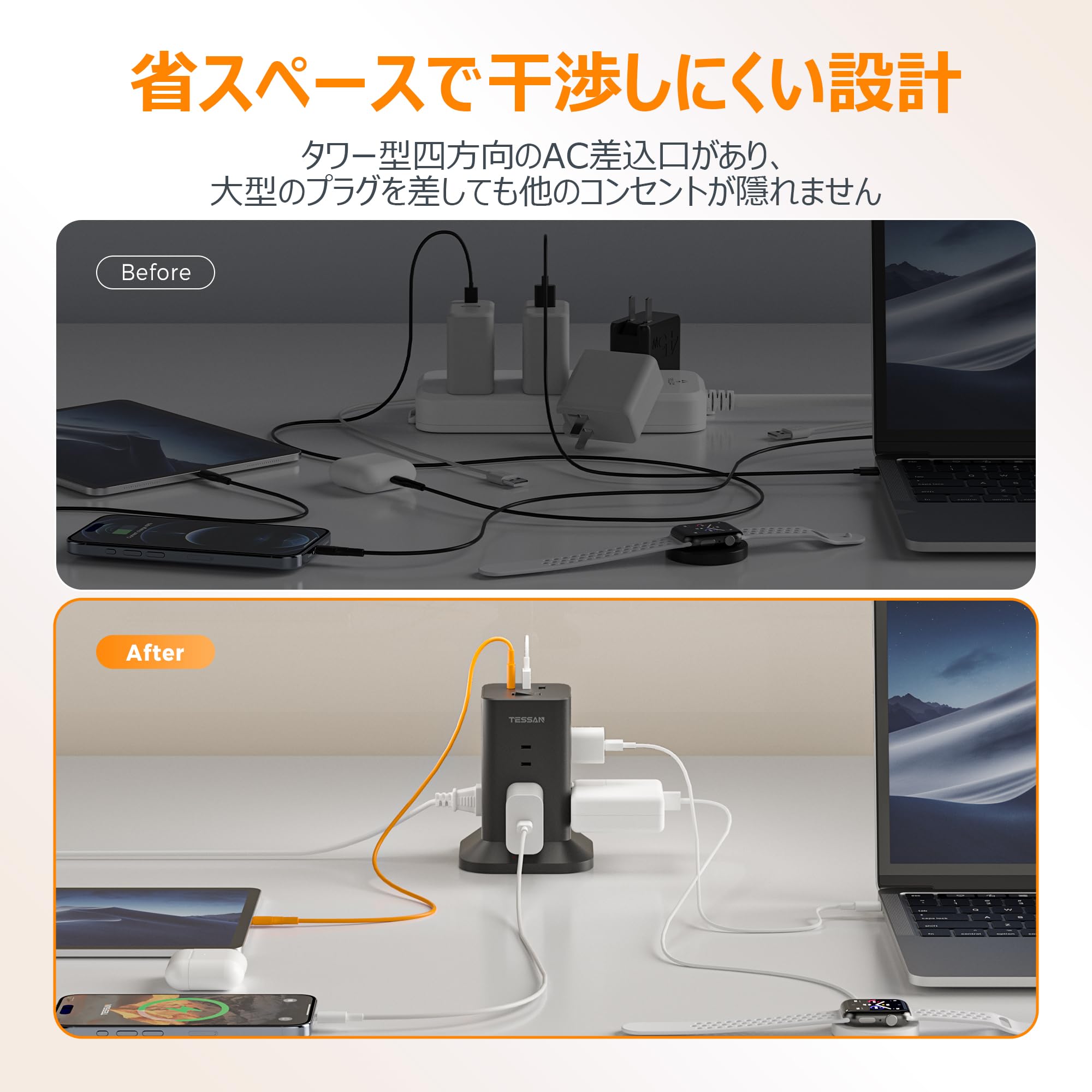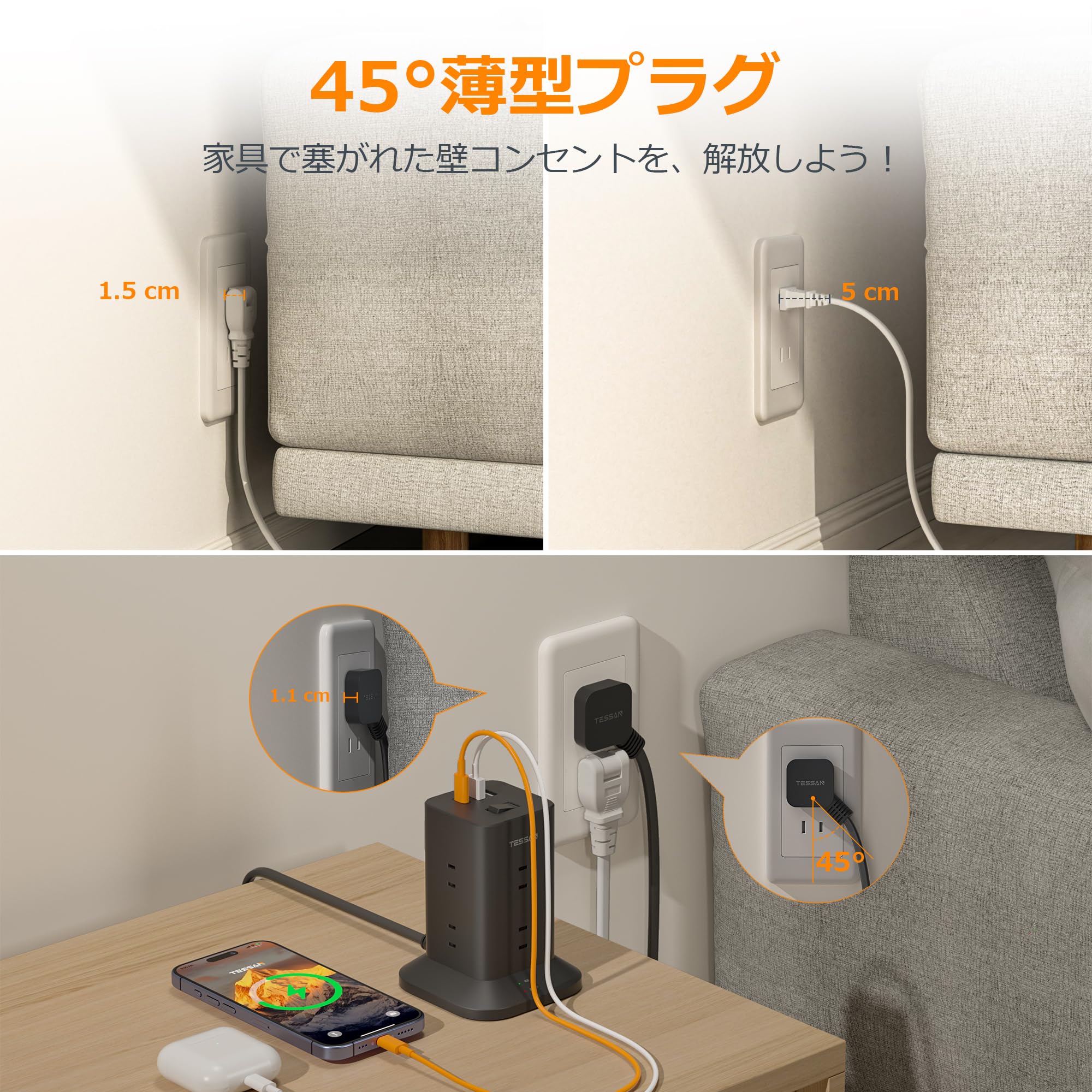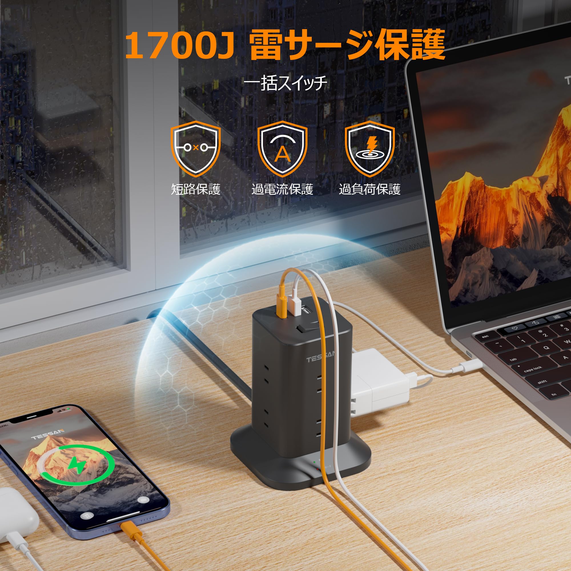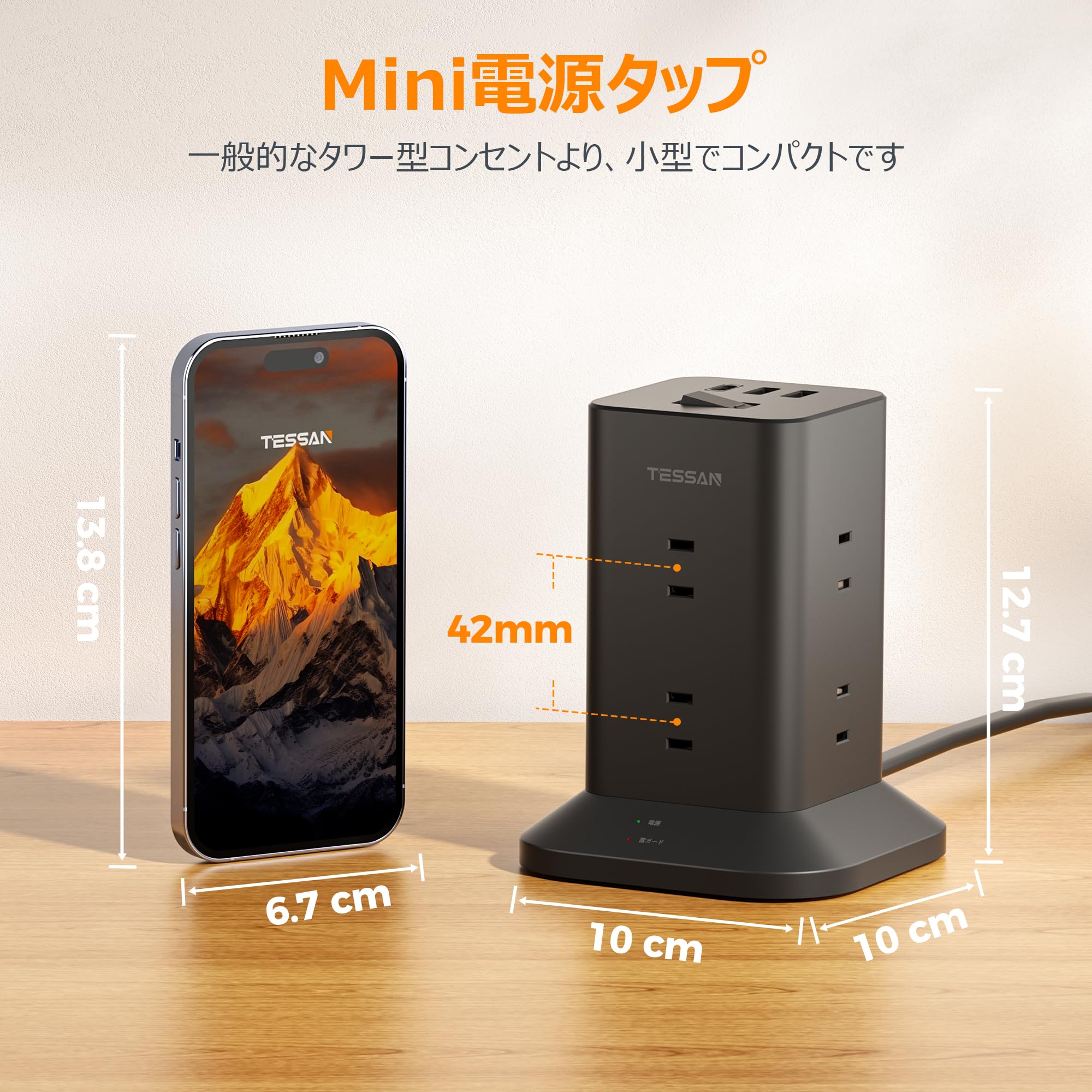 電源タップ タワー型 黒 薄型プラグ 延長コード 2m ブラック 8個AC コンセント 1個USB-Cポート及び2個USB-Aポート TESSAN テーブルタップ たこあしコンセント タコ足配線 マルチ OA 雷ガード 一括スイッチ 省エネ mini型