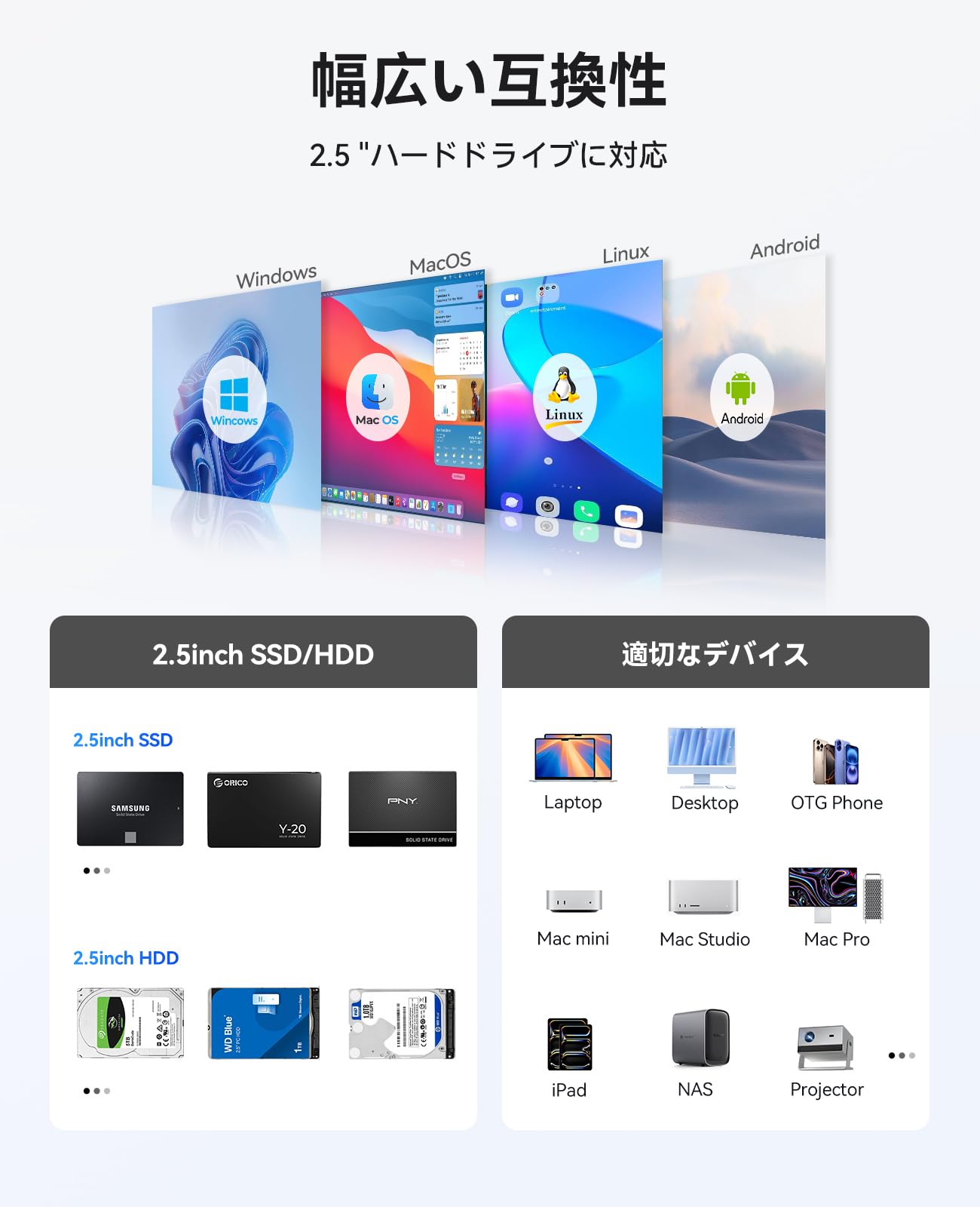 ORICO アルミ 2.5インチ HDD ケース USB C 3.2 GEN 2接続 2.5インチ SATA HDD/SSD ケース 6Gbps高速転送 ハードデスクケース 6TB容量まで macOS Windows Linux OS対応 USB C-USB A/C 2 in 1ケーブル付属 DD25-C3
