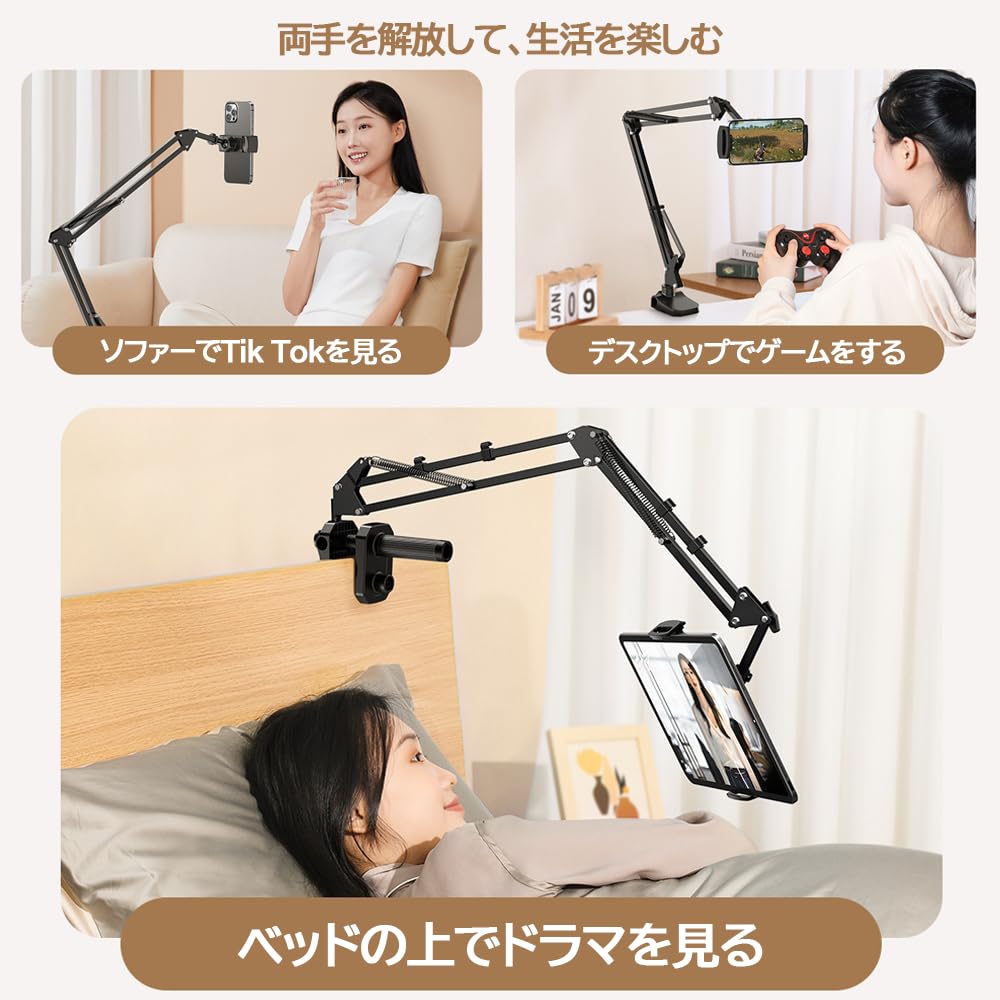 タブレット スタンド タブレット アーム タブレットホルダー スマホアームスタンド 寝ながら ボルダー 自由角度調整 360°回転ホルダー 高さ調節 土台強化 ipad スマホ 折り畳み 4~12.9インチ多機種 45-175cm 卓上・床置き両用(ブラック)