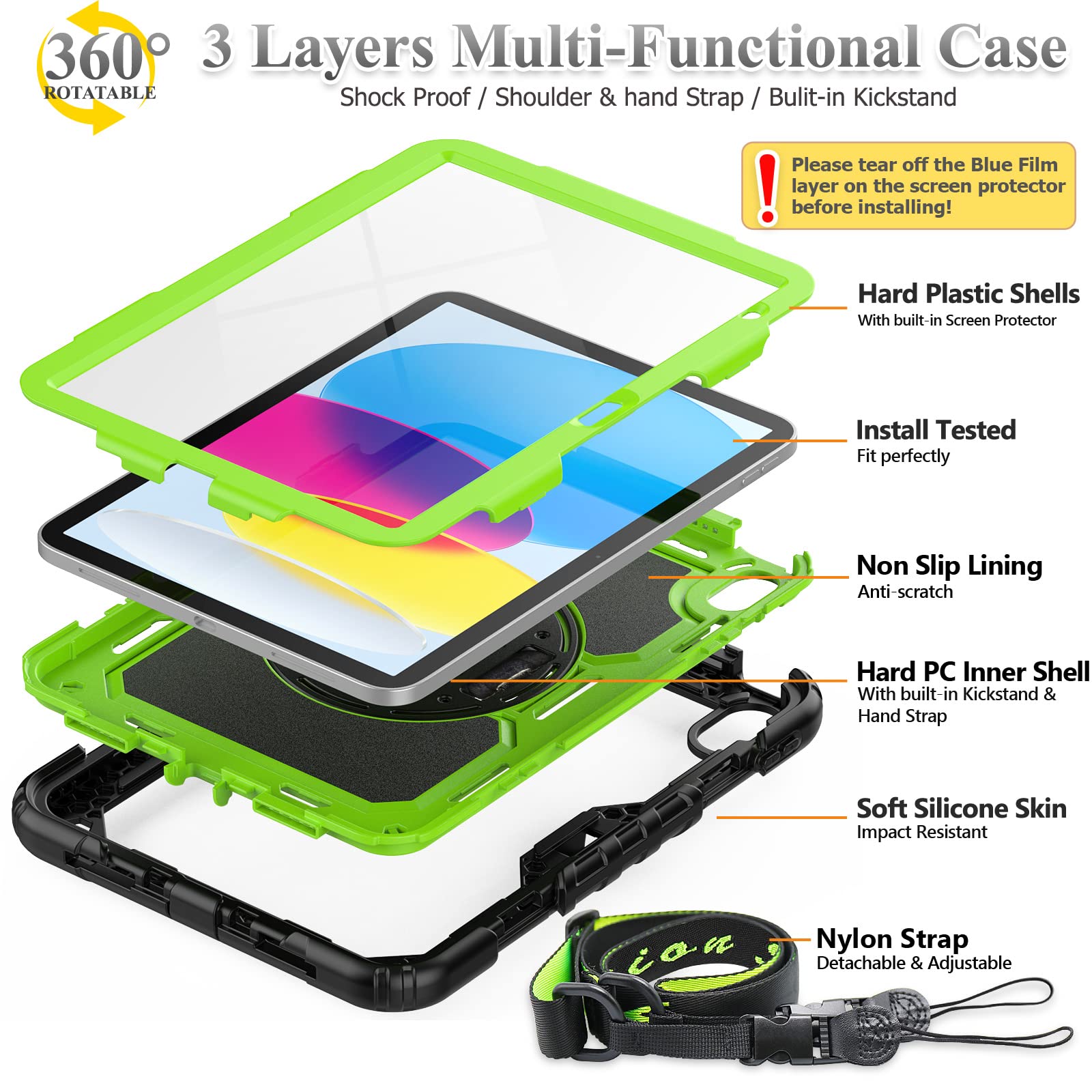 SEYMAC stock iPad(A16) 第11世代/第10世代専用ケース 耐衝撃 ペンホルダー フィルム付き前面カバー 横置き縦置きスタンド 360度回転ハンドストラップ ショルダーストラップ付き(グリーン)