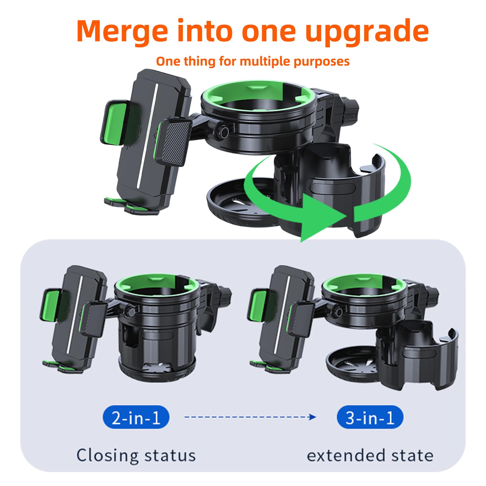 4-in-1 ユニバーサルカップホルダー(ベビーカー、自転車、車椅子、ショッピングカート用) | 360°回転可能 滑り止めシリコングリップ こぼれ防止デザイン | 調節可能なシングル/ダブルカップと電話ホルダー【グリーン】