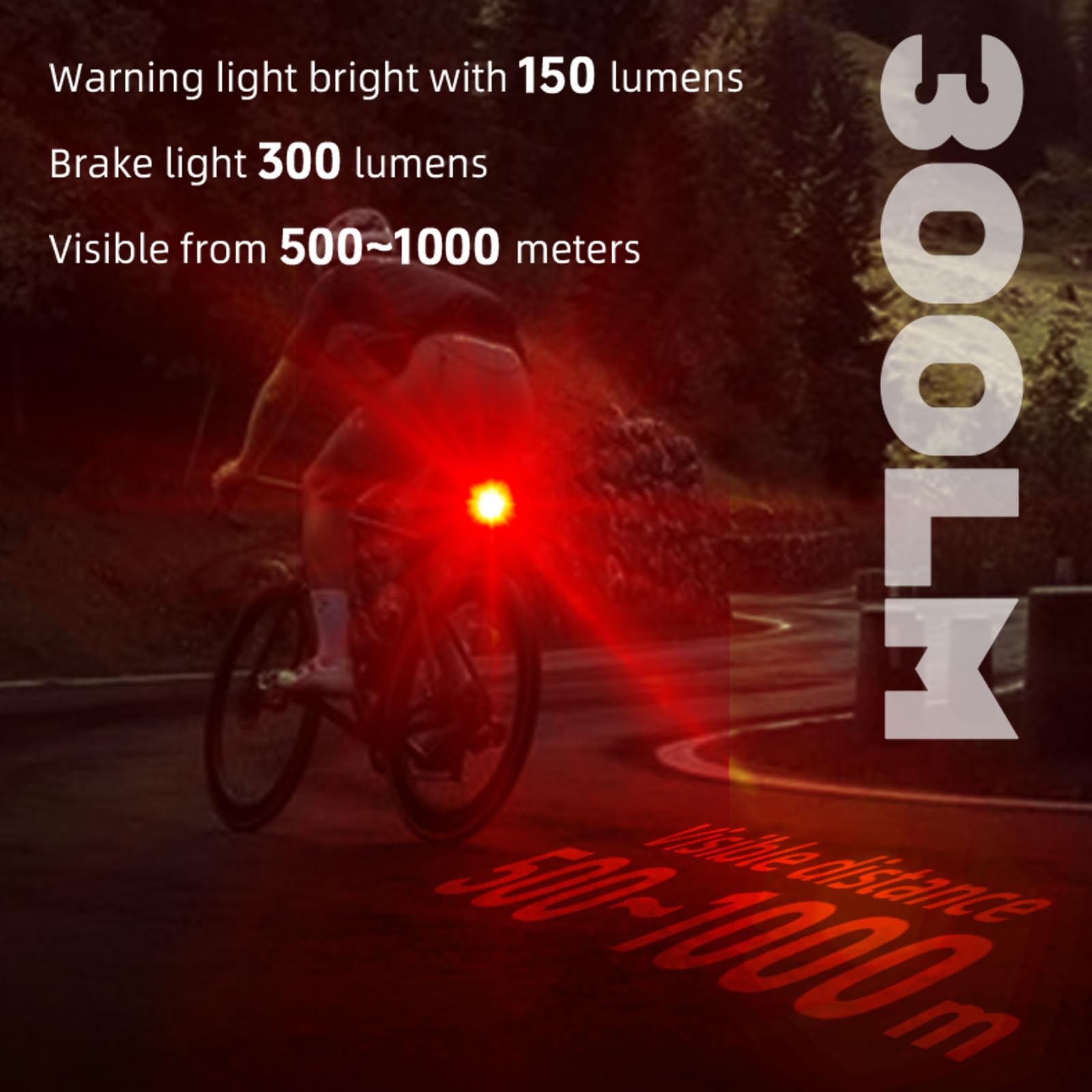 スマート自動感知バイクブレーキテールライト300ルーメン高輝度、8レベル調節可能、800m可視性、IP66防水、アルミニウム合金、220°広角、振動ウェイクアップ、パワーオフメモリ[ブラック]