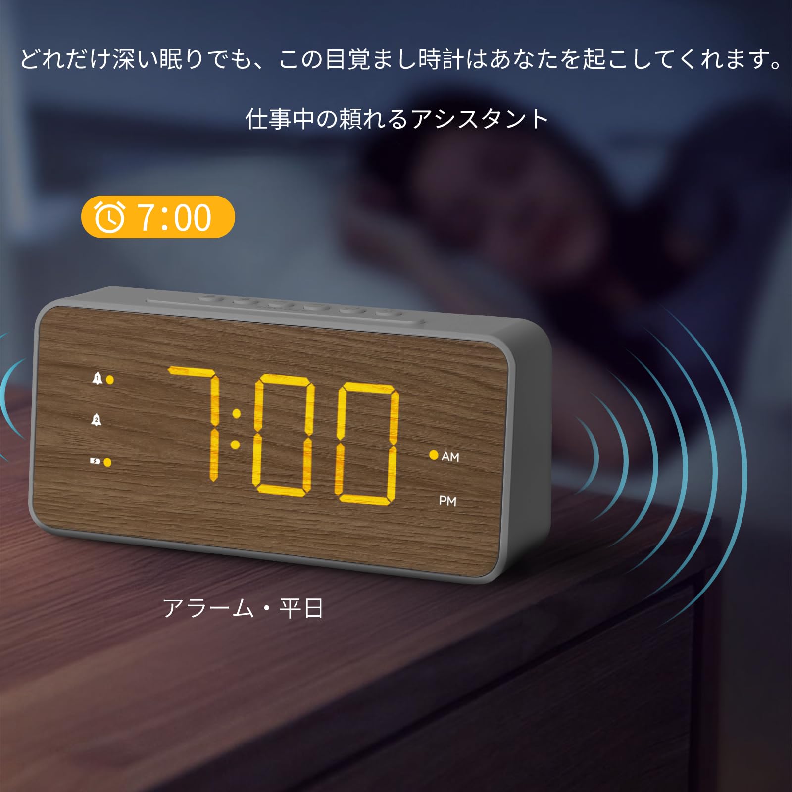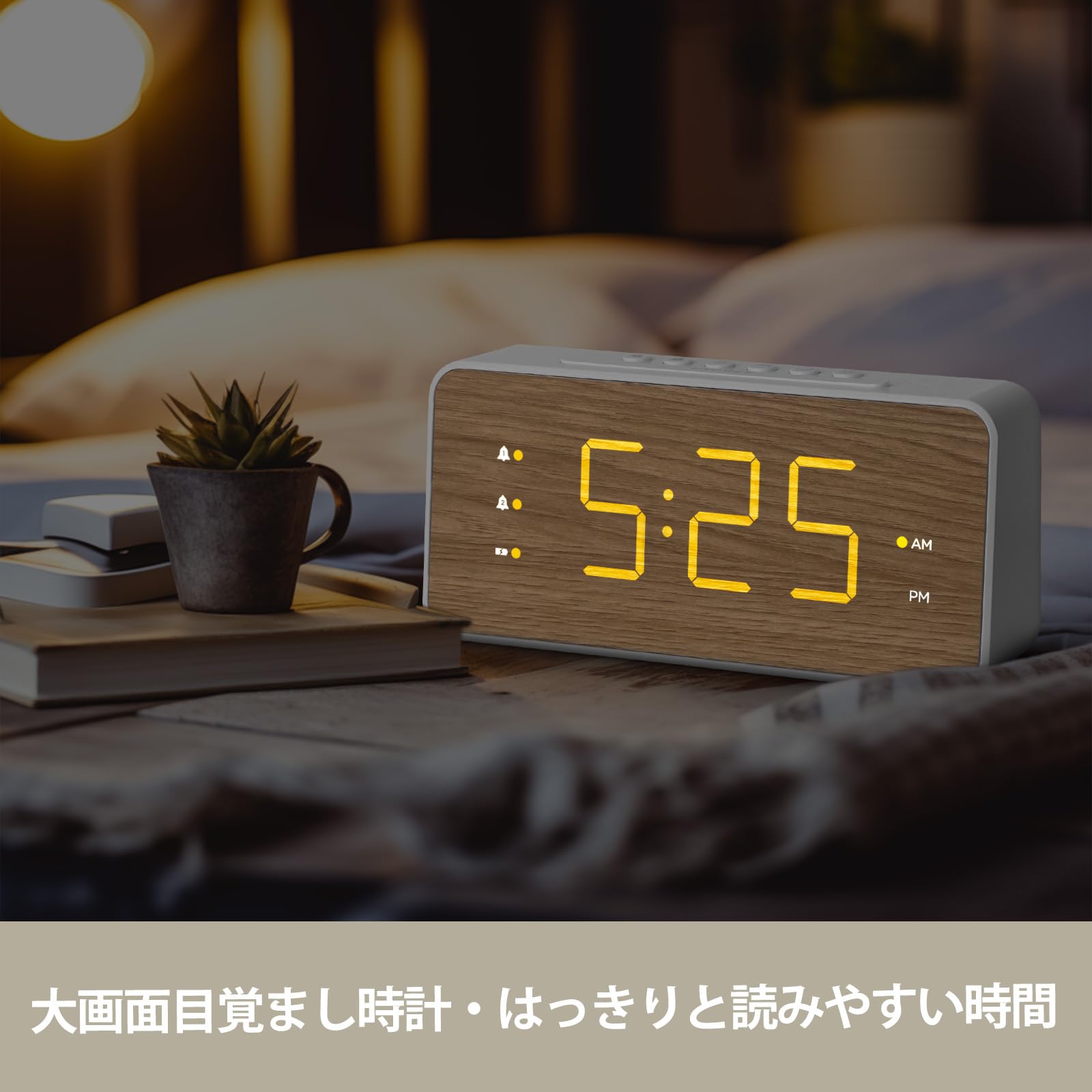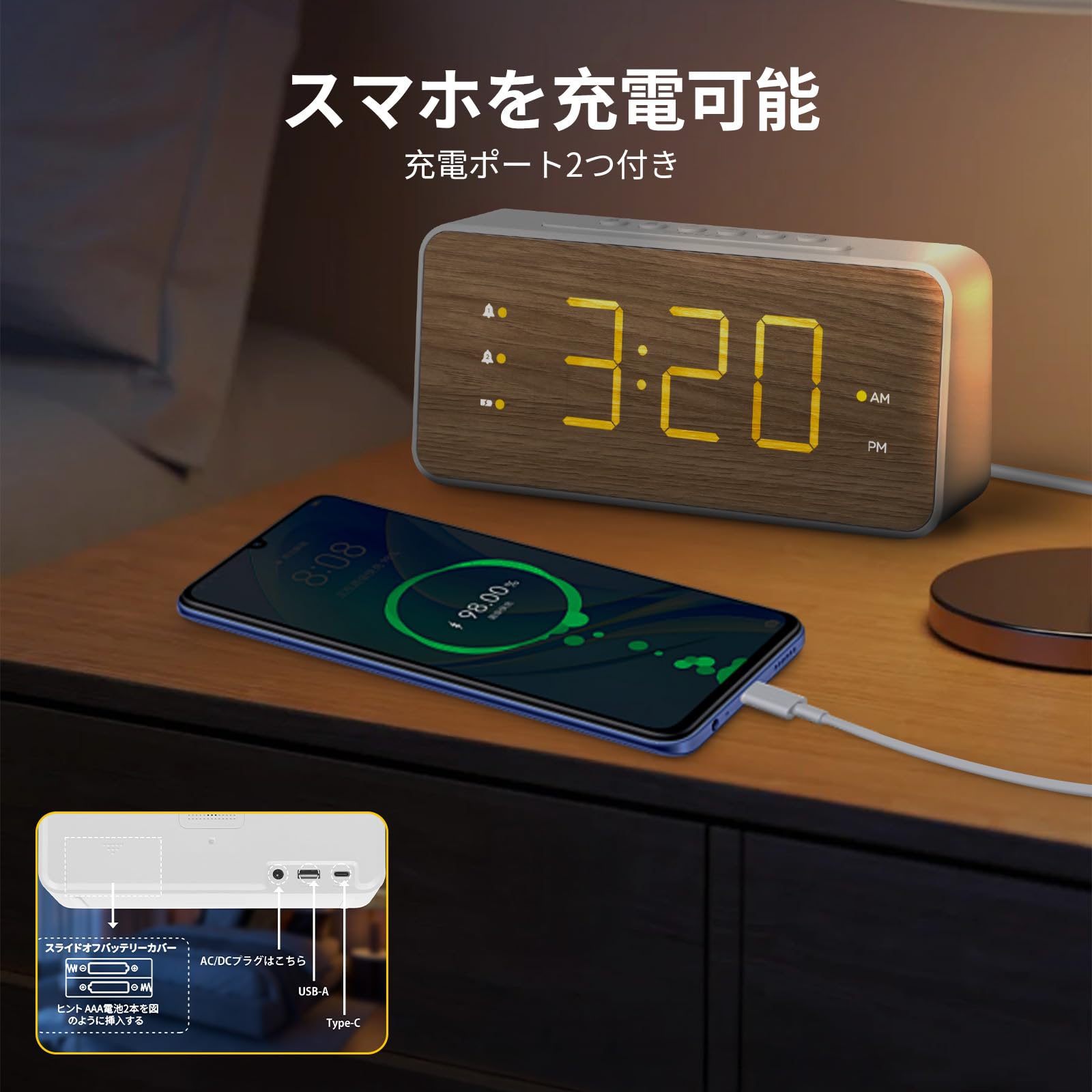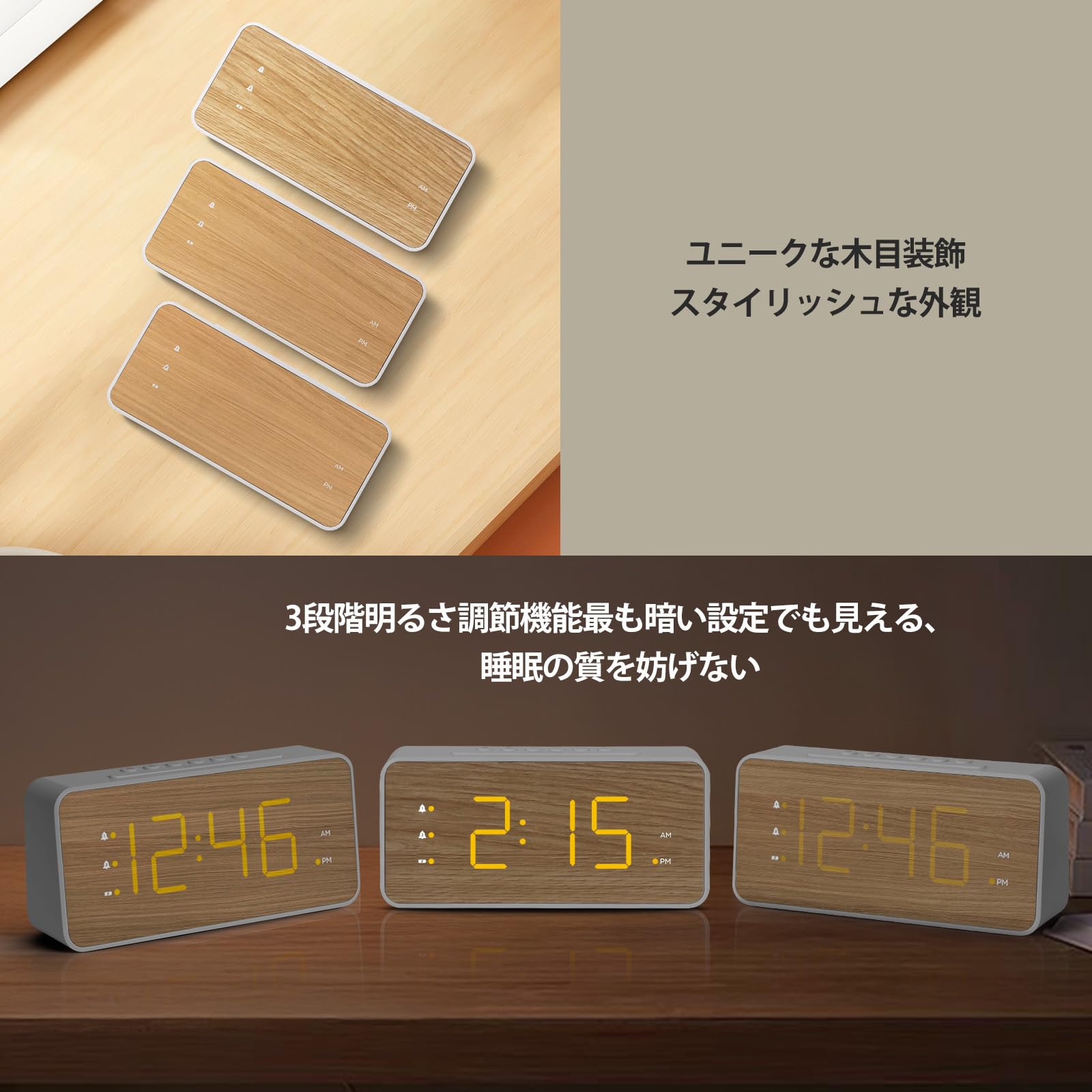 北欧風 木目調 デジタル目覚まし時計 大画面 led時計 3段階調光 USB-A & USB-C充電 デュアルアラーム スヌーズ機能 停電バックアップ ベッドサイド/卓上/リビング用