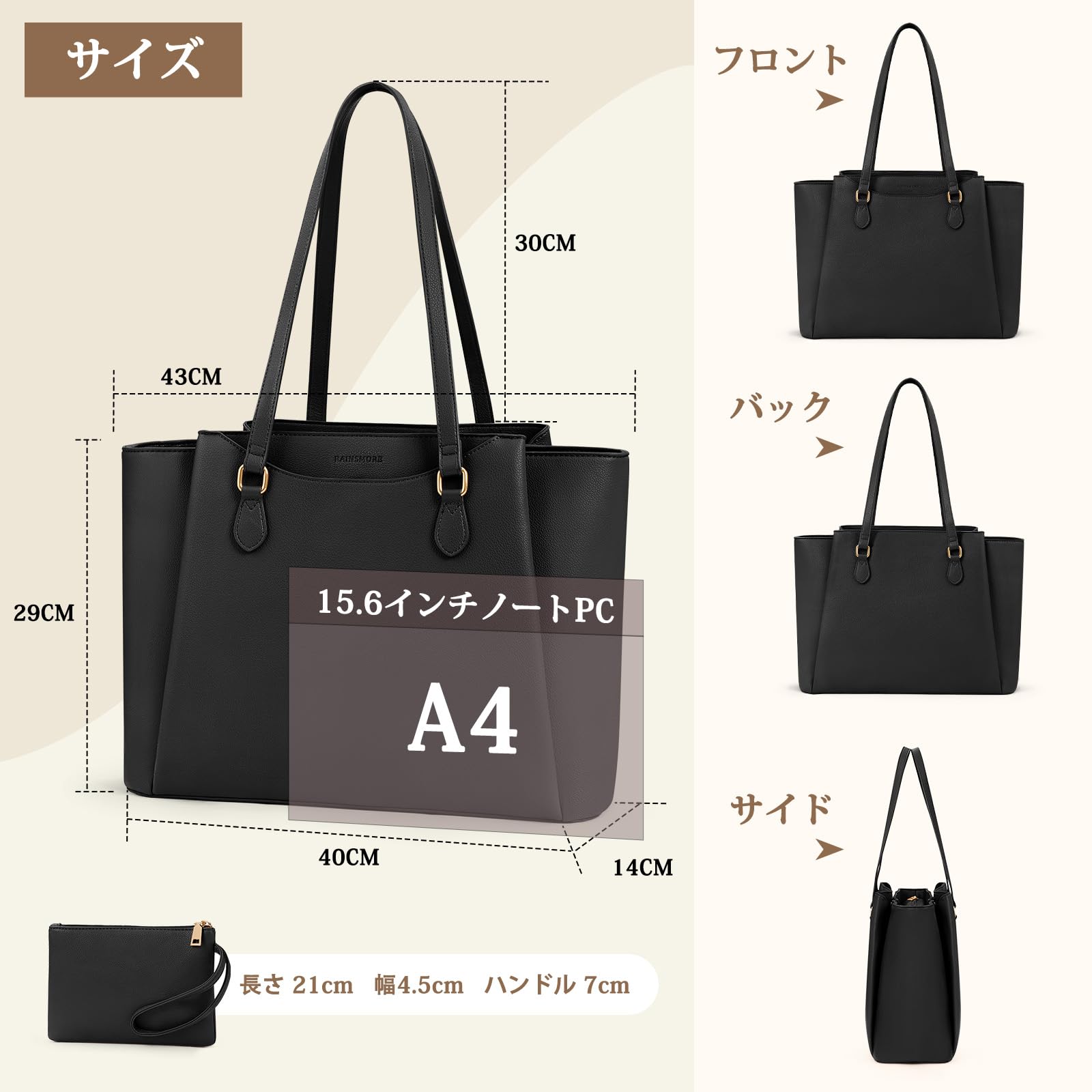 説明本製品は、洗練されたデザインと高品質なPUレザーを採用した、エレガントで多機能なバッグです。シンプルながら上品なフォルムは、ビジネスシーンはもちろん、カジュアルな日常使いにもぴったりで、就活、通勤、出張、旅行、デート、ショッピング、カラオケ、ウォーキングなど、あらゆるシーンで活躍します。大容量設計により、A4サイズの書類や15.6インチのノートPCはもちろん、iPad、財布、手帳、水筒、スマートフォン、折りたたみ傘、化粧品など日常の必需品を効率よく整理収納できます。外部にはマグネット式ポケットが3つ搭載され、頻繁に取り出すアイテムをサッと収納可能なほか、独立したミニポーチも付属しており、小物の整理にも便利です。さらに、底面には4つの鋲が付いているため、直置きしても傷や汚れを防ぎ、自立構造に常に美しいシルエットを保ちます。スムーズで耐久性に優れたファスナーと、忙しい日常でも快適にお使いいただけます。持ち手の長さは30cmで、手持ち・肩掛けどちらでもシーンに応じて使用可能。シンプルでありながらエレガントなデザインは、プロフェッショナルな女性の装いを引き立てると同時に、贈り物としても最適な一品です。