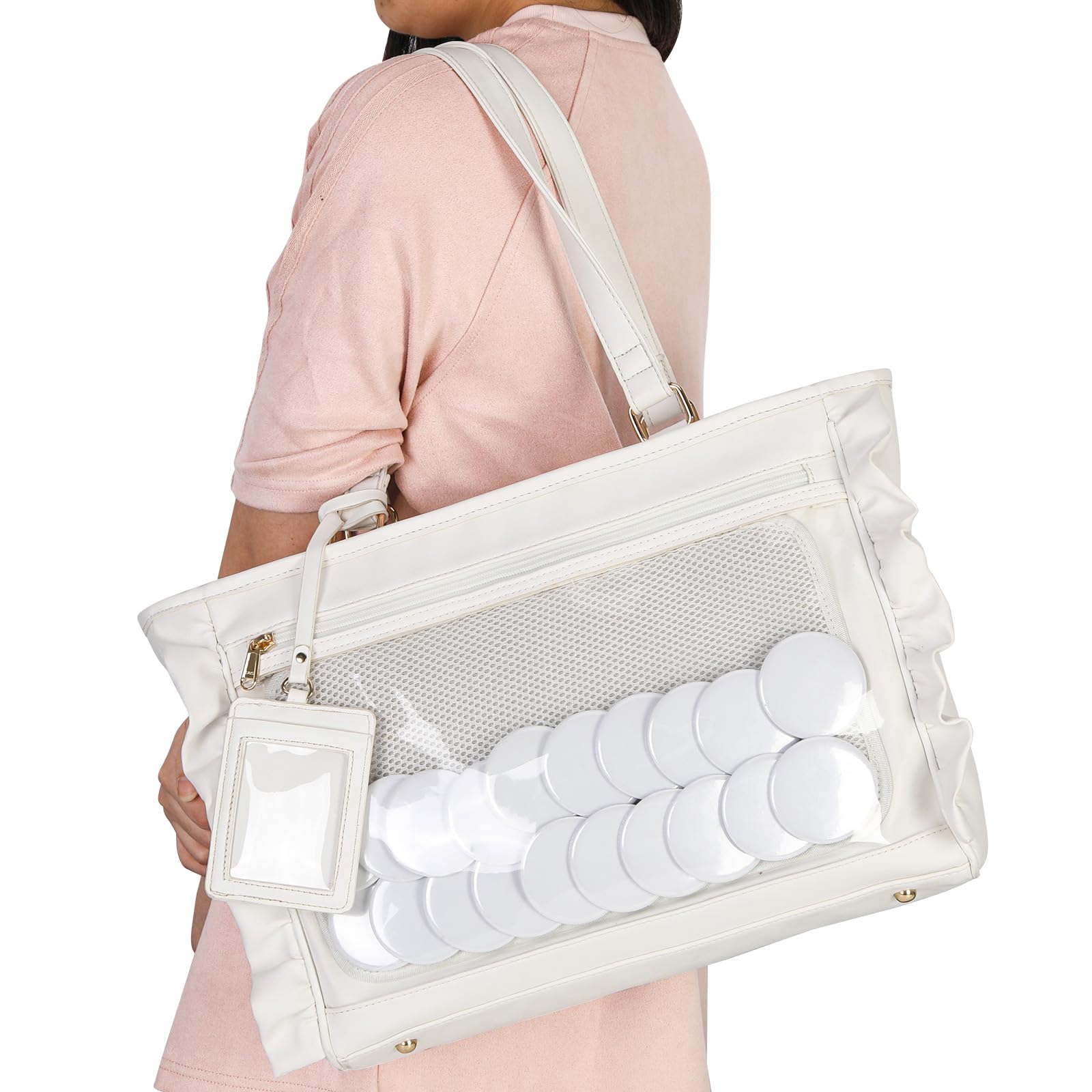 [NEWHEY] 痛バッグ 痛バ 大容量 大きい トートバッグ レディース フリル A3 A4 撥水 推し活バッグ うちわが入る デコバッグ メッシュデコシート付き 推し活 イベント オタ活 ホワイト