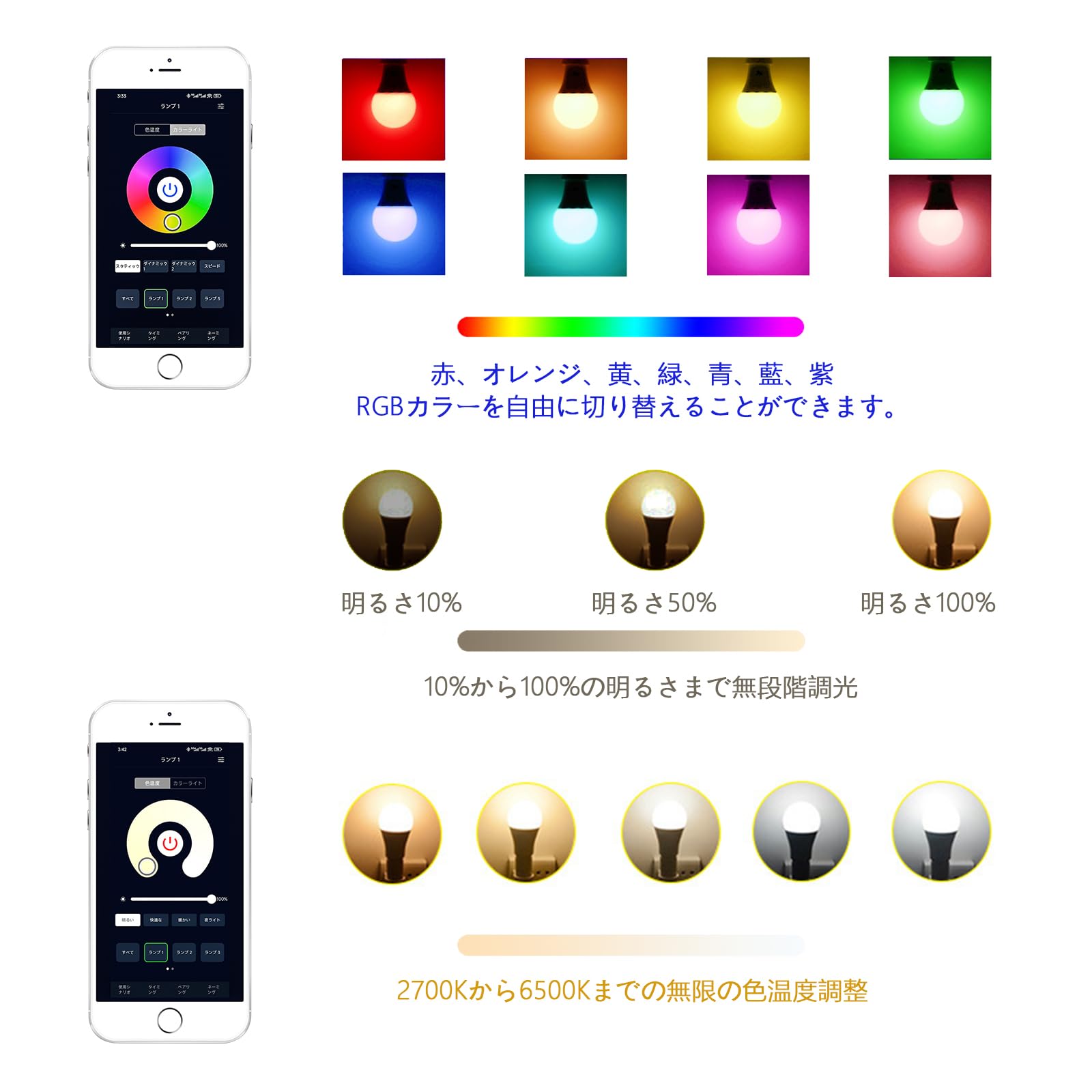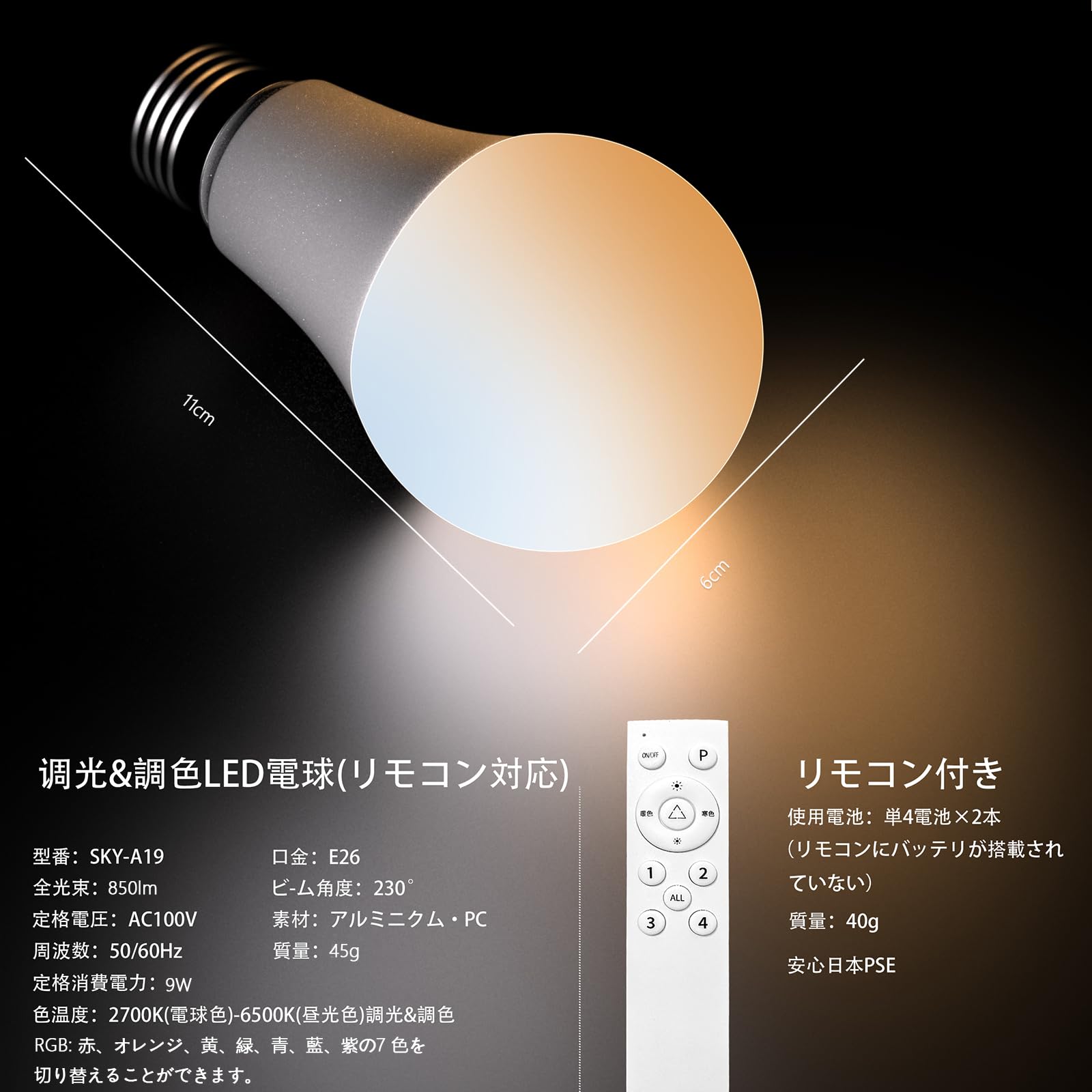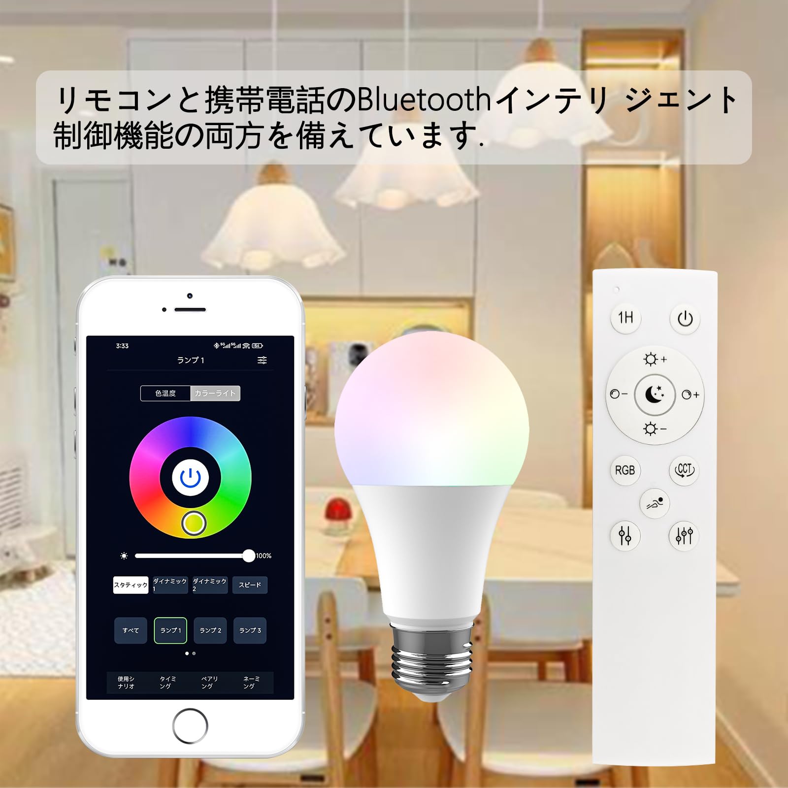 ●产品描述:●電球サイズ(cm):直径約6×高さ約11.3●リモコンサイズ(cm):縦15×横3.8×高さ1.5●金属バヨネットサイズ:E26●定格電力:9W 電球全体の明るさは通常の90W電球と同等です。●全光束:850lm●重量: 約47グラム●ビーム角:約230°●電源:100V(50/60Hz共用)●定格寿命:40,000時間●無極調光:暖色2700K~寒色6500K、任意に切り替え可能。明るさ10%~100%無段階調光。●RGB雰囲気ライト:赤、オレンジ、黄色、緑、シアン、青、紫、7色を自由に切り替えることができます●使用場所:屋内照明、ワークランプ、読書作業、リビングルーム、寝室照明