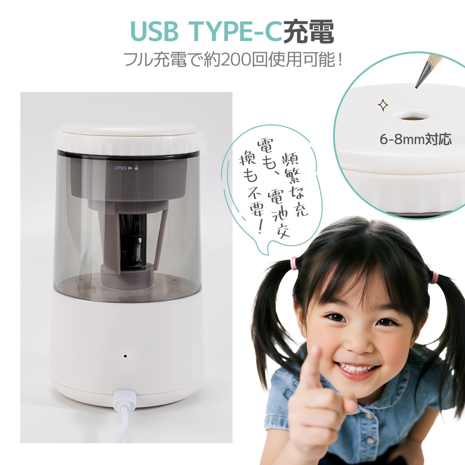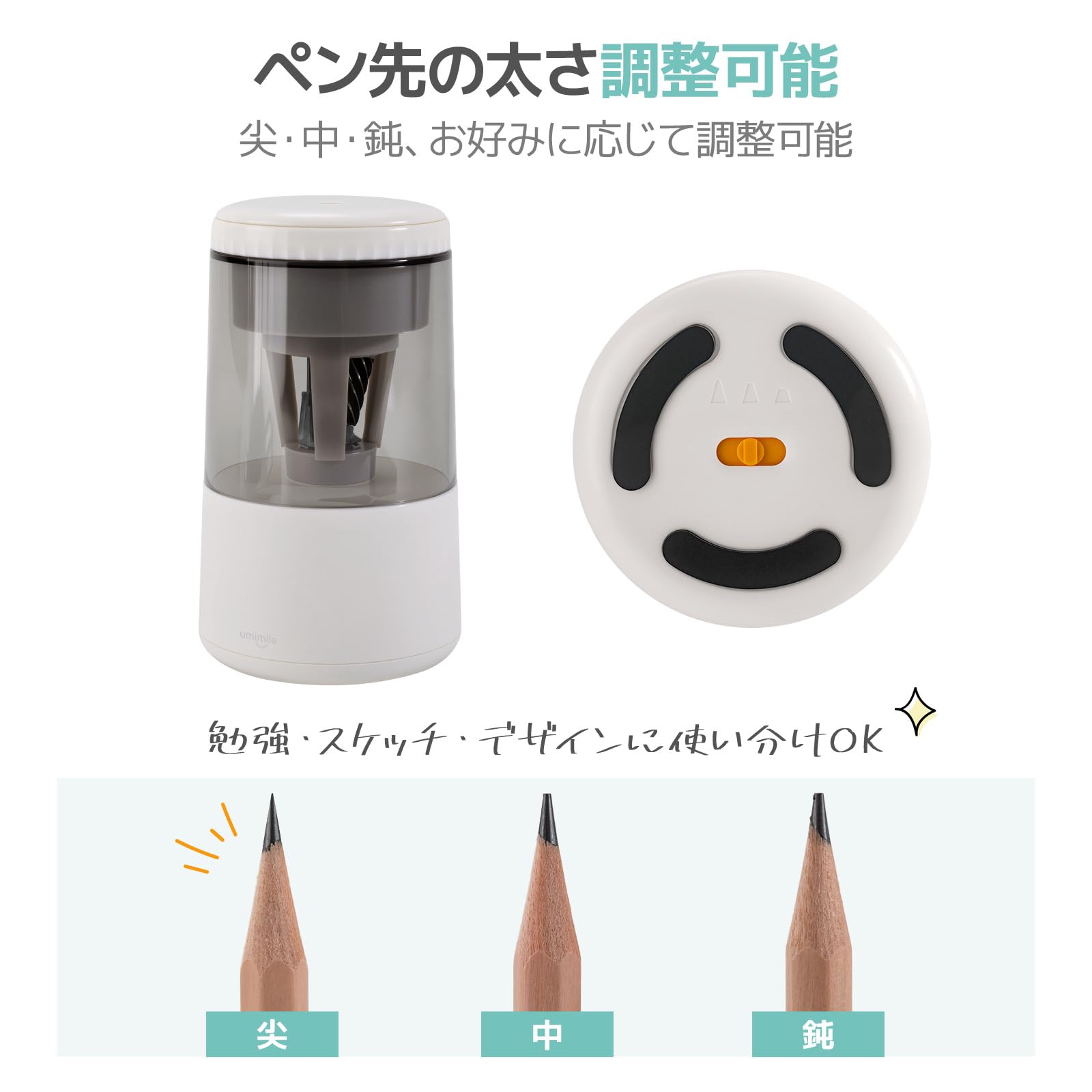 Umimile 電動鉛筆削り USB充電式 自動停止 シャープネス調整可能 コンパクト 6-8mm対応 子供用 家庭用 事務用 (ホワイト)
