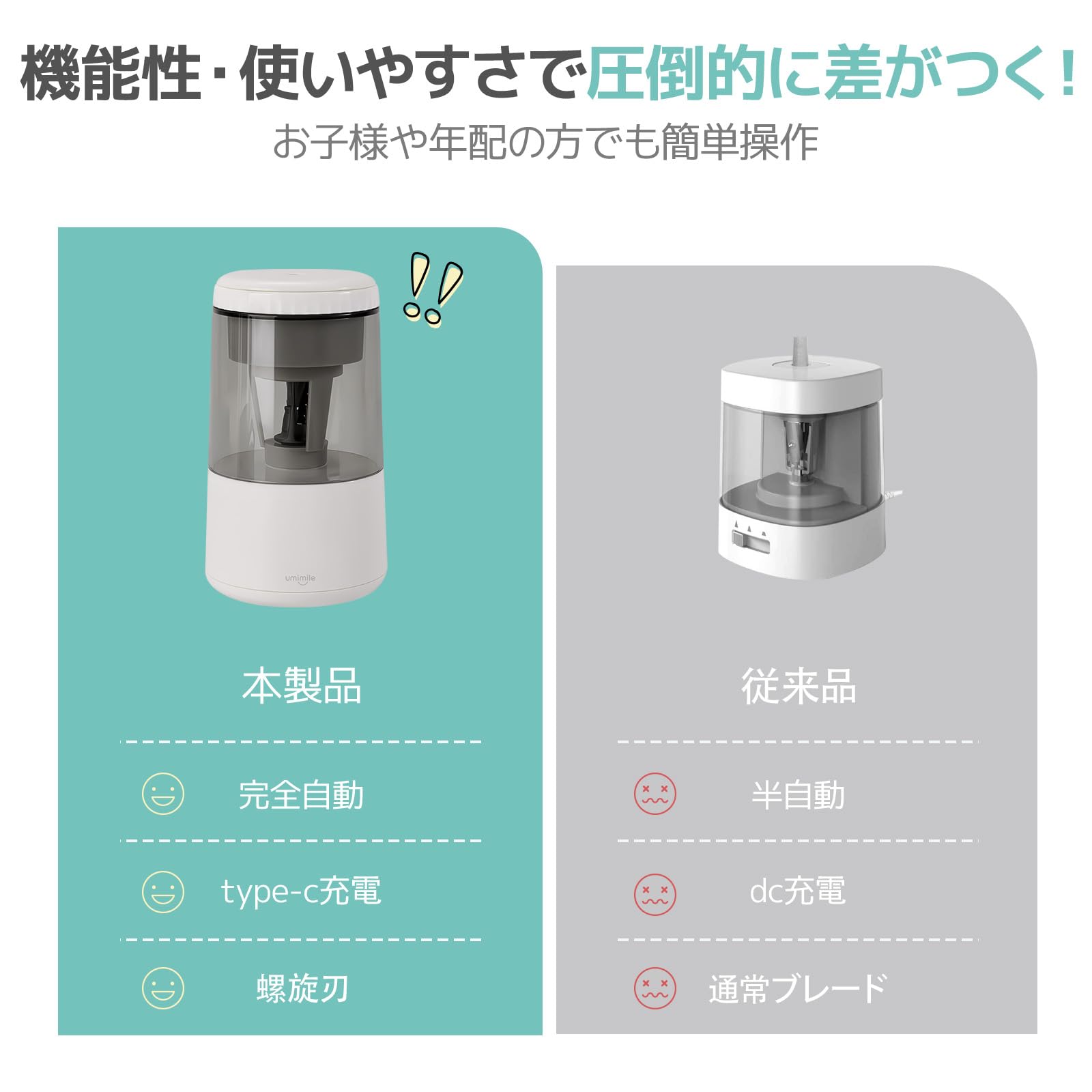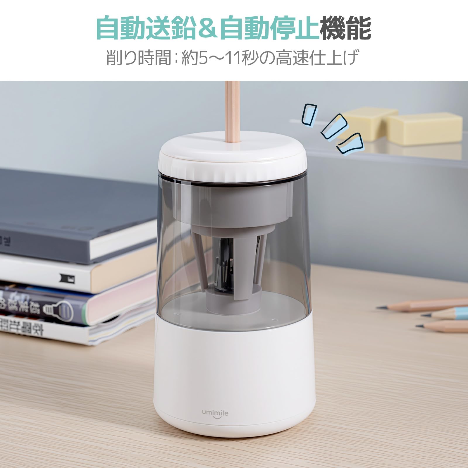 Umimile 鉛筆削り 電動 充電式 自動鉛筆削り 6-8mm鉛筆 3-5S高速切削 螺旋刃 コンパクト 使い易く 子供の贈り物 色鉛筆 デッサン 美術 (ホワイト)