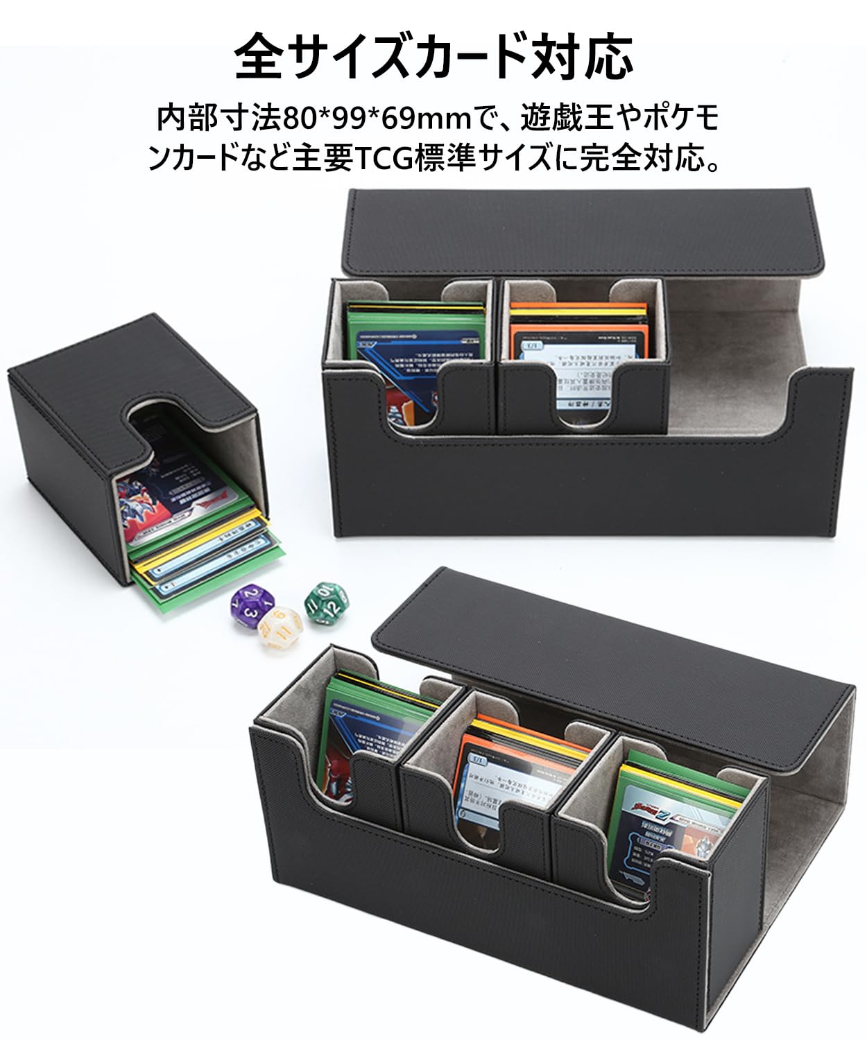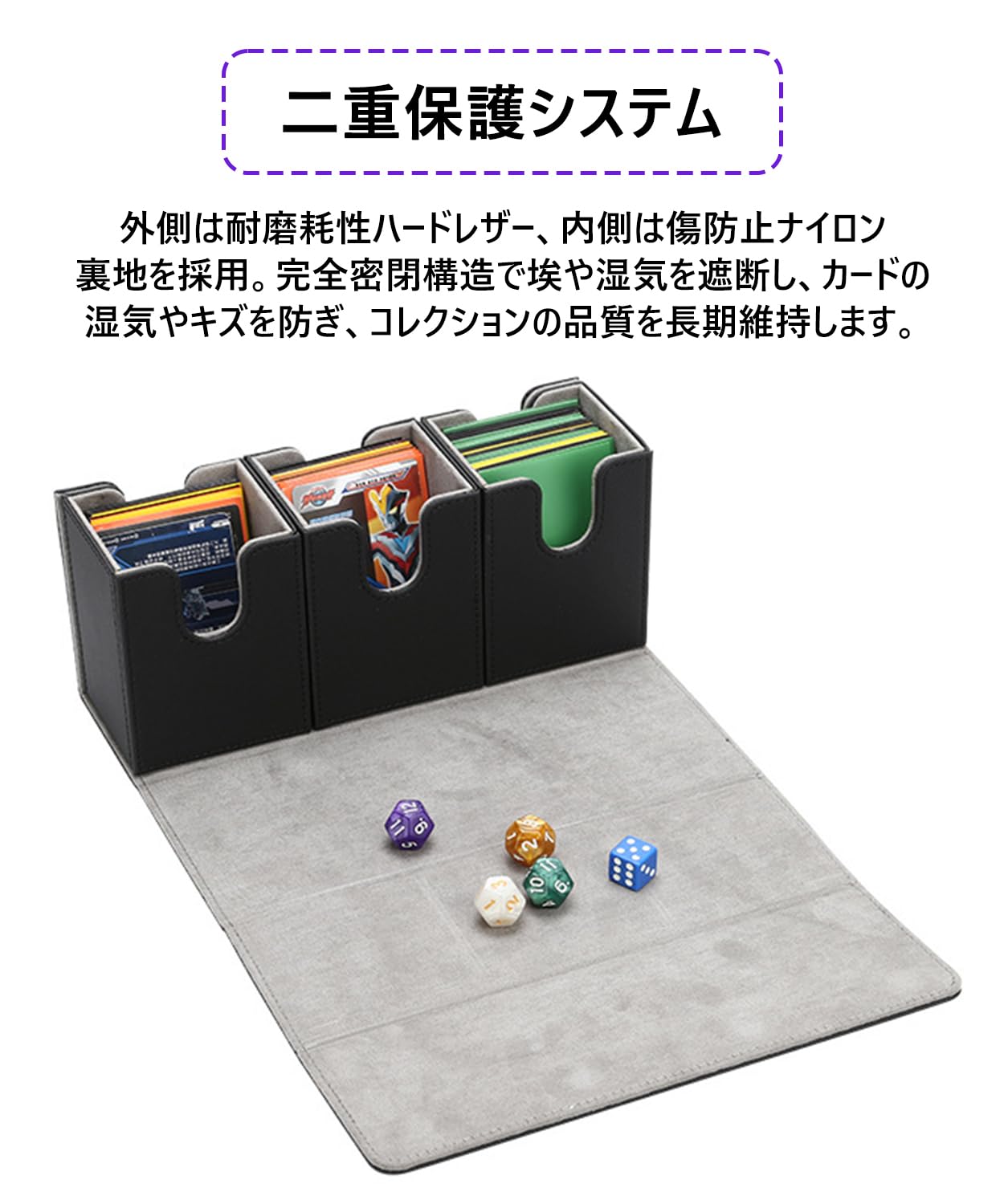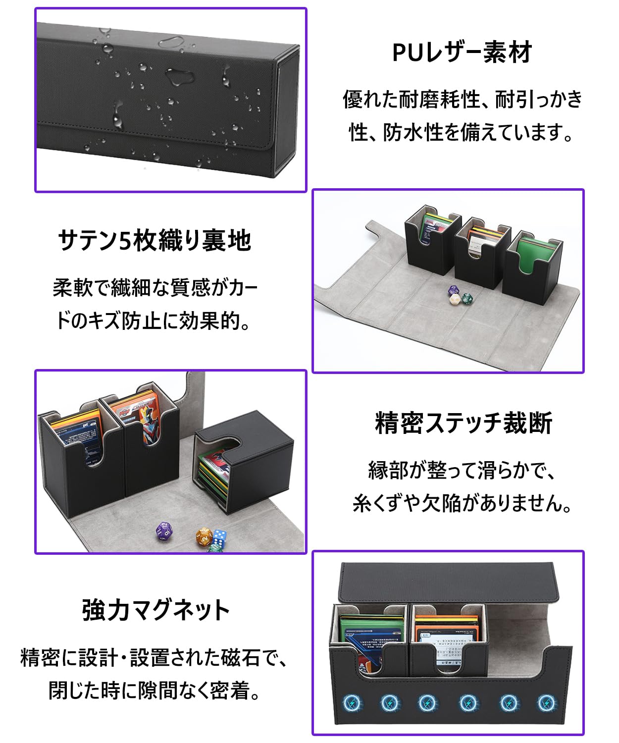 デッキケース トレカケース トップローダー収納 ダイス入れ プレマ マグネット PU レザー スリーブ対応 「 遊戯王 ポケモン デュエマ 各種 カードゲーム BOX 」 (黒(内装紫))