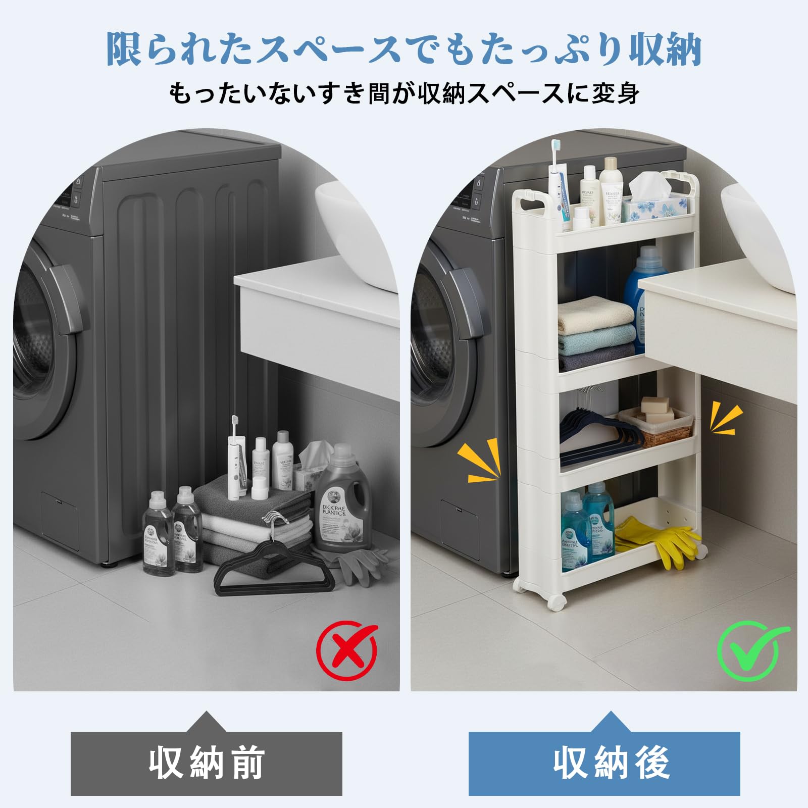 キッチンワゴン すきま収納 キャスター付き スリムワゴン 隙間収納 台所 洗面所 収納 ラック スリムラック ランドリー 収納棚 わごんキャスター付き ワゴン 細い棚 スリムストッカー 幅15cm 多機能 組立簡単 4段 冷蔵庫横